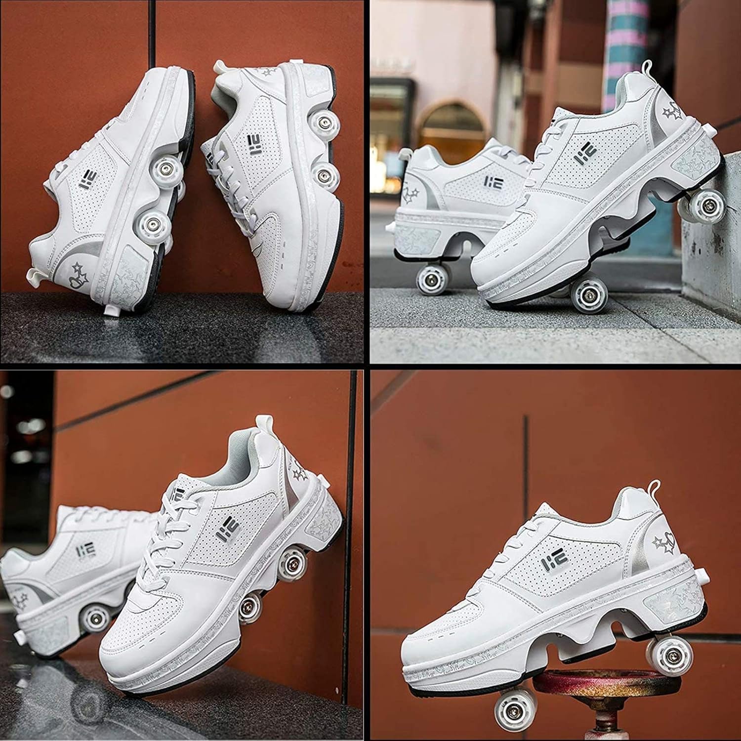★ MATERIALE DI ALTA QUALITÀ: tomaia e fodera della scarpa comode e traspiranti, suole resistenti all'usura, buona elasticità. Prestiamo attenzione non solo alla capacità di carico delle ruote, ma anche alla scelta del materiale della tomaia. ★ PATTINI A RULLO 2 IN1: puoi sollevare e nascondere il rullo premendo un pulsante sul tallone. Quindi puoi usare sia scarpe da pattini a rotelle che normali scarpe sportive. ★ RESISTENZA ALLO SCIVOLAMENTO: buona presa dei pattini che migliora la capacità antiscivolo del pneumatico imitando la funzione a dente di sega del rullo. ★ ADATTO A VARIE OCCASIONI: viaggi di vacanza, attività all'aperto, uscita di un ospite, studio universitario, pattinaggio, festa, discoteca, festa di compleanno. ★ REGALO SPECIALE: i pattini a rotelle di deformazione sono anche uno degli sport ricreativi più tradizionali, nei fine settimana puoi giocare con i tuoi amici o bambini o regalarli come regalo di Natale.