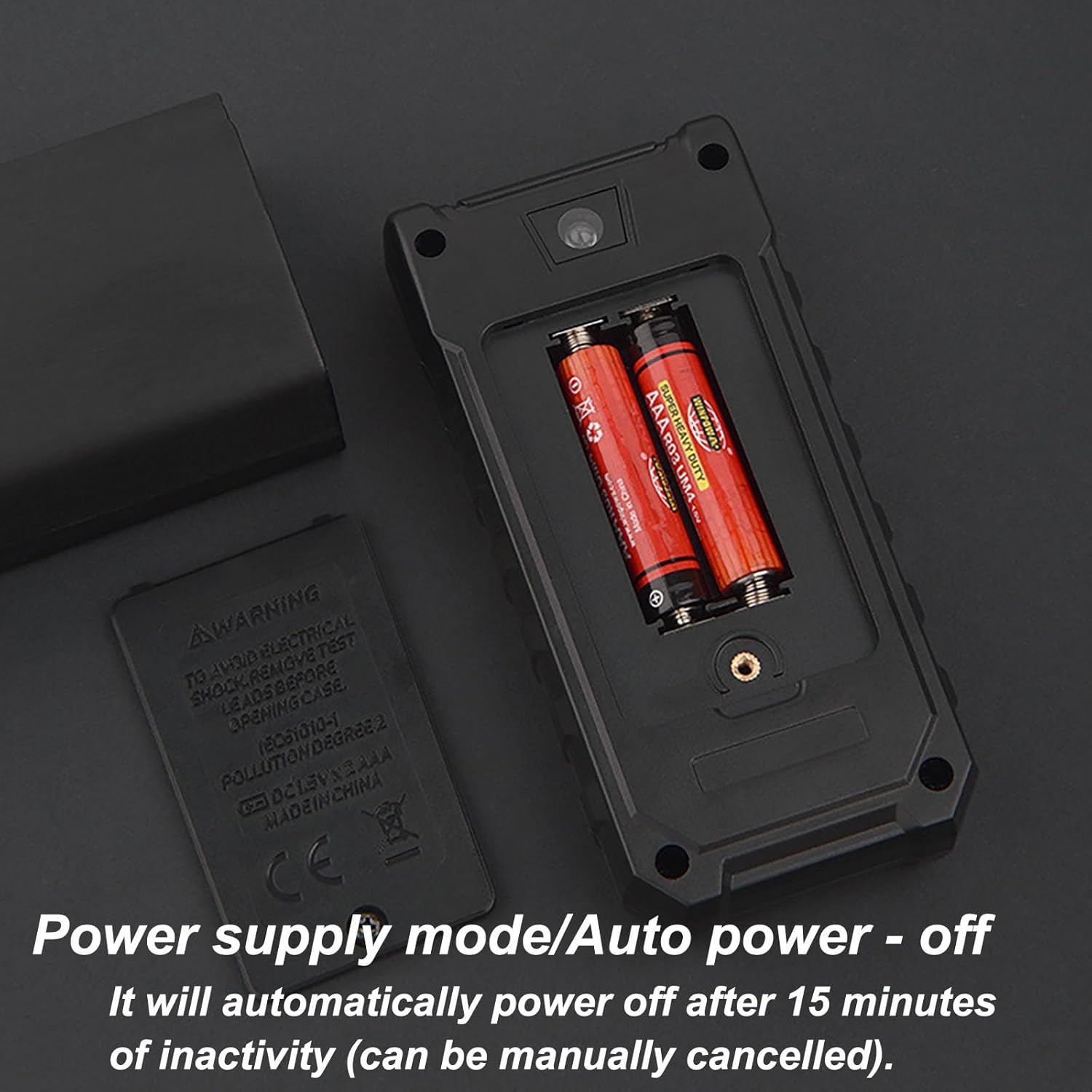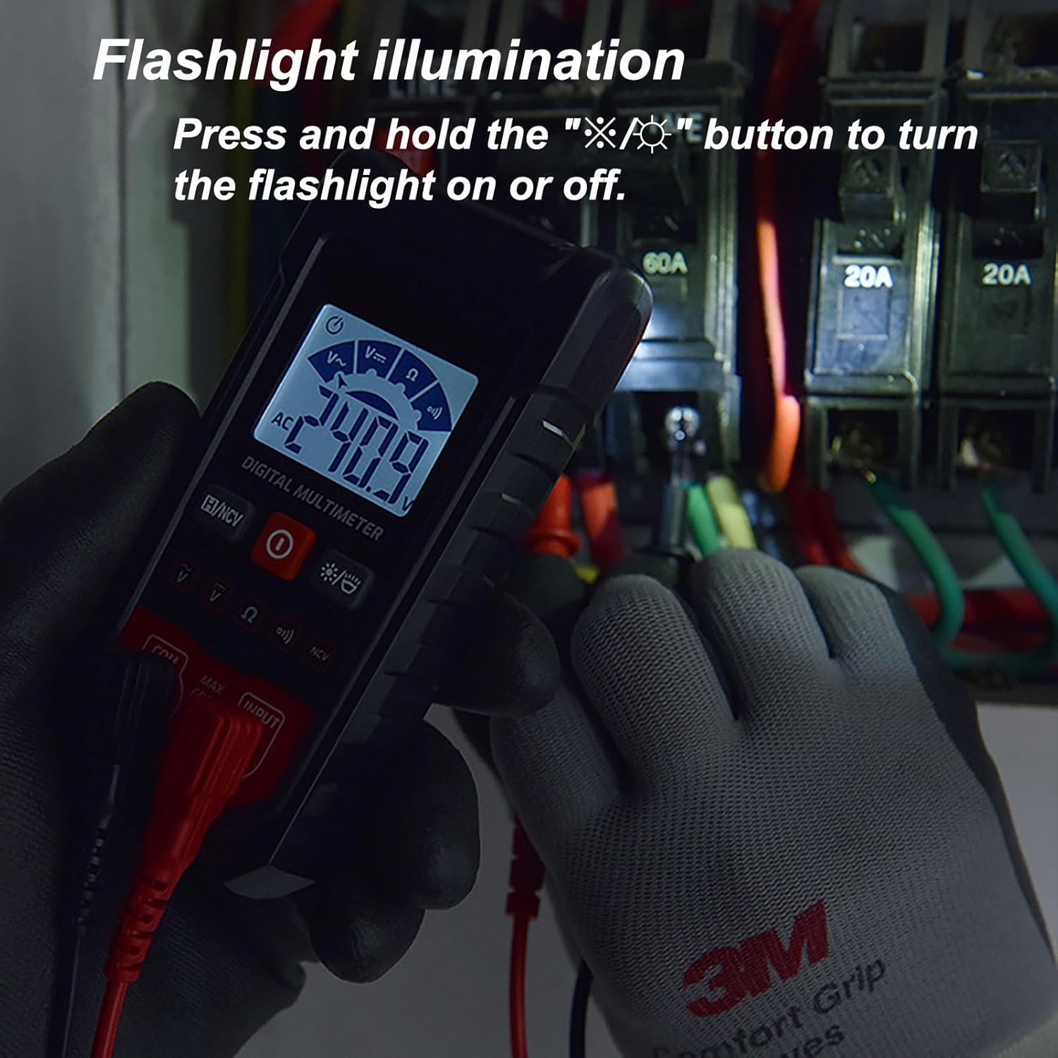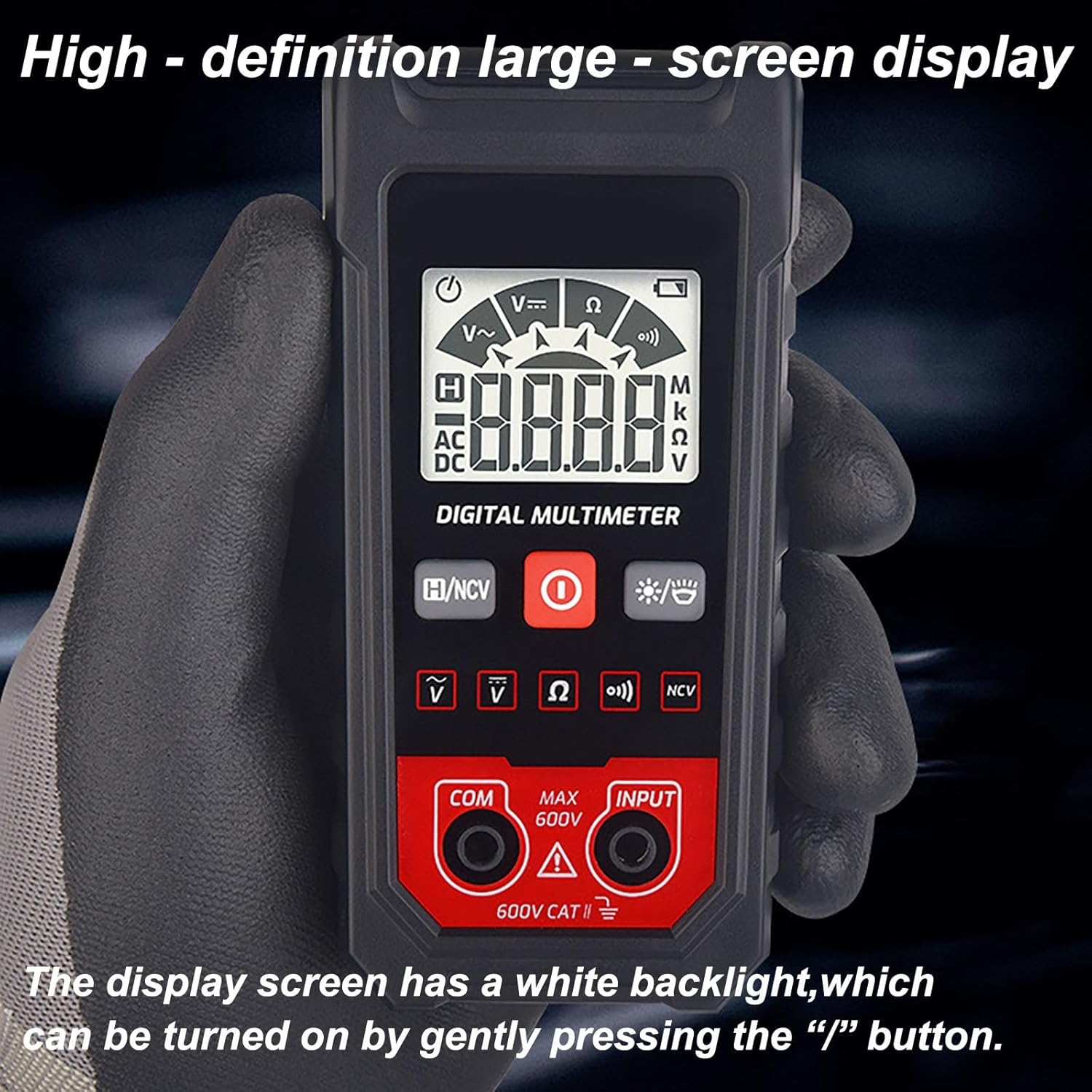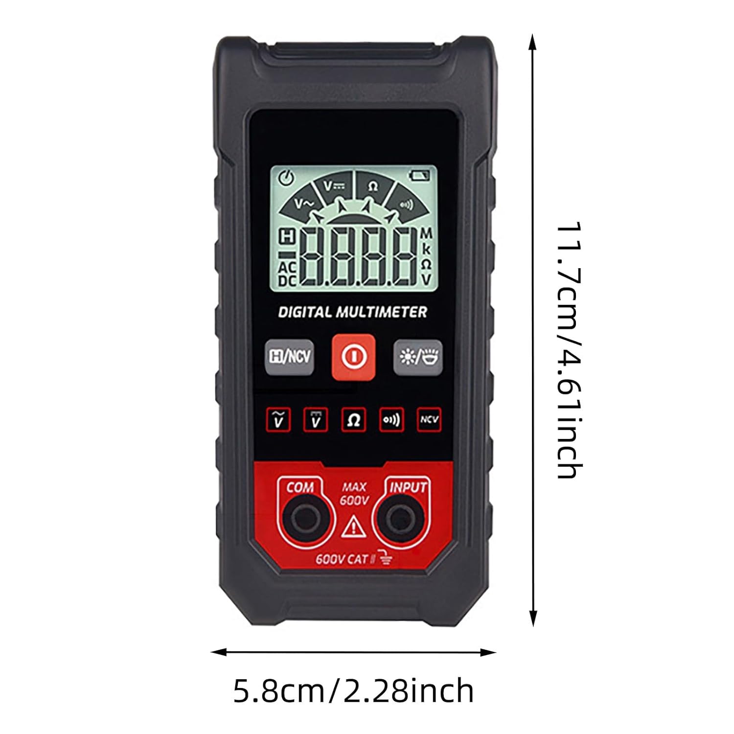 Riconoscimento automatico: il multimetro passa automaticamente tra AC/tensione, resistenza e test di continuità all'accensione, garantendo un'esperienza utente di problemi per varie attività elettriche. Misurazione AC e tensione: sonde rosse e nere Live/fili neutri e il display visualizza automaticamente il valore di tensione CA. Quando sonde terminali positivo/negativo della batteria, viene visualizzato il valore di tensione. Misurazione della resistenza e test di continuità: sonde rosse e nere, le estremità del resistore o del circuito e il display visualizza la resistenza. La continuità prova un suono di allarme per i circuiti collegati e rimane silenzioso quando il circuito è aperto. Schermo grande: lo schermo da 33 mm x 25 mm ha una retroilluminazione bianca brillante che può essere attivata con una pressione. Lungo attiva la torcia integrata per una maggiore visibilità in ambienti bui. Spegnimento automatico: alimentato da due batterie AA, il multimetro si spegne automaticamente dopo 15 minuti di inattività alla batteria. Questa funzione può essere disabilitata per un uso prolungato.