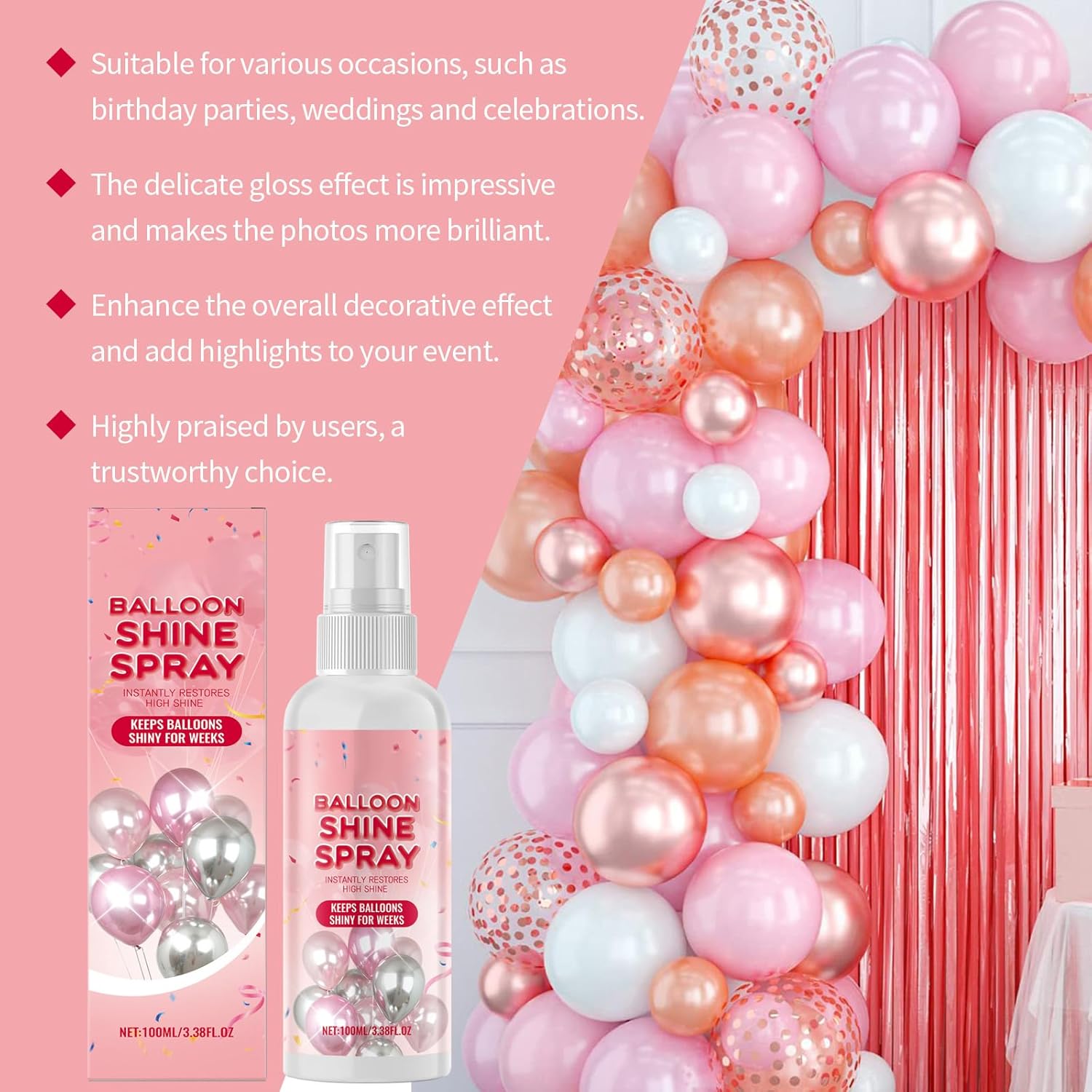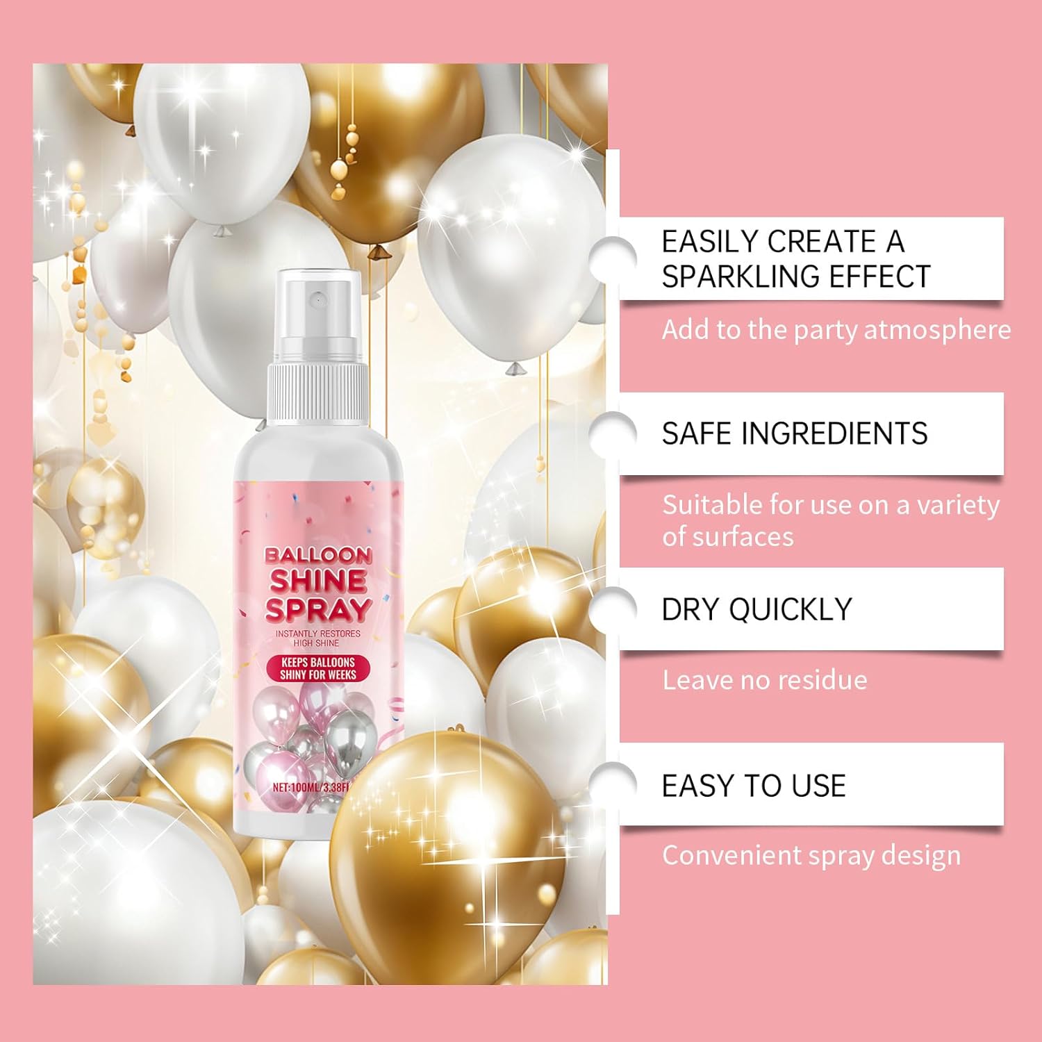 Migliora la tua festa con questo accessorio decorativo, assicurandoti che ogni evento sia ricordo con i suoi bagliori Questo flacone spray da 100 ml è realizzato per comodità, presenta un design facile da usare che garantisce un lungo periodo di brillantezza per qualsiasi celebrazione Per gli appassionati di feste che amano partecipare a eventi e celebrazioni, questo spruzzatore aggiunge eleganza al tuo look Palloncino unico effetto brillante con il nostro spruzzatore brillante a palloncino da 100 ml, disegni per distinguersi di notte e migliorare le atmosfere della tua festa Per discoteche, feste di compleanno, matrimoni e varie occasioni, porta una scintilla distinta alle tue feste