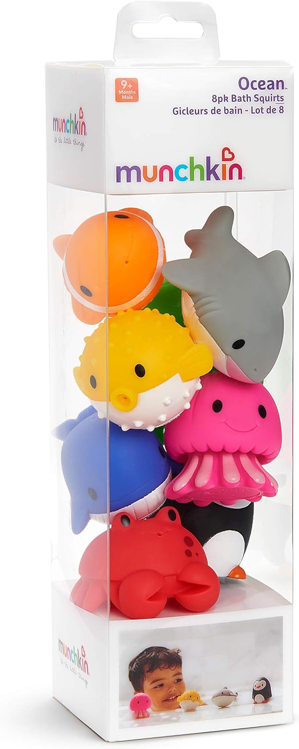 Confezione da 8 creature marine che schizzano e galleggiano sull'acqua. Impara l'azione e la reazione incoraggiando il gioco fantasioso. Perfetto per bolle subacquee e giochi da vasca. Include scatola di latta trasparente, perfetta per riporre e regalare. Dai 9 mesi in su