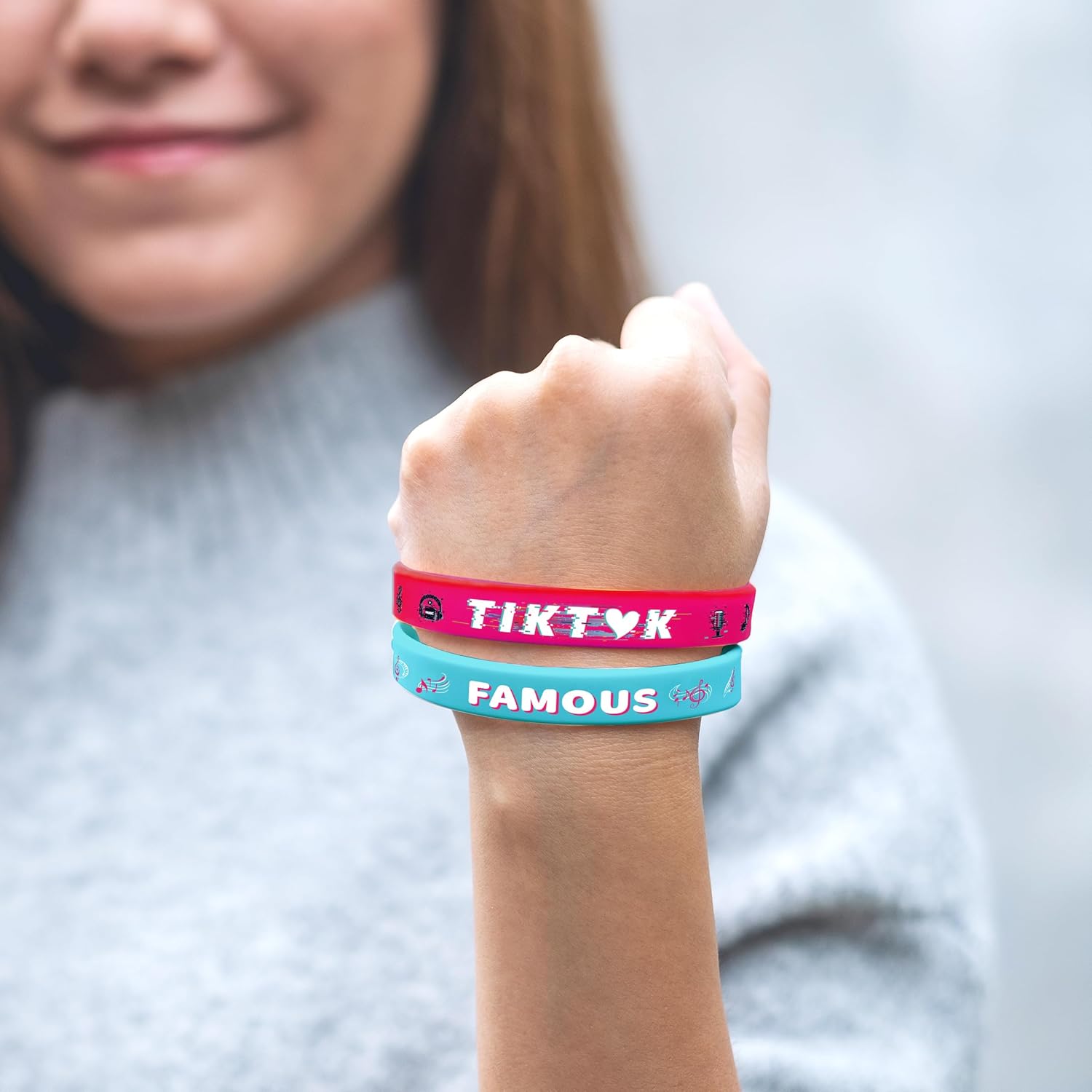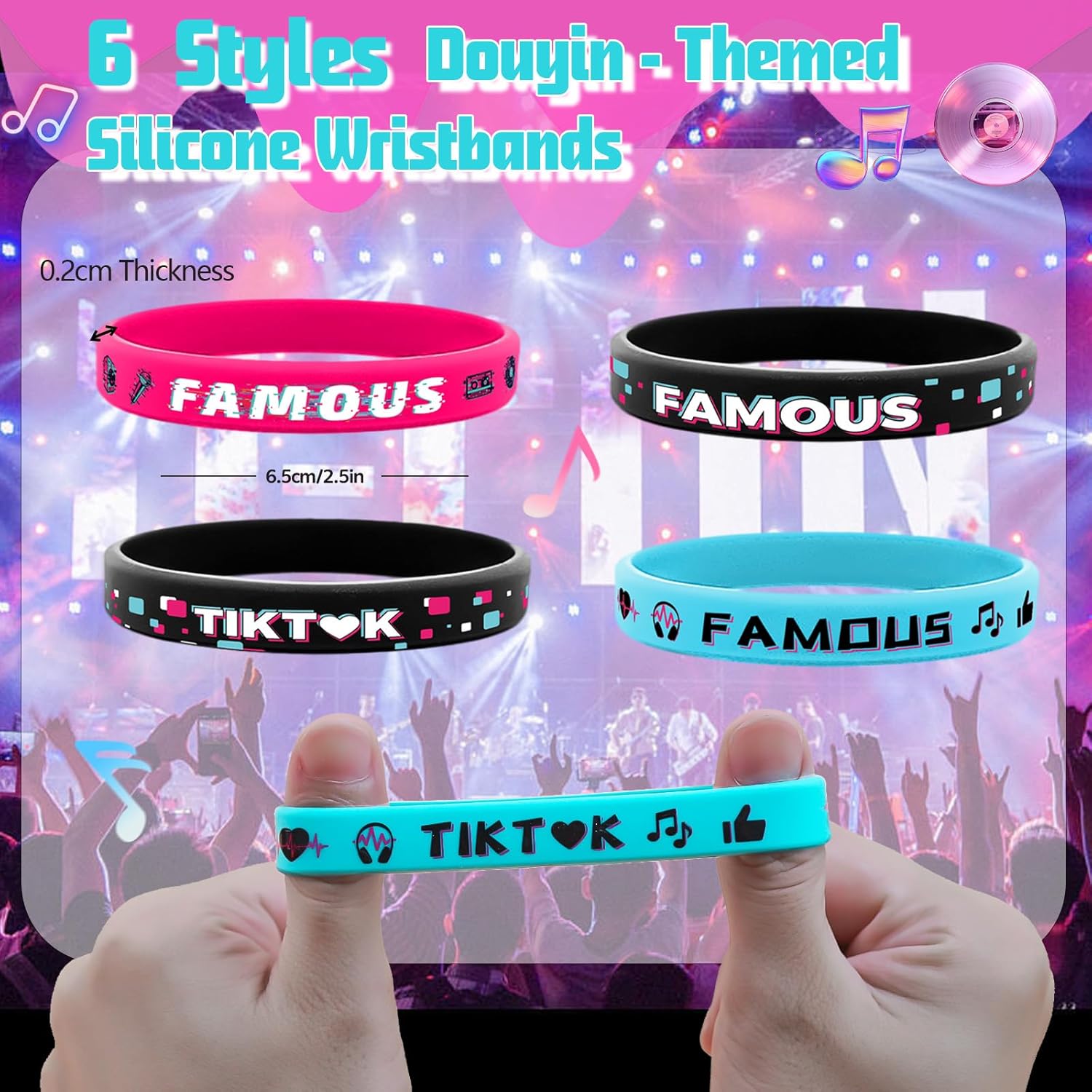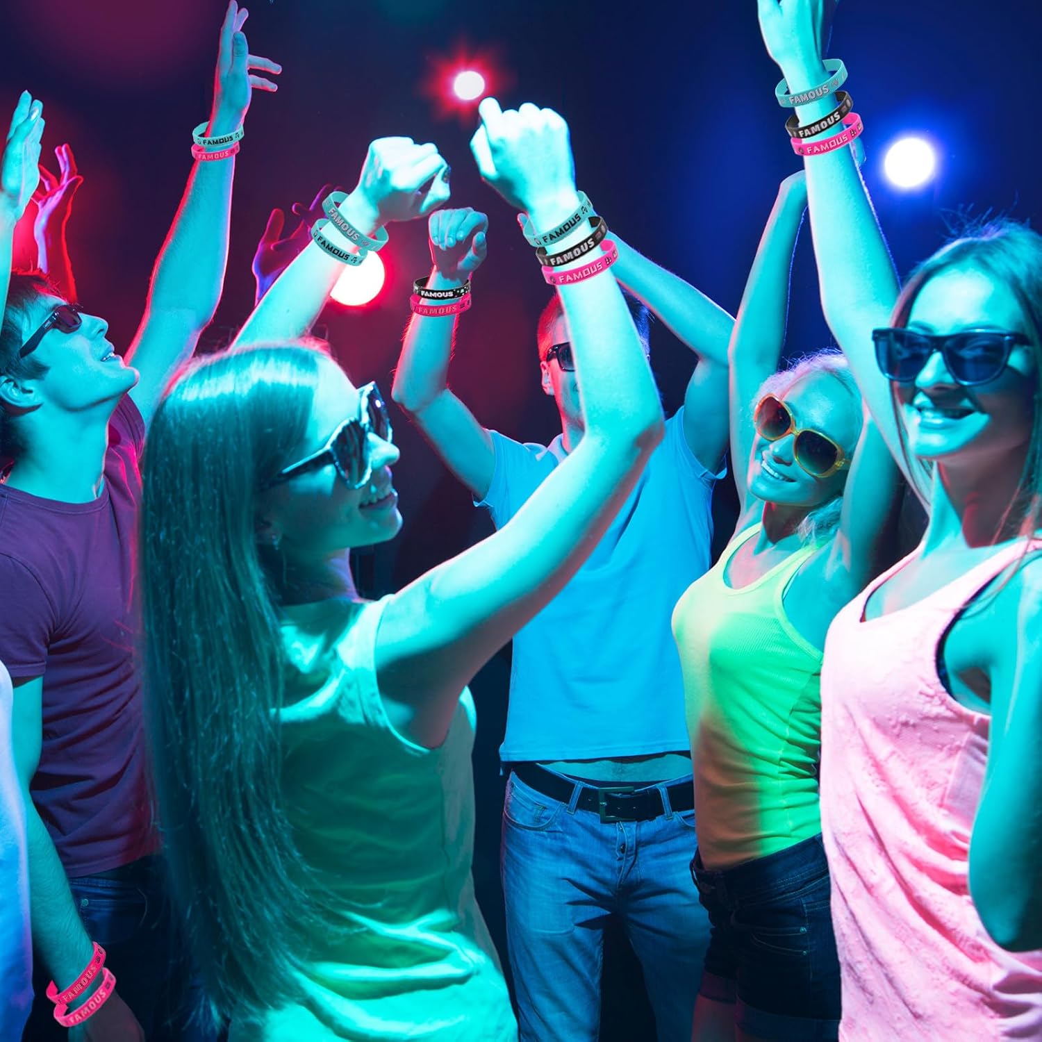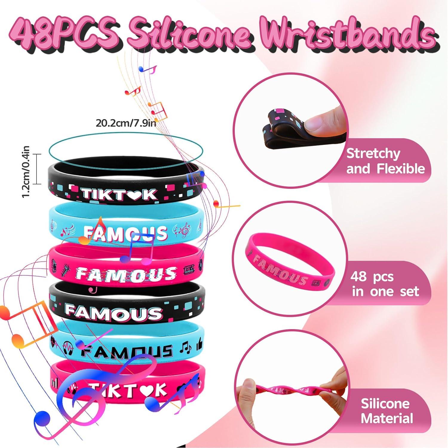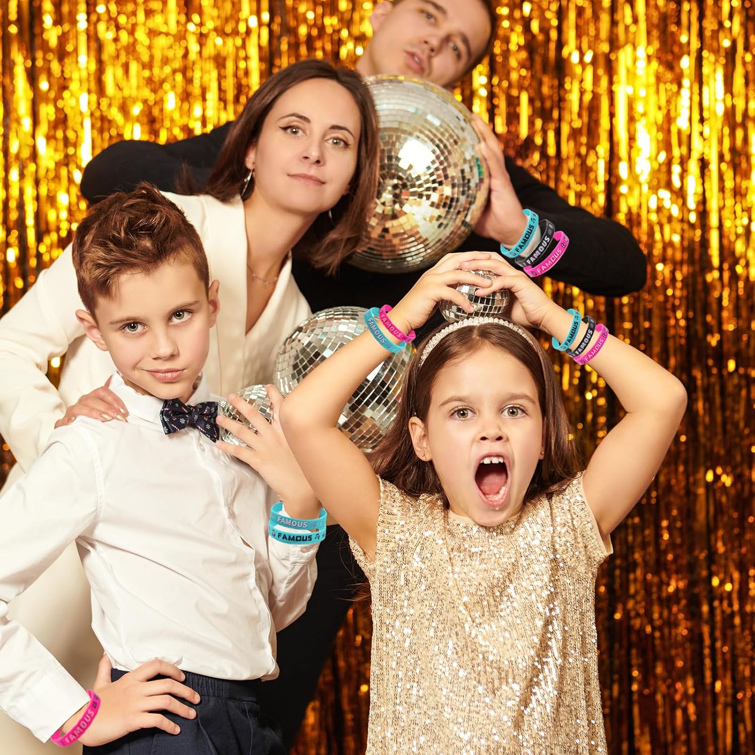 Came just like the picture. We got pink, black and blue colors. They are light weight, rubber band bracelets. They have little microphones and music notes. They say famous. Perfect addition to the goodie bag for our 10 year old karaoke birthday party.