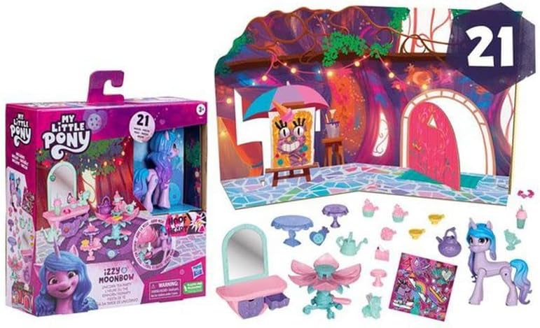 DIZZY CUTTY MARK DA INSERIRE: Il pony viola da 7,5 cm ha una criniera blu come nella serie My Little Pony: Let's Make a Mark. Include un ciondolo che assomiglia a un pulsante a forma di cuore L'ORA DEL TÈ: organizza l'ora del tè con Izzy utilizzando tutti i 20 pezzi, tra cui una teiera, tazze da tè, torta di unicorno e altro ancora. Include una toletta con cassetti apribili per riporre gli oggetti. ACCESSORI: l'action figure di Izzy viene fornita con accessori da inserire nello zoccolo! Puoi posizionarlo per immaginare che serva tè o cupcakes. TAVOLO: Include un tavolo a forma di fiore. Puoi premere la scarpa di Izzy sul pedale per aprire il tavolo, quindi decorarlo con gli accessori DECORAZIONI E ADESIVI: apri la scena di carta per decorarla con gli adesivi e poi usarla come decorazione della stanza. Un grande regalo per ragazze e ragazzi. Dai 3 anni