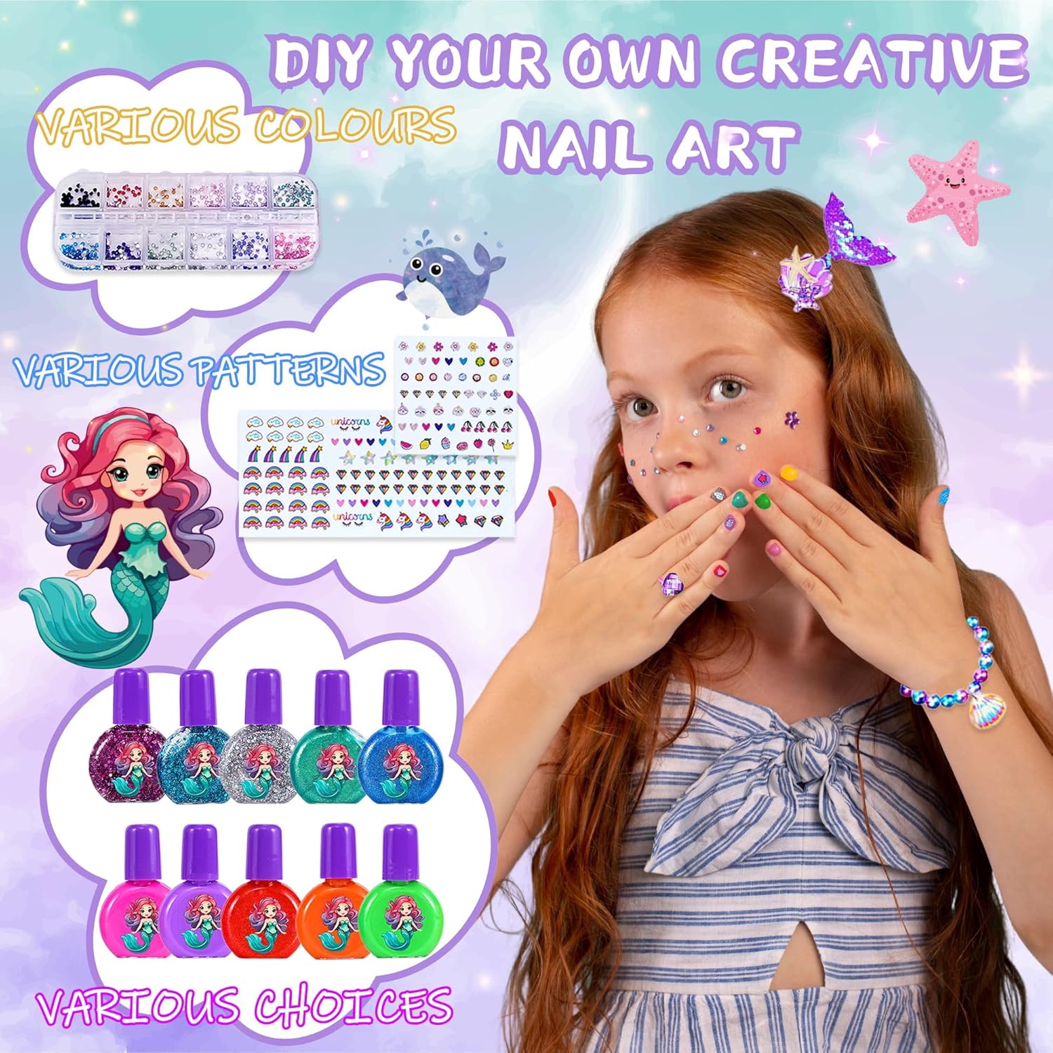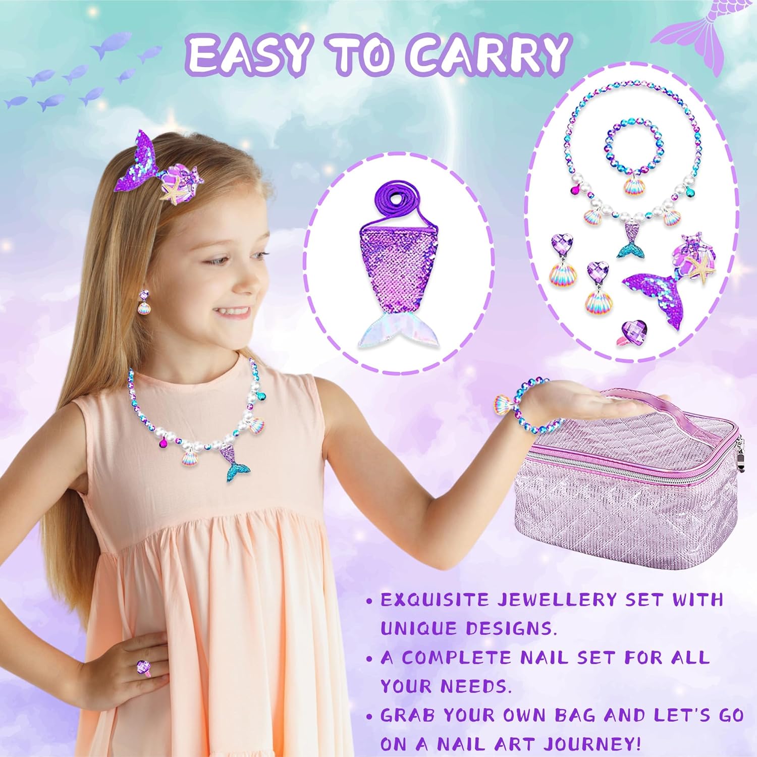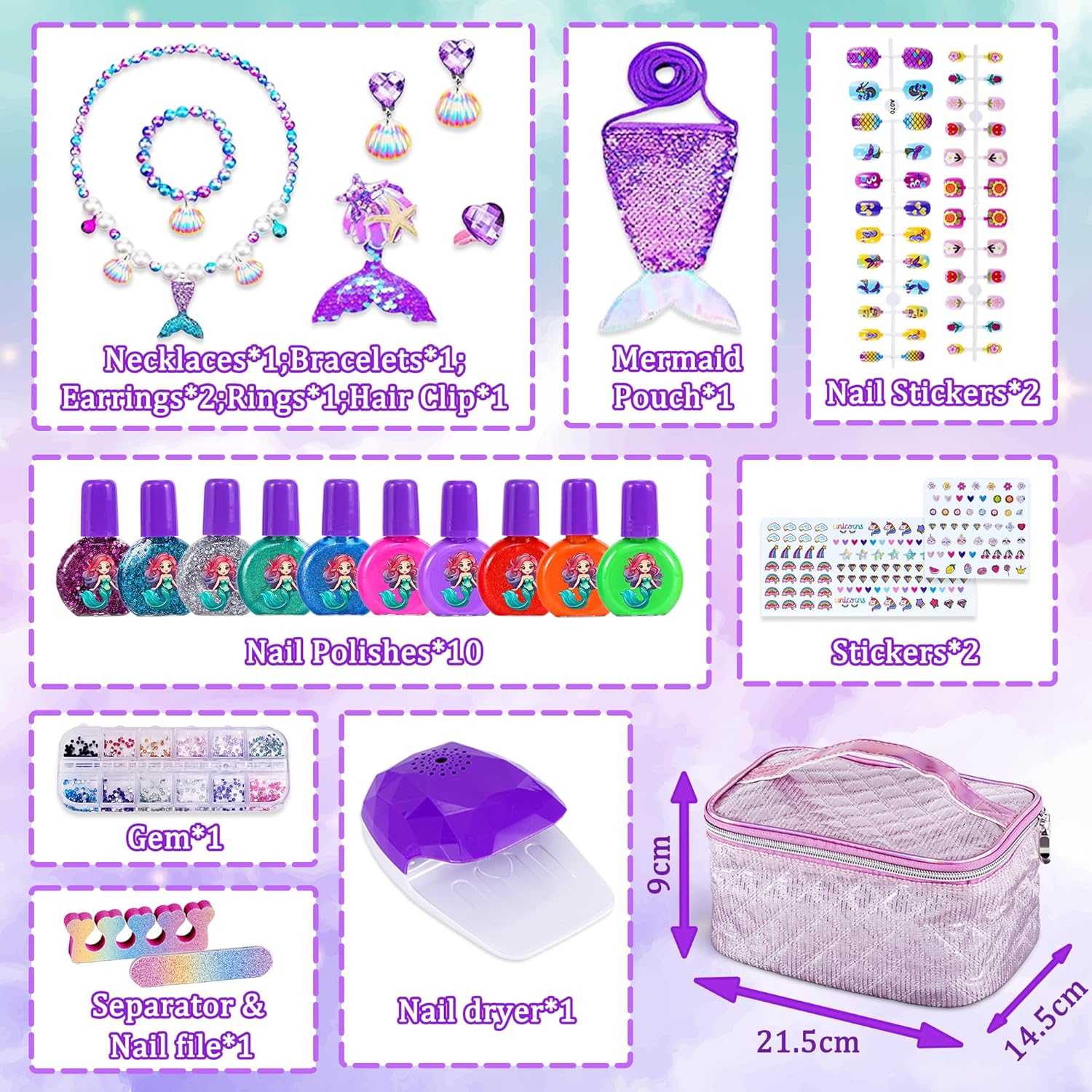 SALONE PER UNGHIE PER RAGAZZE: Il set per unghie per bambini include smalto per sirena*10, cerotto per unghie*2, asciuga unghie*1, adesivo*2, lima per unghie*1, separatore*1, una scatola di piccoli diamanti, borsa a sirena*1, fermagli per capelli*1, braccialetto*1, collana*1, orecchini a clip*2, anello*1, così la tua piccola principessa potrà godersi al massimo la nail art! INGREDIENTI SICURI: Il nostro smalto per unghie è costituito da una formula atossica e sicura appositamente progettata per le unghie delicate e la pelle sensibile dei bambini, quindi non devi preoccuparti dell'irritazione della pelle. Con l'asciuga unghie, i bambini possono lasciare asciugare rapidamente le unghie dipinte e godersi una divertente esperienza di nail art! DESIGN UNICO: esclusivo set per unghie in stile sirena, gioielli a sirena e una varietà di accessori scintillanti consentono ai bambini di liberare la loro immaginazione e creatività nella nail art, creare nail art uniche e personalizzate e sperimentare il proprio salone di bellezza! FACILE DA USARE E RIMUOVERE: lo smalto per bambini dai 3 anni in su è sicuro da usare, facile da staccare e non danneggia le unghie. I bambini possono rimuovere facilmente lo smalto senza solvente senza essere esposti a sostanze chimiche potenzialmente dannose, rendendo il processo di nail art facile e sicuro. OTTIMO REGALO PER PRINCIPESSE: questo set di smalti per bambini è il regalo perfetto che ogni piccola principessa sogna! Che si tratti di compleanni, Natale, vacanze, feste, feste in maschera, eventi scolastici o Halloween, è l'ideale per i bambini per rendere le loro celebrazioni più scintillanti e commoventi!