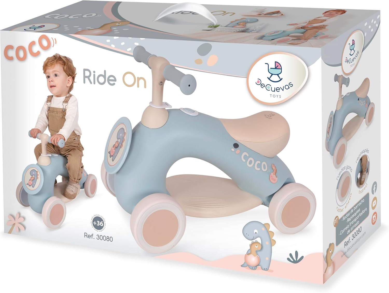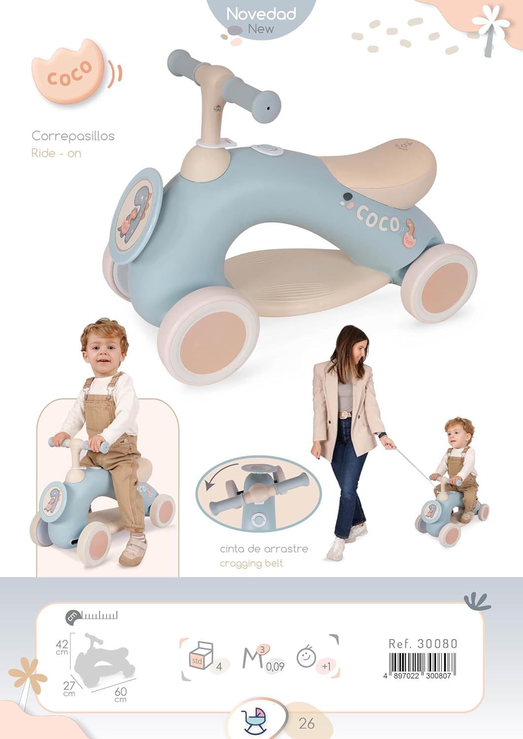 Veicolo per bambini con design e dimensioni ideali per i più piccoli. Veicolo nel design speciale della linea Coco. Il trasportino è alto 60 cm, largo 27 cm e lungo 42 cm. Include cinghia da tirare per adulti. Costruzione leggera e molto stabile.