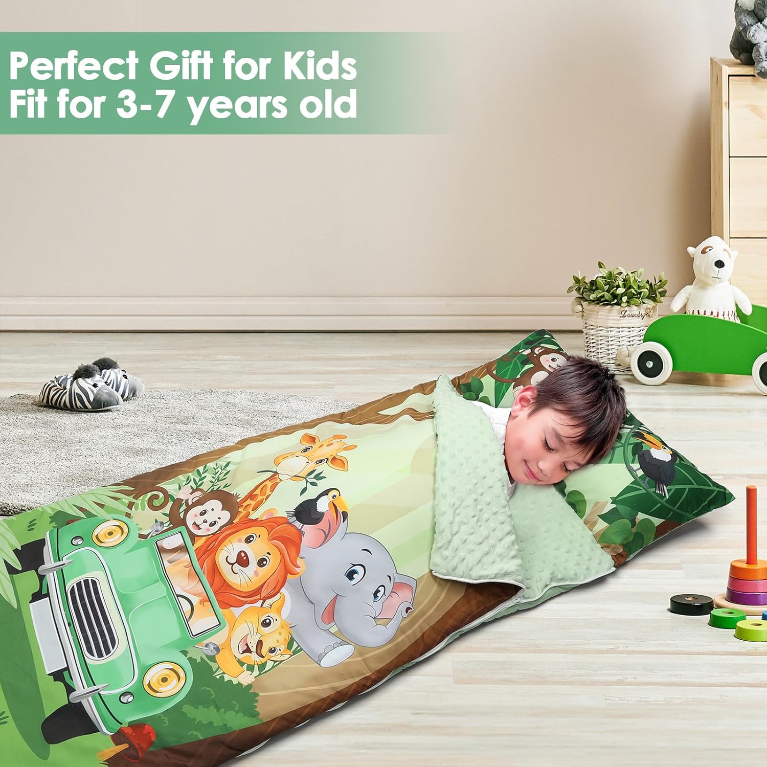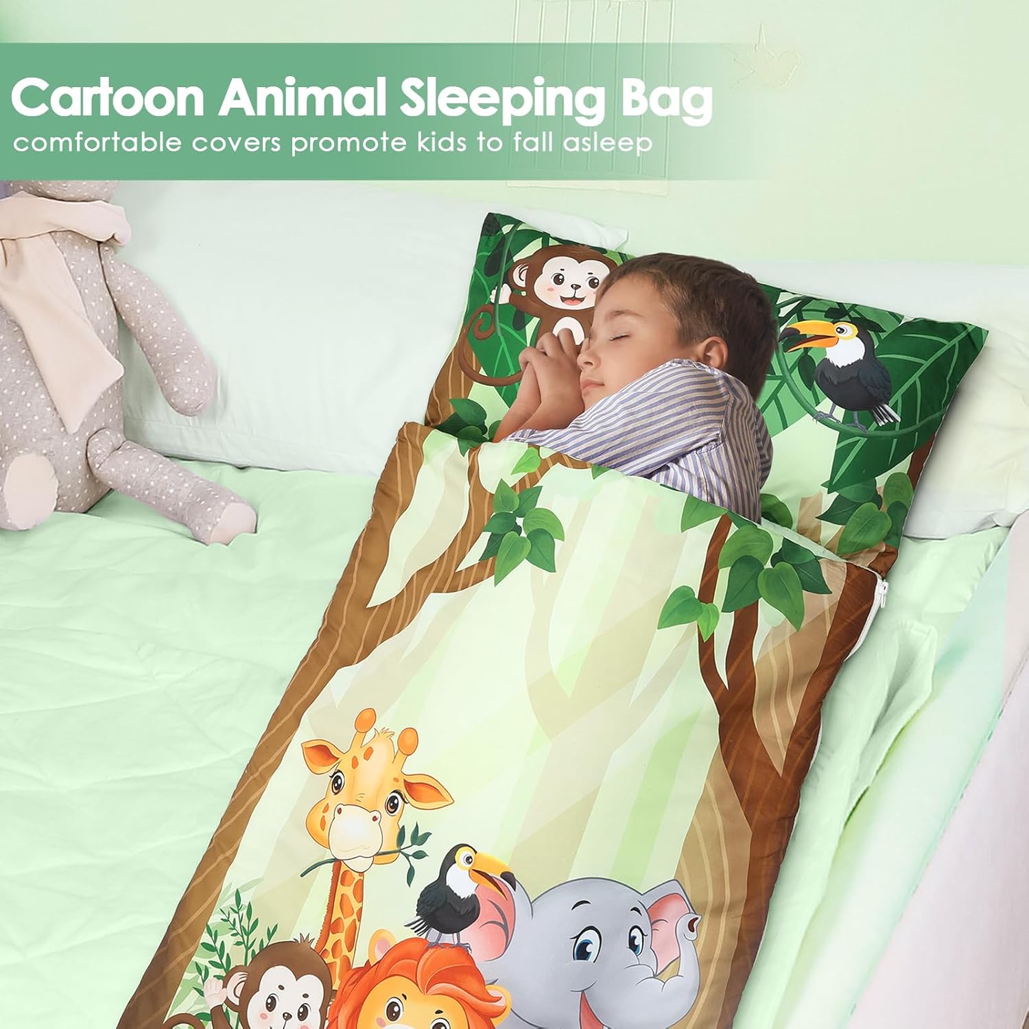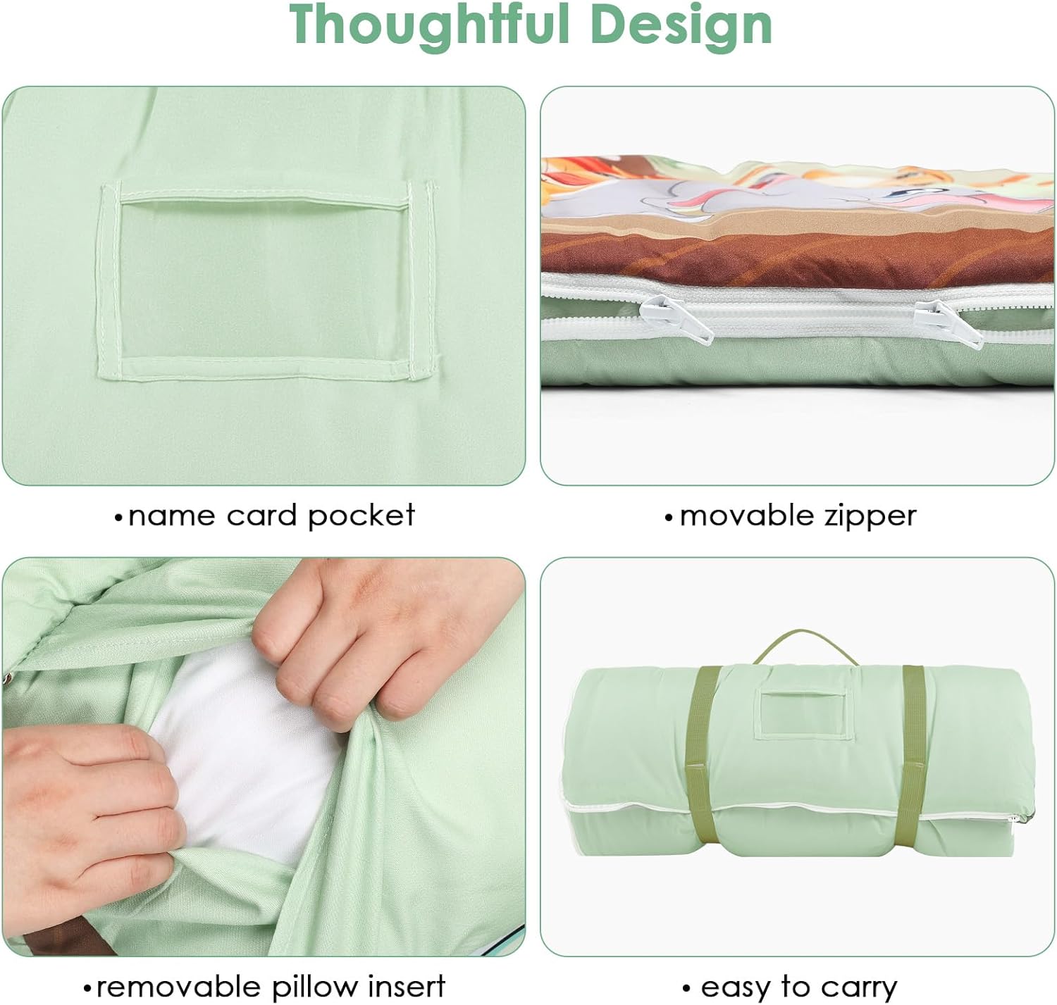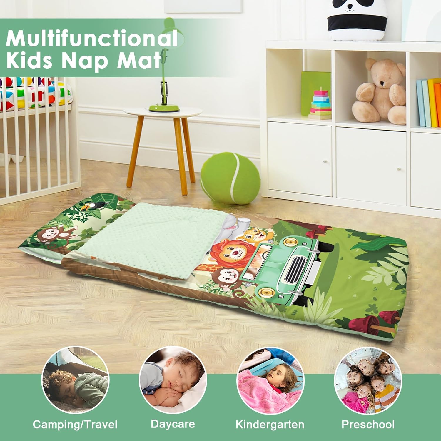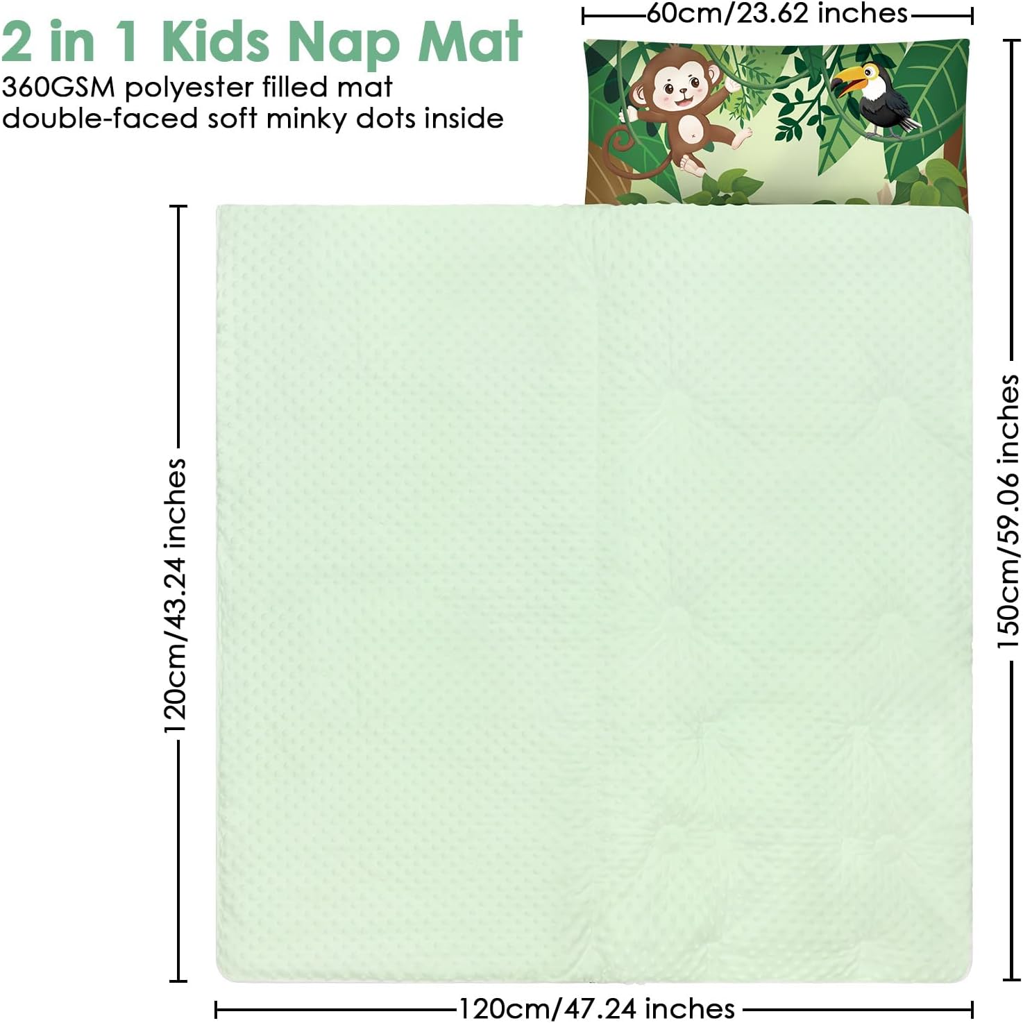 1. Alta Qualità: I nostri toddler nap mat con cuscino e coperta per bambini sono realizzati in polistero di alta qualità e con una fodera interna in minky dot, che crea un ambiente di sonno caldo, confortevole, morbidissimo e tranquillo per il vostro bambino, delicato con la sua pelle. 2. Design Unico: Il sacco nanna adotta un design a doppia cerniera di tipo L, il lato destro e il fondo della doppia cerniera, il fondo della cerniera può essere aperto separatamente, comodo da regolare in base alle esigenze del bambino per dormire in modo più confortevole e regolare. Il cuscino è rimovibile, rendendo il sacco nanna facilmente lavabile. 3. Dimensioni e Spessore Adatti: Il nostro tappetino per pelo è di 150×60cm a grandezza naturale; la trapunta del materasso è riempita con da 360 gsm e la copertura è di 80 gsm.Le grandi dimensioni e il peso addensato sono molto adatti per il sonnellino dei bambini, portando loro un'esperienza di sonno indimenticabile. 4. Portatile e Facile da Pulire: Il tappetino per pisolino è dotato di cinghie in velcro e maniglie, che possono essere facilmente arrotolate e sollevate, molto comode da trasportare; con una fessura trasparente per il nome, non preoccupatevi di sbagliare o perdere il sacco a pelo. Consiglio: si consiglia di togliere il cuscino prima di lavarlo. 5. Multifunzionale: A casa, i bambini possono accoccolarsi accanto ai loro genitori; all'esterno, sia che si tratti di campeggio, di un pisolino all'asilo o di una festa notturna, viaggiare con questo bambino nap mat è una scelta molto adatta; l'immagine auto animali è amata dai bambini, può essere usata come regalo di compleanno o di natale per i bambini!