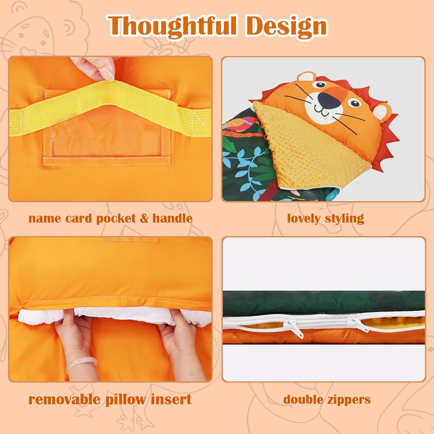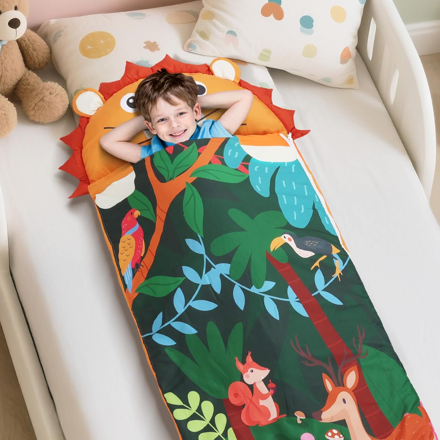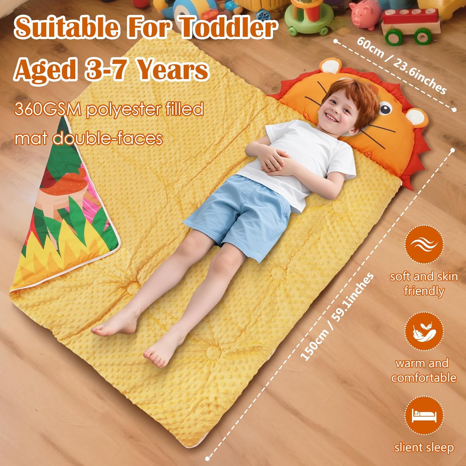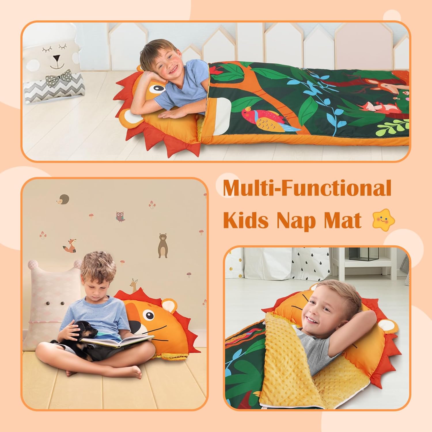 1. Alta Qualità: i toddler nap mat Decalsweet per bambini hanno un design a forma di leoni, particolarmente carino, e sono dotati di cuscini e coperte per bambini, con fibra di poliestere di alta qualità e fodera in velluto visone a pois, per creare un ambiente di sonno caldo, confortevole e tranquillo per il vostro bambino, con una cura tenera della pelle del vostro bambino. 2. Design Unico: Il sacco nanna adotta un design a doppia cerniera di tipo L, il lato destro e il fondo della doppia cerniera, il fondo della cerniera può essere aperto separatamente, comodo da regolare in base alle esigenze del bambino per dormire in modo più confortevole e regolare. Il cuscino è rimovibile, rendendo il sacco nanna facilmente lavabile. 3. Dimensioni e Spessore Adatti: Il nostro tappetino per pelo è di 150×60cm a grandezza naturale; la trapunta del materasso è riempita con da 360 gsm e la copertura è di 80 gsm.Le grandi dimensioni e il peso addensato sono molto adatti per il sonnellino dei bambini, portando loro un'esperienza di sonno indimenticabile. 4. Portatile e Facile da Pulire: Il tappetino per pisolino è dotato di cinghie in velcro e maniglie, che possono essere facilmente arrotolate e sollevate, molto comode da trasportare; con una fessura trasparente per il nome, non preoccupatevi di sbagliare o perdere il sacco a pelo. Consiglio: si consiglia di togliere il cuscino prima di lavarlo. 5. Multifunzionale: A casa, i bambini possono accoccolarsi accanto ai loro genitori; all'esterno, sia che si tratti di campeggio, di un pisolino all'asilo o di una festa notturna, viaggiare con questo bambino nap mat è una scelta molto adatta; l'immagine leoni carini è amata dai bambini, può essere usata come regalo di compleanno o di natale per i bambini!