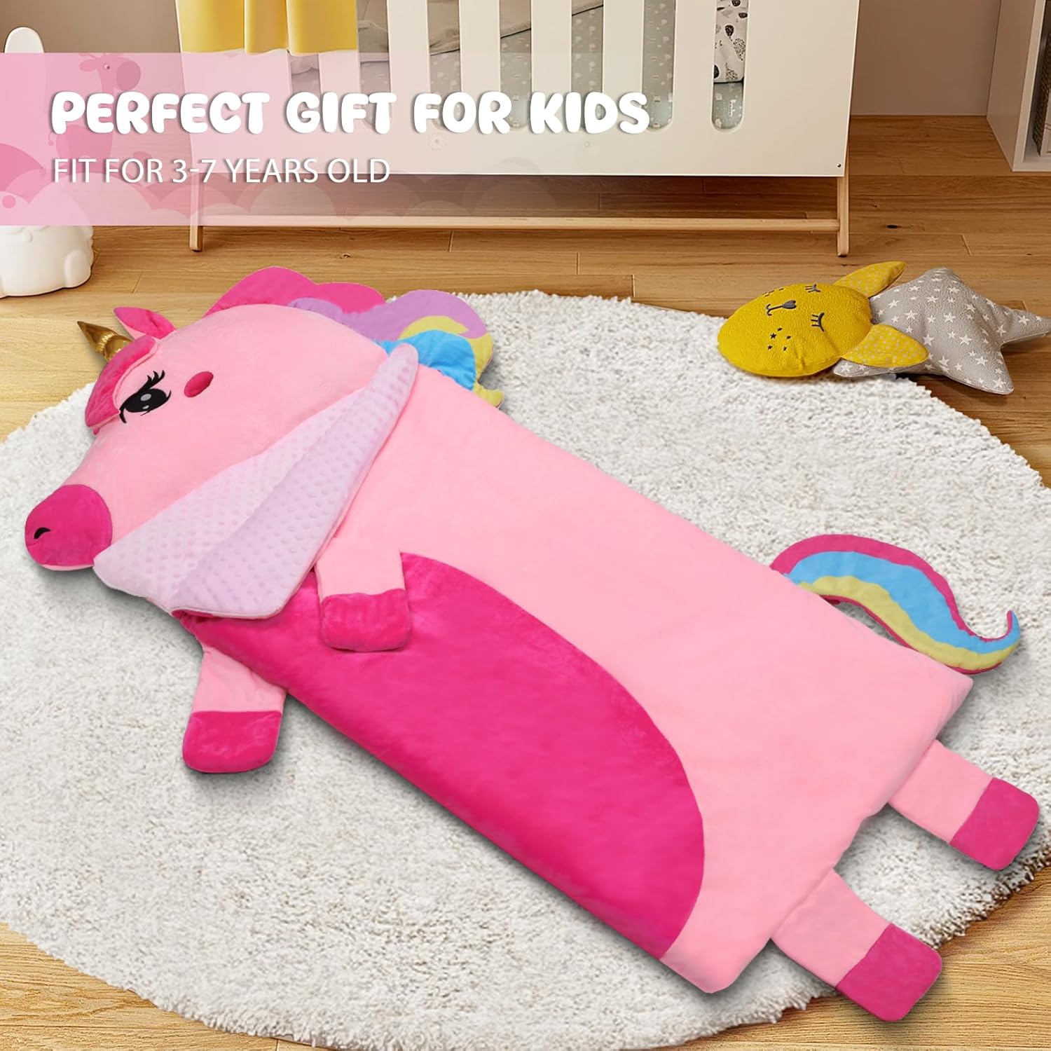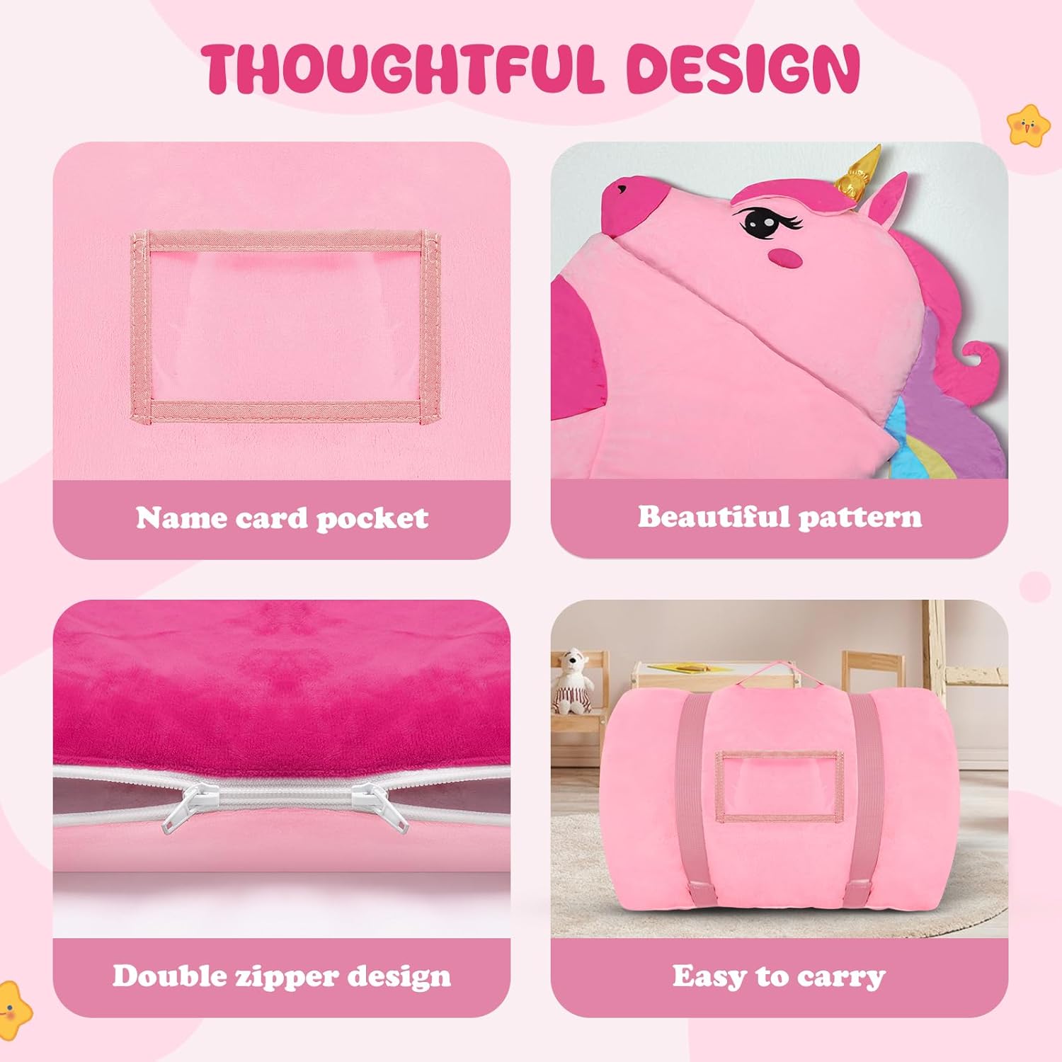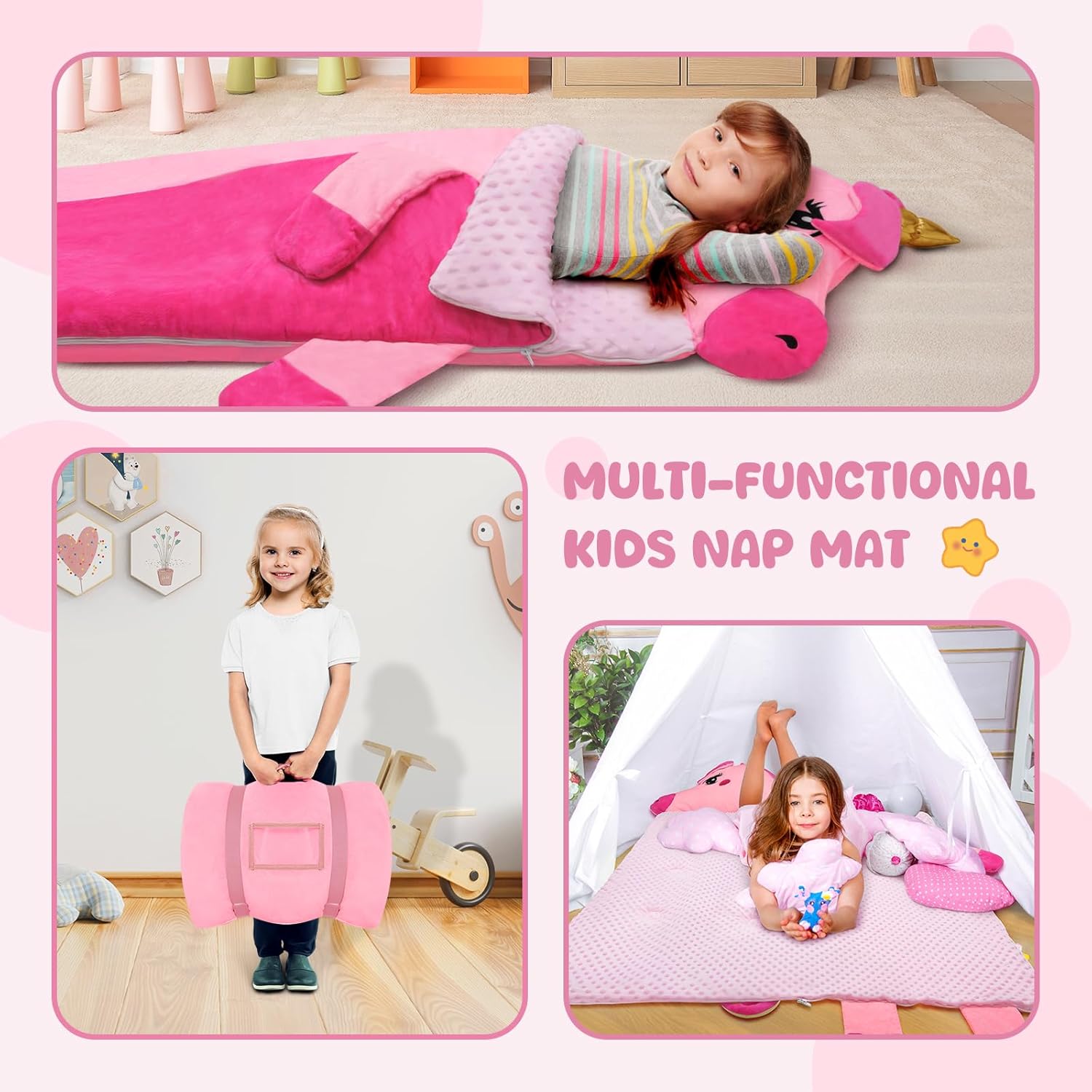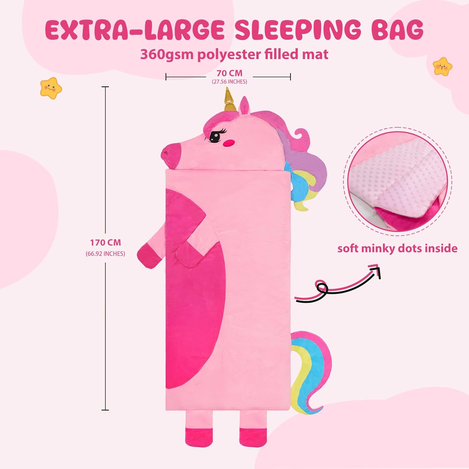 1. Alta Qualità: i toddler nap mat Decalsweet per bambini hanno un design a forma di unicorno, particolarmente carino, e sono dotati di cuscini e coperte per bambini, con fibra di poliestere di alta qualità e fodera in velluto visone a pois, per creare un ambiente di sonno caldo, confortevole e tranquillo per il vostro bambino, con una cura tenera della pelle del vostro bambino. 2. Design Unico: Il sacco nanna adotta un design a doppia cerniera di tipo L, il lato sinistro e il fondo della doppia cerniera, il fondo della cerniera può essere aperto separatamente, comodo da regolare in base alle esigenze del bambino per dormire in modo più confortevole e regolare. Il cuscino è rimovibile, rendendo il sacco nanna facilmente lavabile. 3. Dimensioni Ampliate: la nostra tappetino per pelo full size è 170 x 70cm; la trapunta del materasso è riempita con da 360 gsm e la copertura è di 80 gsm.Le grandi dimensioni e il peso addensato sono molto adatti per il sonnellino dei bambini, portando loro un'esperienza di sonno indimenticabile. 4. Portatile e Facile da Pulire: Il tappetino per pisolino è dotato di cinghie in velcro e maniglie, che possono essere facilmente arrotolate e sollevate, molto comode da trasportare; con una fessura trasparente per il nome, non preoccupatevi di sbagliare o perdere il sacco a pelo. Consiglio: si consiglia di togliere il cuscino prima di lavarlo. 5. Multifunzionale: A casa, i bambini possono accoccolarsi accanto ai loro genitori; all'esterno, sia che si tratti di campeggio, di un pisolino all'asilo o di una festa notturna, viaggiare con questo bambino nap mat è una scelta molto adatta; l'immagine unicorno rosa è amata dai bambini, può essere usata come regalo di compleanno o di natale per i bambini!