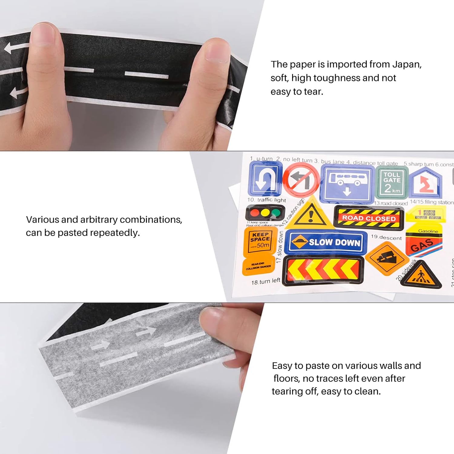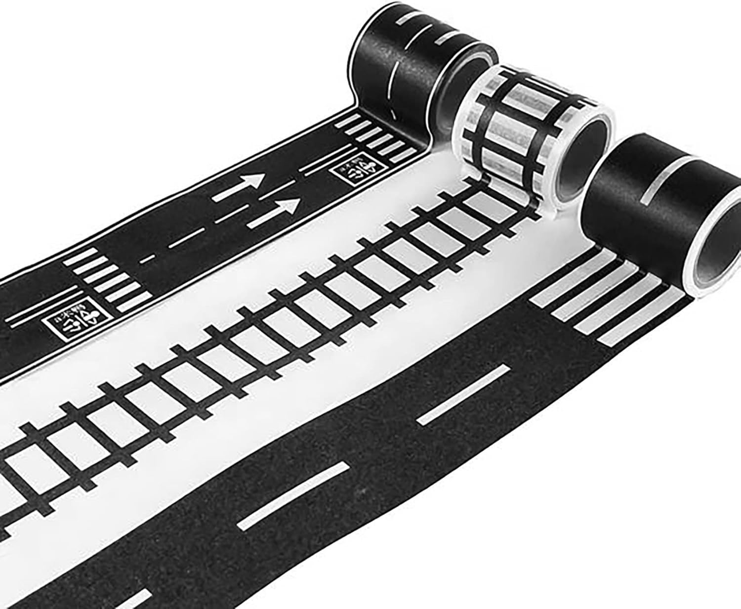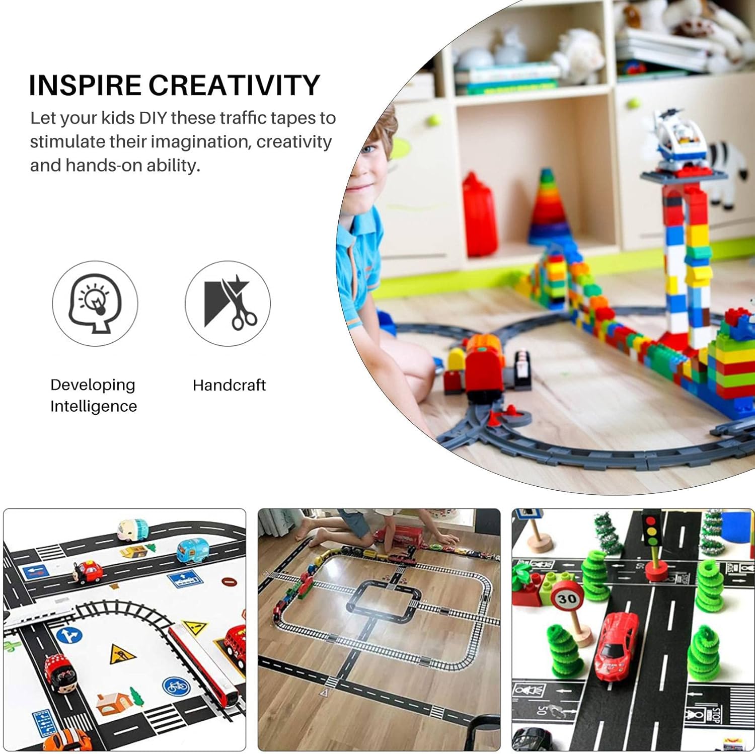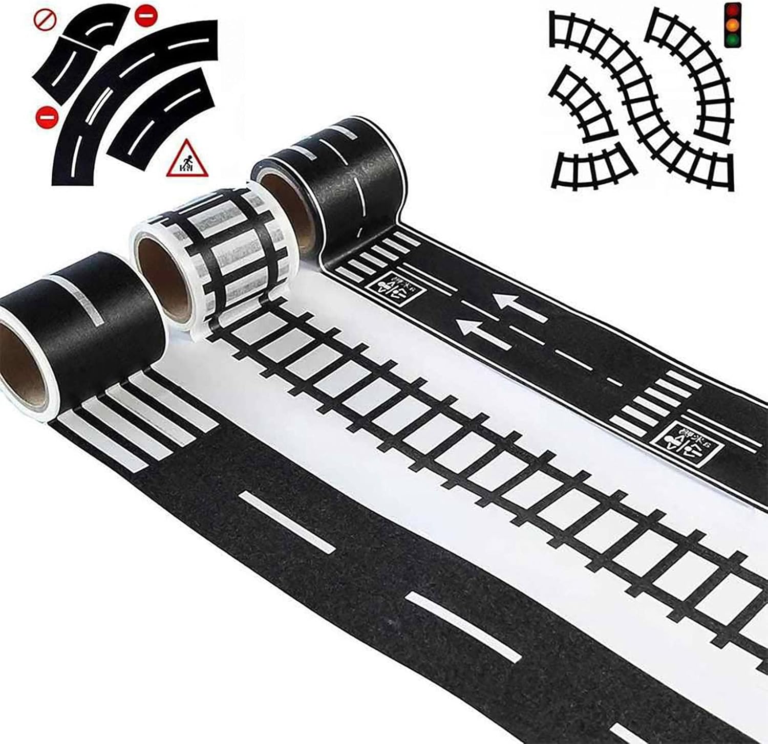 La riproduzione del nastro e' basata su carta, quindi non sono necessarie forbici o coltelli affilati. Non lascia residui, lacrime facili. Semplice da usare, basta srotolare il nastro del gioco, attaccare a qualsiasi superficie piana e lasciare che l'immaginazione di tuo figlio guidi Traccia nastro a 3 rotoli (4,8 cm * 5 m) Traccia +4 curve + 1 insegne stradali L'immaginazione di un bambino e' la loro piu' grande fonte di divertimento, e il nastro di riproduzione e' perfetto per costruire il proprio mondo di strade, autostrade e circuiti. Crea strade istantanee in qualsiasi momento.