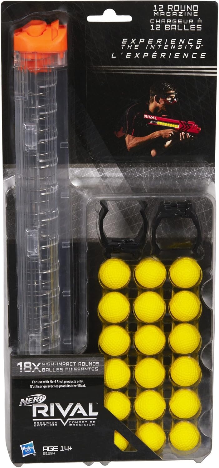 1 caricatore x18 + 18 biglie in schiuma per la gamma Nerf Rival. 'Con questo caricatore supplementare, impossibile di essere in mancanza di biglie in schiuma. 'Il caricatore può contenere fino a 18 biglie in schiuma e è dotato di due binari tattiche per si scatto sull' insieme dei Nerf rivale.