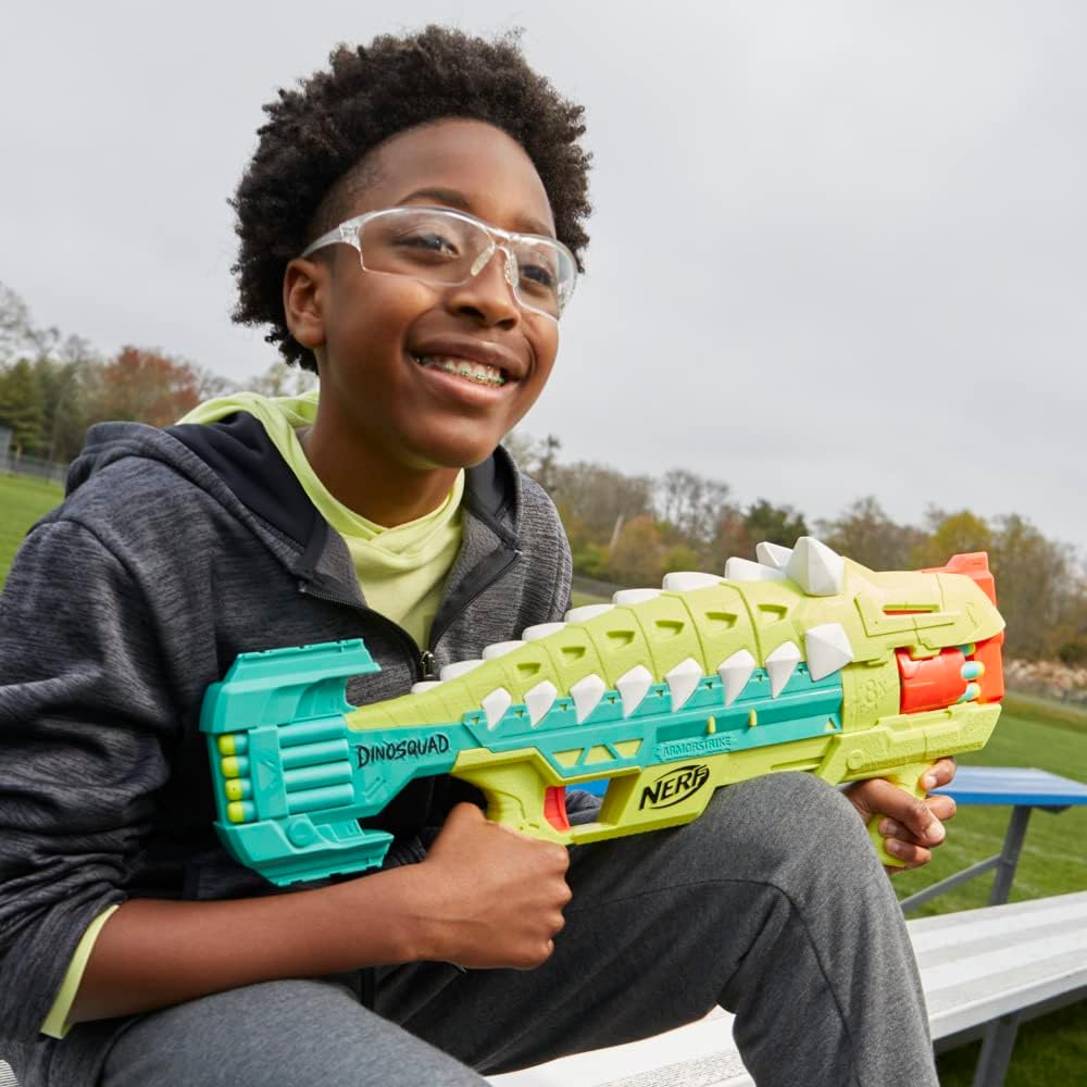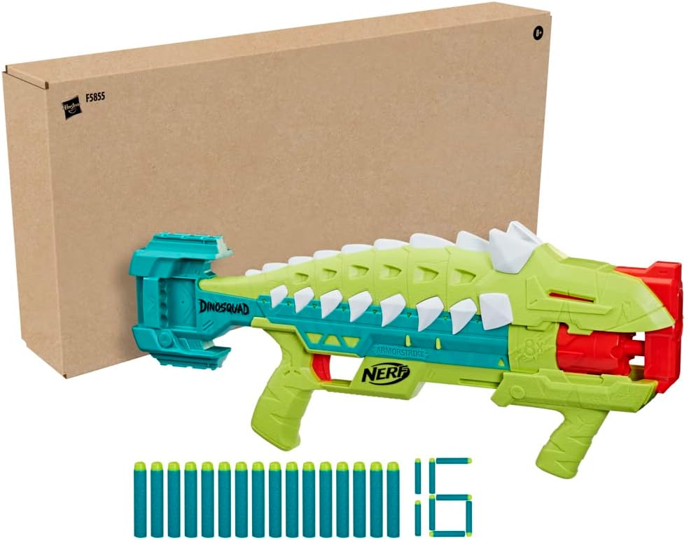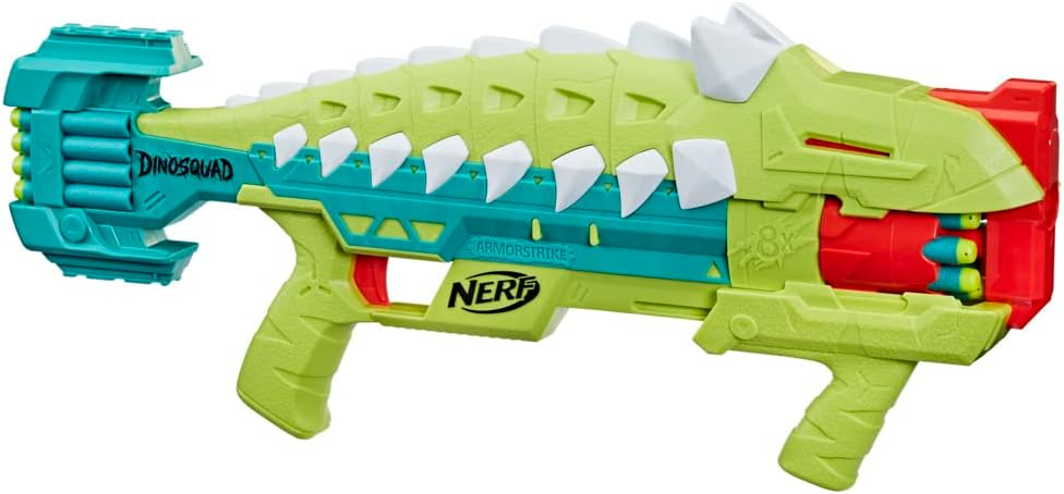 BLASTER NERF DINOSQUAD ARMORSTRIKE: lanciati in imprese e avventure grazie a questo blaster con incredibili dettagli che riproducono l'aspetto di un anchilosauro TAMBURO ROTANTE DA 8 DARDI: mostra la tua forza da dinosauro con questo blaster, in grado di lanciare 8 dardi in gommapiuma Nerf Elite di fila dal tamburo rotante da 8 dardi IMPUGNATURA SGANCIABILE CON AZIONE A POMPA: pompa l'impugnatura sganciabile muovendola avanti e indietro per armare il blaster e sfrutta il design dell'impugnatura sotto la canna per aiutarti a stabilizzare la mira 16 DARDI NERF: include 16 dardi originali Nerf Elite in gommapiuma, offrendoti 8 dardi per caricare il tamburo e 8 dardi da collocare nel blaster per ricaricare PORTADARDI: il blaster è dotato di un portadardi integrato da 8 dardi, così puoi tenere dei dardi di riserva a portata di mano per poter ricaricare velocemente il tamburo e continuare a lanciare
