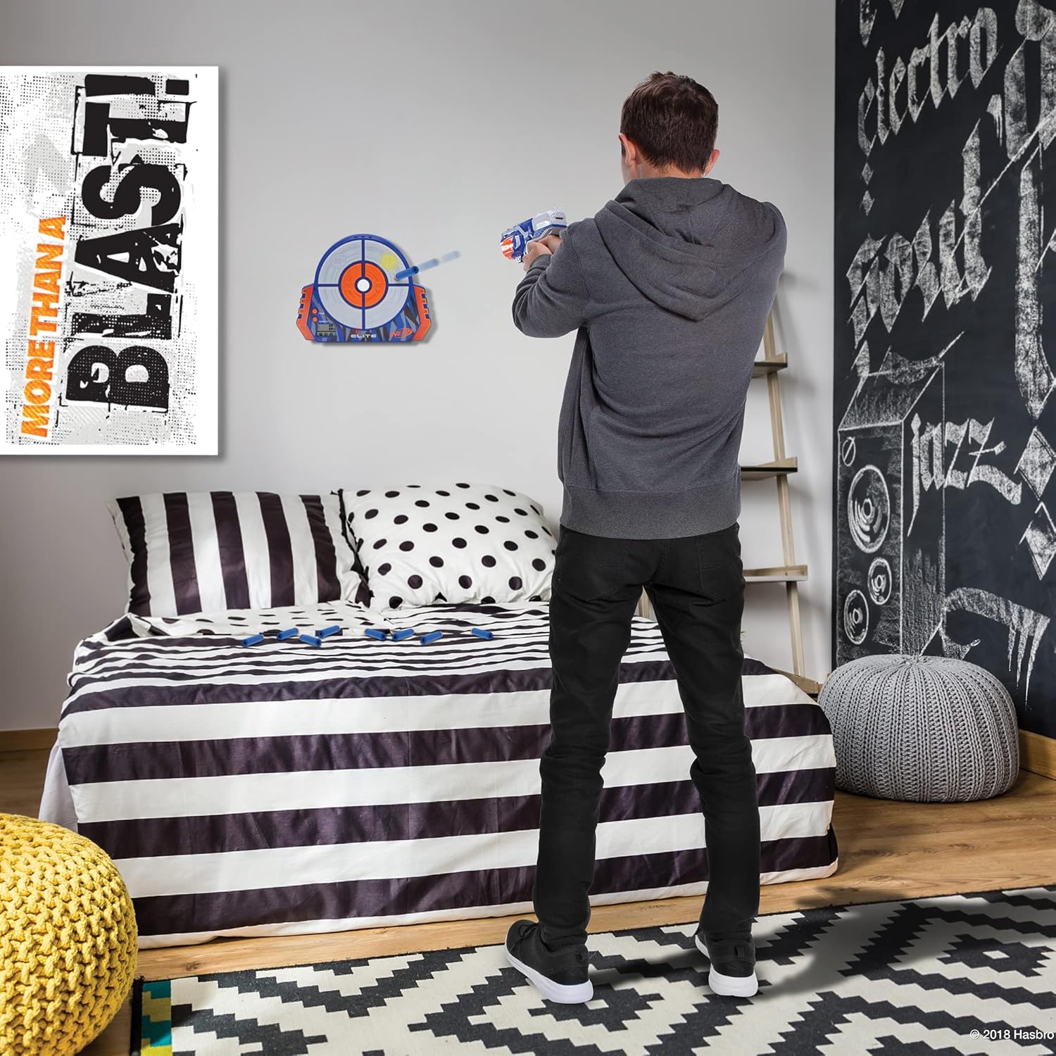 Perfeziona il tuo tiro Bersaglio a batteria con effetti luminosi e sonori e diverse modalità di gioco Allenati quando, dove e come vuoi con il supporto regolabile e il gancio da parete Preparati per la prossima battaglia con altri accessori e accessori NERF Elite Nota importante: sono necessarie 3 batterie AA da 1,5 V (non incluse)