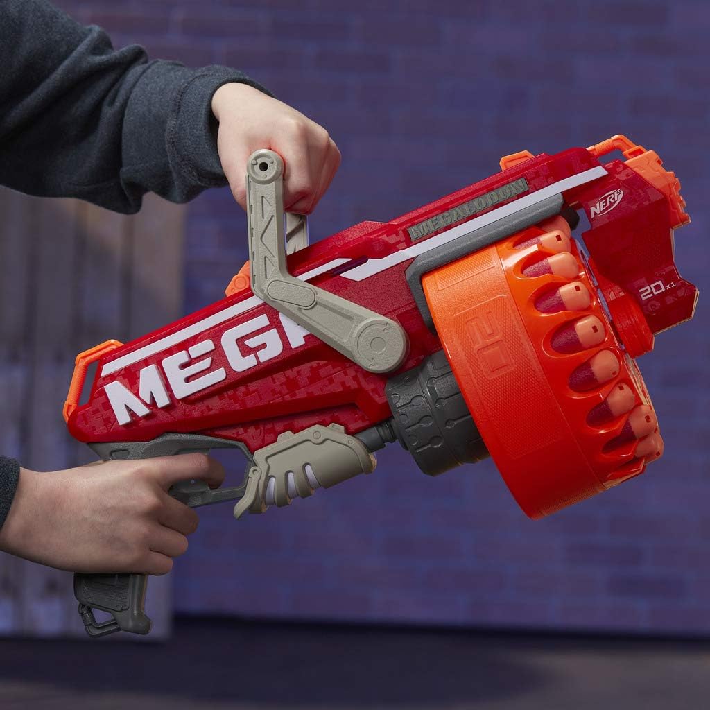 Tamburo rotante a 20 dardi Gira per fare fuoco Dardi di fuoco fino a 85 piedi, 26 metri Azione slam-fire Comprende 20 dardi Nerf Mega