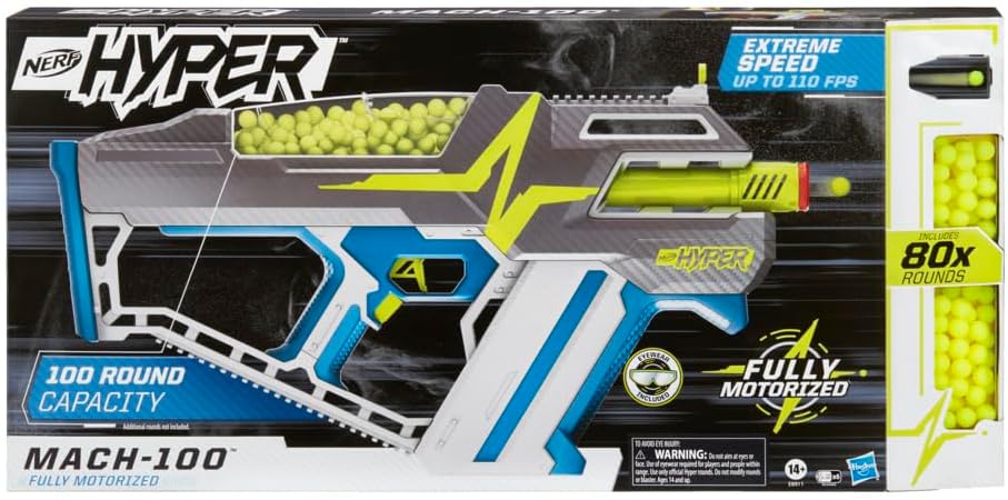 SISTEMA HYPER NERF RIVOLUZIONARIO: Caratterizzato da round Nerf Hyper con un design innovativo e materiale per prestazioni per massimizzare capacità e velocità BLASTER NERF HYPER MACH-100 COMPLETAMENTE MOTORIZZATO: Arrotonda con incredibile velocità da questo blaster completamente motorizzato che scatena giri a una velocità fino a 110 FPS. Richiede batterie (non incluse) 80 NERF HYPER ROUNDS E GRANDE TRAPANA CON CAPACITÀ DI 100 ROTONDI: Blaster viene fornito con 80 giri Nerf Hyper. La tramoggia grande e facile da caricare può contenere fino a 100 giri (giri aggiuntivi venduti separatamente) GUIDE TATTICHE PER CANISTER DI RELOAD: Attacca i contenitori di ricarica rotondi Nerf Hyper alle guide tattiche per riempire velocemente la tramoggia (contenitori e giri aggiuntivi venduti separatamente). Occhiali inclusi
