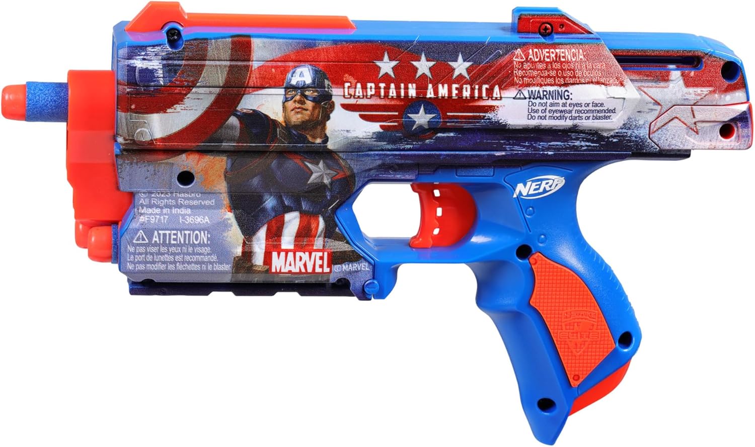 Fucile a pompa con Capitan America su entrambi i lati Tienilo a portata di mano con la fondina a clip, che ha anche uno spazio per quattro dardi in modo da poter ricaricare rapidamente durante le battaglie È dotato di 10 dardi Nerf Elite, sufficienti per caricarlo completamente e di dardi aggiuntivi per la ricarica