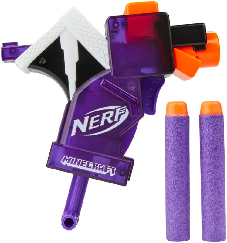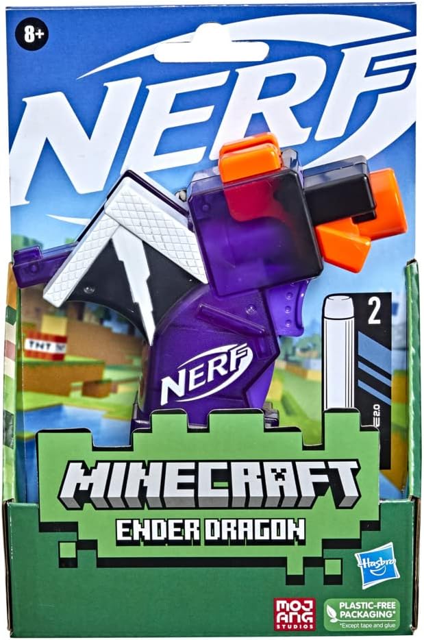 NERF MICROSHOTS MINECRAFT ENDER DRAGON BLASTER: Il blaster Nerf Minecraft spara freccette prende ispirazione dal dragon mob di Minecraft, catturando l'aspetto dell'entità nel franchise di videogiochi Mini blaster e 2 freccette Nerf: il blaster include 2 freccette ufficiali Nerf Elite in schiuma e dispone di una dimensione compatta ideale per il trasporto in battaglia e per la visualizzazione in collezioni Nerf e Minecraft Spara 1 freccetta alla volta: questo blaster spara 1 dardo alla volta ed è facile da usare. Caricare 1 dardo nella canna, tirare verso il basso la maniglia di adescamento e premere il pulsante
