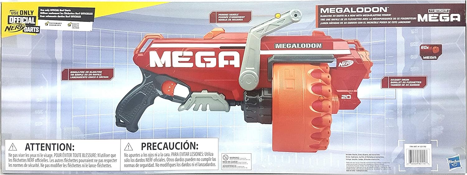 Caricatore rotante con 20 freccette Portata fino a 26 metri Tiro al colpo per colpo o scoppio N-Strike Mega Megalodon Blaster by NERF Caricatore rotante per 20 freccette