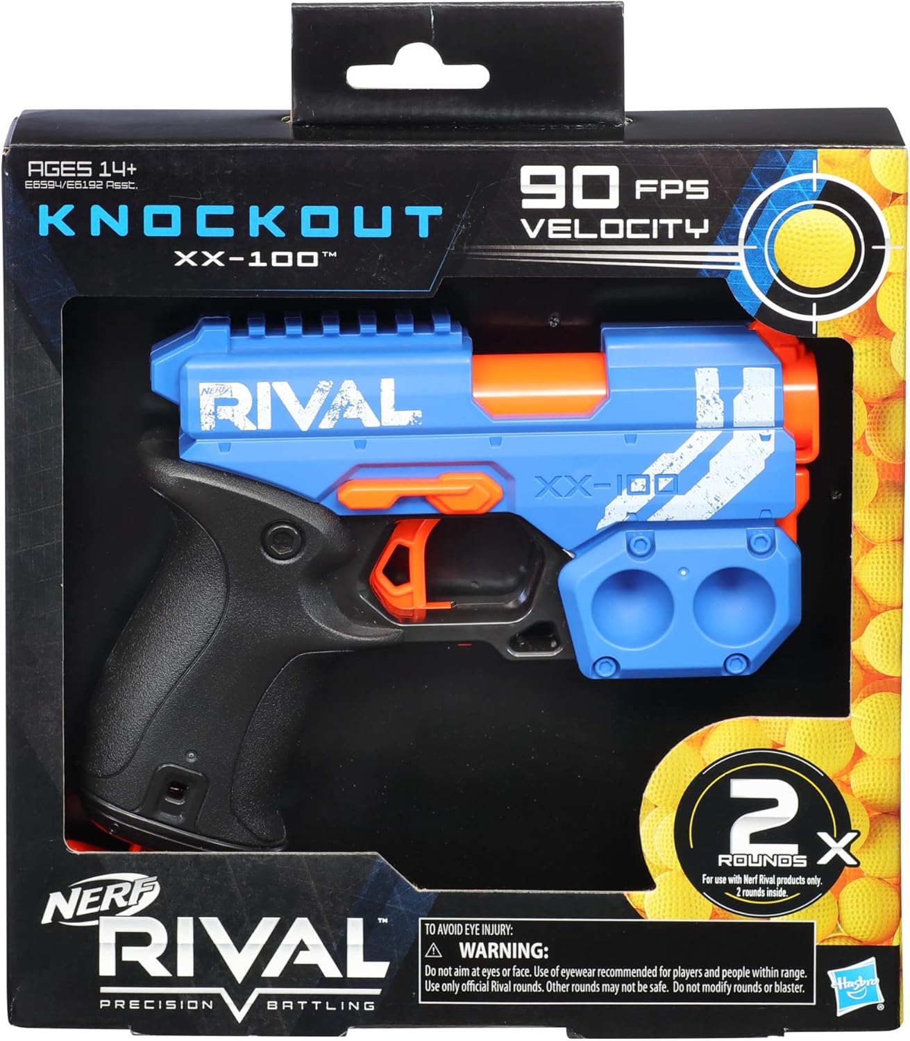 Potenza Nerf Rival in un formato compatto: il blaster Knockout XX-100 offre potenza ad alta intensità Nerf Rival in un formato compatto, ideale per giochi veloci e sorprese furtive. Meccanismo a molla e blocco del grilletto: è dotata di un meccanismo a molla per il lancio manuale (senza bisogno di batterie) e di un blocco del grilletto per evitare spari accidentali. Contenitore per palline: l’area di stoccaggio integrata permette di tenere le palline a portata di mano per ricaricare velocemente mentre giochi nella squadra blu con la versione blu di questo blaster Knockout XX-100. 27 m/s: spara palline a una velocità di 27 m/s con la precisione Nerf Rival da questo blaster a carica posteriore.