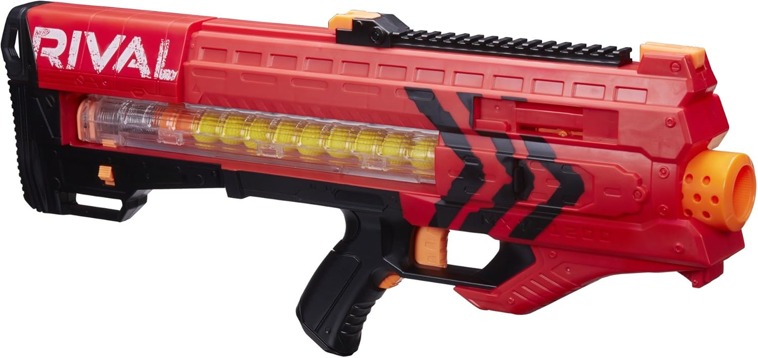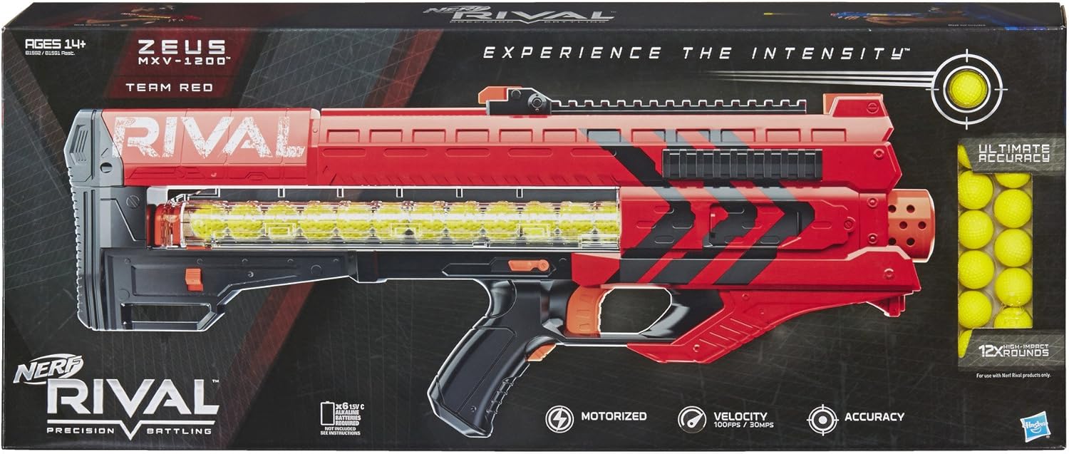 Team Red ZEUS MXV-1200, mitragliatrice per ogni battaglia con scoppio motorizzato. Include 12 pallottole ad alto impatto Nerf Rival. Facile da caricare, ambidestro. Mirino flip-up, blocco del grilletto e sblocco dell'inceppamento.