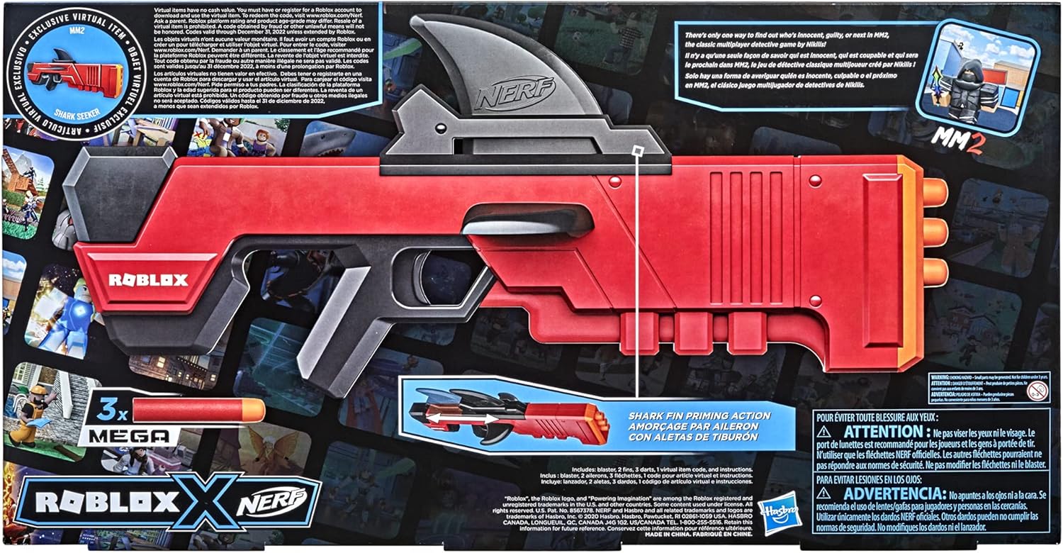 NERF ROBLOX MM2: SHARK SEEKER DART BLASTER: Questo blaster sparatutto prende la sua ispirazione dal gioco Roblox MM2 ESCLUSIVO CODICE ARTICOLO VIRTUALE: Questo blaster Nerf Roblox include un codice che consente di riscattare un oggetto virtuale esclusivo su Roblox Pinna di squalo: il blaster dispone di una pinna di squalo che si sposta per innescare il blaster per sparare! Tirare la pinna indietro e spingerla in avanti verso prime, quindi premere il grilletto per sparare un dardo Include 3 freccette Nerf Mega: include 3 grandi freccette ufficiali Nerf Mega realizzate in schiuma, ideali per giochi interni ed esterni