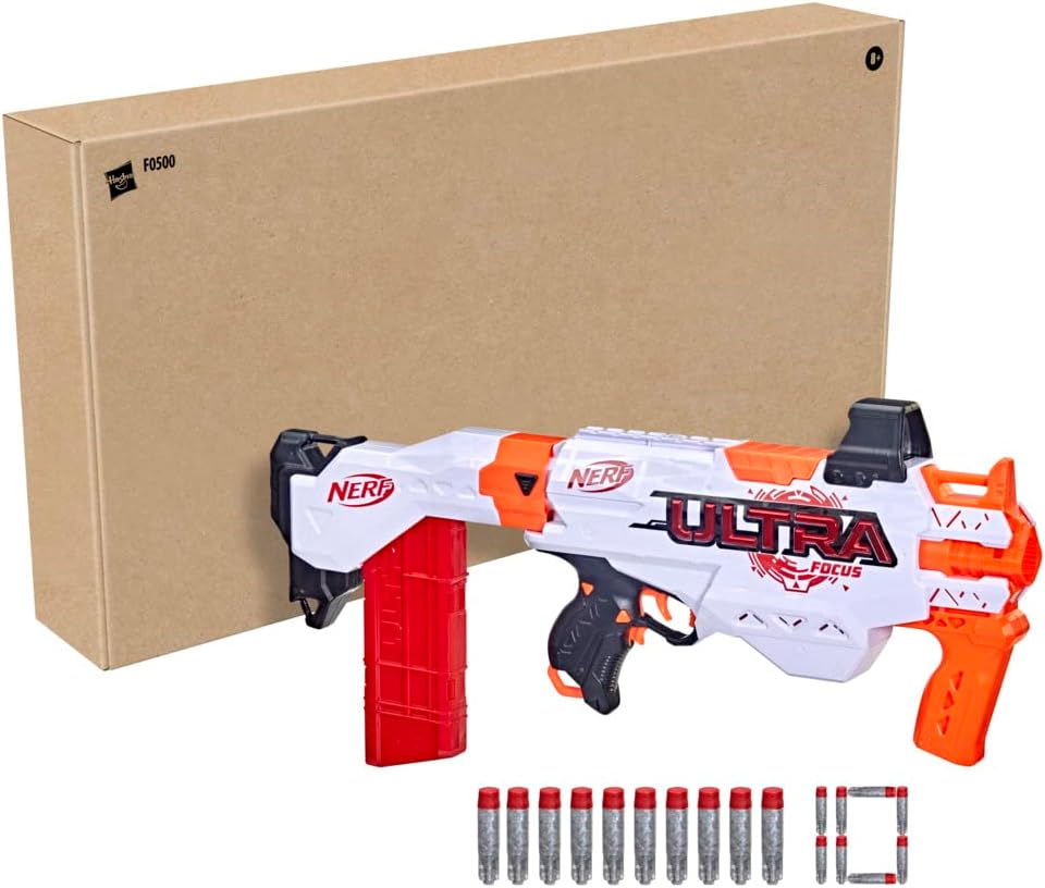 LANCIA-DARDI MOTORIZZATO: inizia a lanciare con il blaster lancia-dardi motorizzato Focus di Nerf Ultra! Il blaster funziona solo con i dardi Nerf Ultra. Sono necessarie 6 batterie alcaline AA da 1,5 V, non incluse INCLUDE CARICATORE RIMOVIBILE DA 10 DARDI E 10 DARDI NERF ULTRA ACCUSTRIKE: i dardi Nerf AccuStrike Ultra sono i dardi Nerf Ultra più precisi (i dardi funzionano solo con i blaster Nerf Ultra) CALCIO RIMOVIBILE CON PORTACARICATORE: il blaster presenta un calcio rimovibile per stabilizzare la mira e include un portacaricatore integrato MIRINO INTEGRATO: il blaster presenta un mirino integrato per prendere di mira i bersagli. Prendi la mira dei tuoi bersagli con l'aiuto del mirino e lanciati in entusiasmanti battaglie Nerf CONFEZIONE SOSTENIBILE: venduto in una semplice confezione riciclabile, facile da aprire senza frustrazioni
