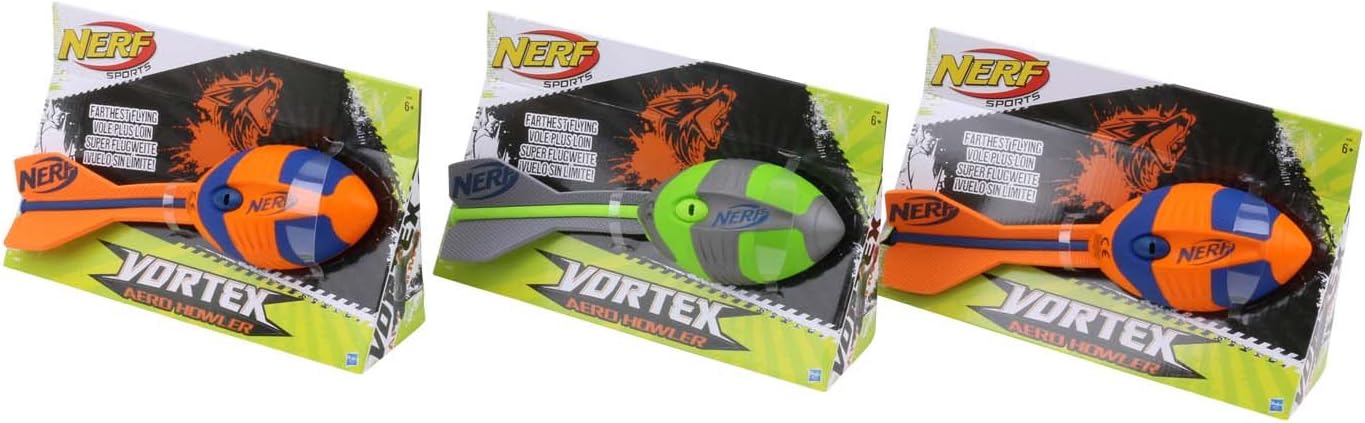 Il calcio Aero Howler è realizzato in schiuma solida. La sua straordinaria forma e struttura crea una rapida rotazione attorno all'asse longitudinale. Grazie alla sua forma aerodinamica, il Nerf Vortex può essere lanciato con grande precisione. Quando si vola, emette un fischio. Il calcio Aero Howler ha una forma ergonomica, che fornisce una buona presa per mani piccole e grandi. Lunghezza: 32 cm. Diametro: 9 cm. Peso: 130 g. Adatto per bambini dai 5 anni in su. Set di tre palloni da calcio Aero Howler: 2 arancioni e 1 verde.