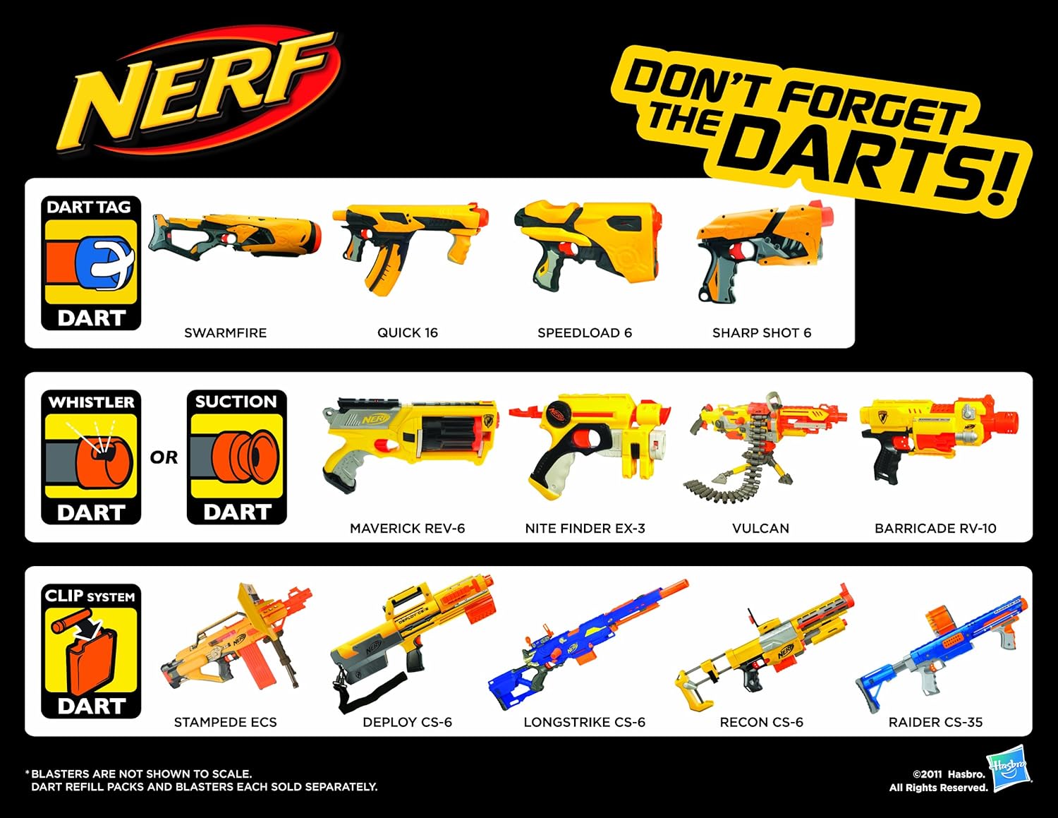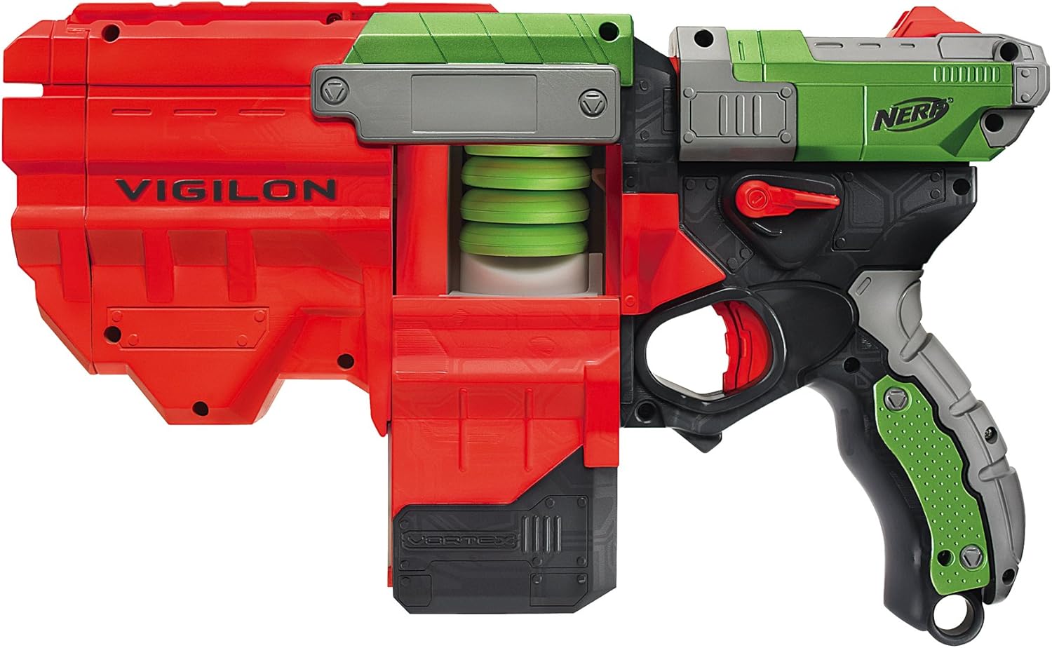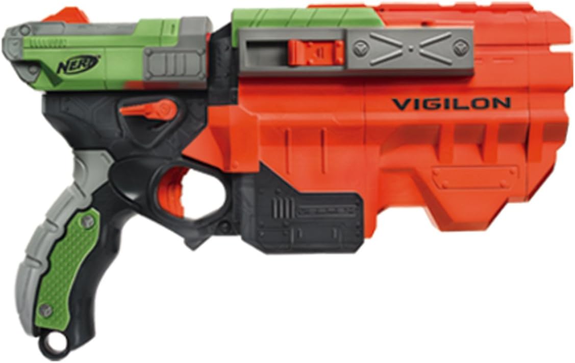 This NERF pistol is the Vortex equivalent of the Maverick six-shot N-strike line. For new inductees, this means that instead of firing soft foam darts, the Vigilon fires small hard-foam discs. The discs are not as flimsy as one would imagine--in fact, they lend themselves to DIY loading magazines and robotic apparatus. They are constructed of a hard-plastic inner element, around which soft foam is wrapped. The firing mechanism requires the hard plastic for durability, but fired discs will only contact the target with the soft-foam edges. The gun does have more power ("zing") than the N-strike line, so prudence must be used when aiming. The advantage of discs over darts is twofold: as mentioned above, discs are far more durable than the standard-issue NERF dart. The soft foam on a disc is still more sturdy than the foam used on the body of a dart, and less liable to crush with the odd pressure. Furthermore, a disc will deteriorate far less with time than a dart, perhaps losing some material on the edges. Since the device is fully mechanical (internal throwing arm instead of air plunger system), the common problems associated with NERF darts are fully eradicated. The second advantage of discs over darts lies in their range and accuracy. Discs, acting like high-speed Frisbees, perform to triple the range of a NERF dart. Unfortunately, along with range come certain problems in windy conditions--this pistol is best used indoors. Accuracy is stellar, a characteristic attributed to the gun's mechanical system: discs are pulled by an arm down the barrel of the gun, so their momentum comes from the front of the projectile, unlike darts, which are pushed from the back by a blast of air. The issue is akin to throwing a paper airplane in two different ways: if one throws from the back, the paper airplane fishtails, dives, or stalls in midair, but if thrown from near the front, its flight is stable and accurate, if less powerful (and with the gun's power, this is a non-issue). One application of the discs are their tendency to ricochet off multiple surface, adding a whole new dimension to NERF warfare. This is a double-edged sword--discs also tend to get lost much more easily, a drawback considering that they are considerably more expensive than darts. (See NERF VORTEX Disc Refill Pack ) The gun itself has many useful features, such as a new ratcheted cocking mechanism that prevents the slide from slamming back before fully cocked, as in some N-strike models. The built-in magazine has a handy door-release lever that eliminates the time taken during a reload to open or remove the magazine of the gun. Once firing is complete, the thumb can easily reach over and throw the lever to instantaneously open the magazine (not to mention that in a different review, the reviewer agrees that slamming shut the sliding door to the magazine after loading produces a very satisfying "lock-and-load" sensation. I have gotten into the annoying habit of opening and shutting the magazine door for no reason). The only disadvantage of this ease is that a single bump in the wrong place can send the magazine door flying open, the loaded discs falling out. Loading ease is otherwise limited, because though the magazine can hold five discs, they must be either placed on top of previously loaded discs or slid underneath them, so loading five discs in one piece is difficult. Nevertheless, loading is considerably easier in the Vigilon than in its N-strike counterpart, in which darts must be loaded separately into six different chambers in the revolver. The Vigilon can accommodate a sixth disc when one is already primed in the barrel for firing, but this requires loading a disc, priming it, and then opening the magazine to load five more. One great disadvantage is that the magazine only opens to the right, making loading extremely cumbersome for left-handed users. This gun will not cock unless it has a disc to prime with. Neither will it fire if the firing arm is tensed but has no disc to fire (see below). As rumored, this gun is incapable of slam-firing. In the unlikely event that a disc gets jammed, the jam-release slider on the side of the gun is more than capable of clearing it with ease; however, this mechanism does not relax the throwing arm, so the gun will remain primed for the next disc. For this reason, it is best not to clear a jam and then stop using the gun, because the torsion spring that holds the firing arm will remain tense, and may be damaged with time. One fun application of the jam-release is to prime a disc, release it into the barrel, and then load another disc. When fired, two discs will erupt from the muzzle of the gun (albeit with drastically reduced range). The gun is fairly durable, but dropping it onto hard surfaces in inadvisable, as it will scratch easily. It has many more flat planes than the Maverick, and also is considerably heavier near the muzzle than at the butt, so it makes an alarming crash when dropped by mistake. For more information about this gun and other products in the NERF line, consult this very useful website: (...)