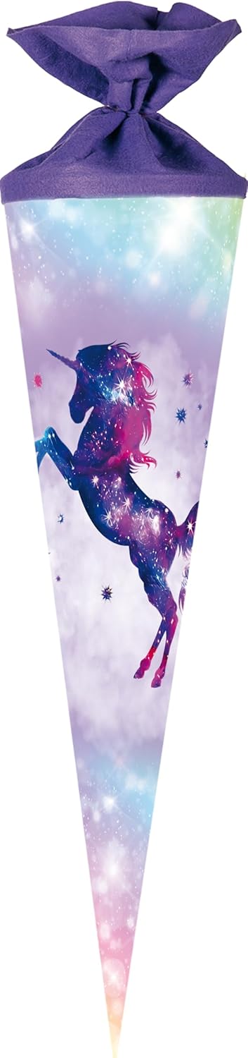 Nestler Set di sacchetti per la scuola da riempire, sacchetto di zucchero fatto a mano, in cartone, motivo Galaxy Unicorn, sacchetto per la scuola, protezione in pizzo, fiocco (viola, 70 cm, rotondo)