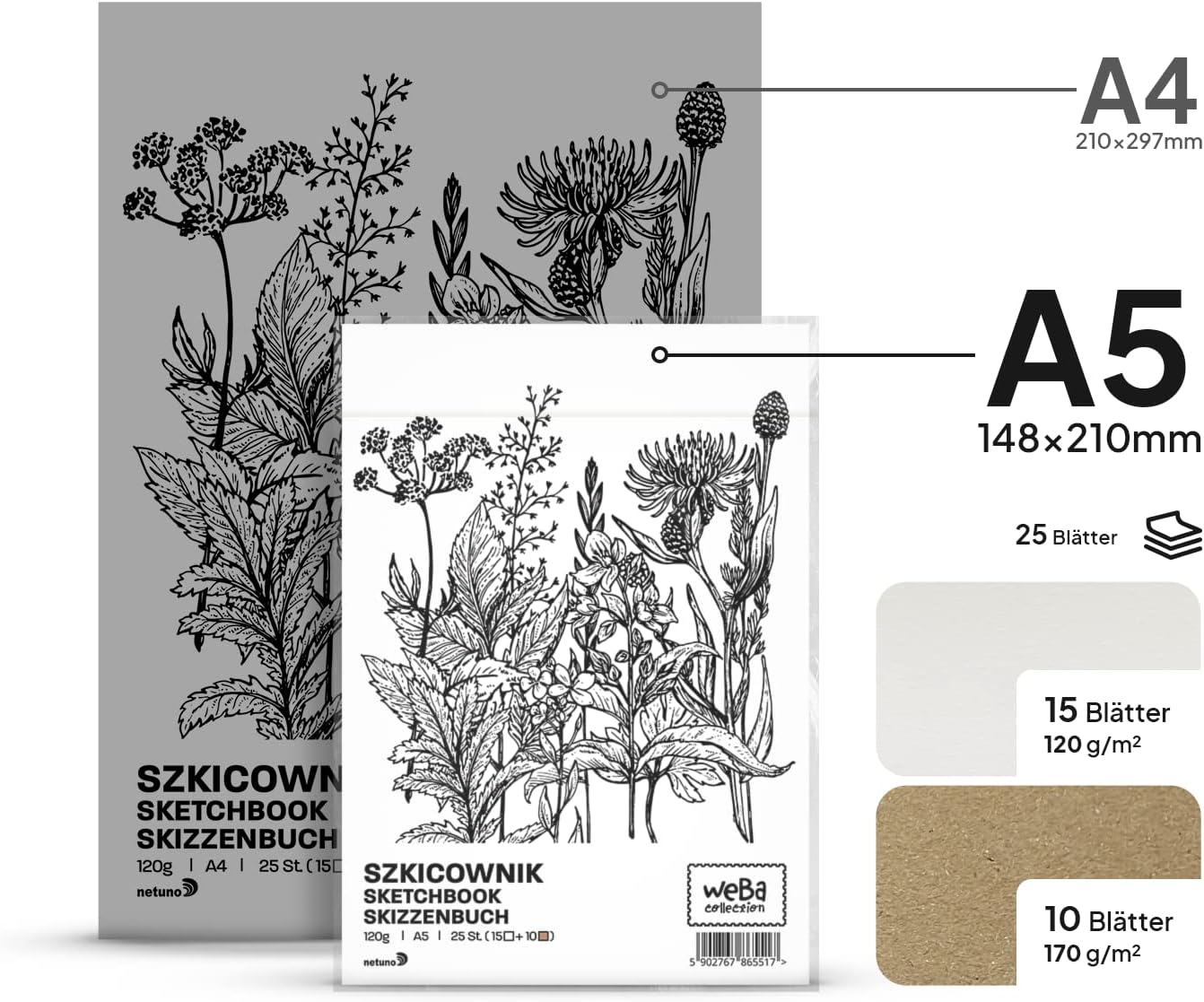 Carta di alta qualità: il blocco da disegno contiene 15 fogli di carta prisma da 120 g in bianco con una struttura in feltro leggermente testurizzata e 10 fogli di carta kraft liscia da 170 g in marrone sabbia. Entrambi i tipi di carta sono ideali per dipingere, disegnare, scrivere e disegnare. Per ogni tecnica di disegno: la carta da disegno è adatta per disegni, grafici e schizzi (con matita, pastello, pennarello, gesso o carbone). È ideale anche per tecniche nasali (acquerello, guazzo e inchiostro). Pratico e versatile: il nostro album da disegno è un pratico accessorio da disegno non solo per artisti professionisti, ma anche per dilettanti che amano disegnare e fare il bricolage. I fogli possono essere facilmente strappati dal blocco da disegno e utilizzati come decorazione. Ampia offerta: nel nostro assortimento Amazon troverete una vasta gamma di prodotti di cancelleria di alta qualità per disegnare, dipingere e bricolage. Offriamo carta fine e cartoncini sottili, buste e buste per spedizioni, articoli da ufficio e creativi, ecc. Contenuto della confezione: 1 blocco da disegno bianco/Eco in formato DIN A5, 148 x 210 mm (15 fogli di carta prisma bianca grammatura 120 g + 10 fogli di carta kraft da 170 g marrone sabbia), certificato FSC, in pura cellulosa ECF; incollato sulla testa.