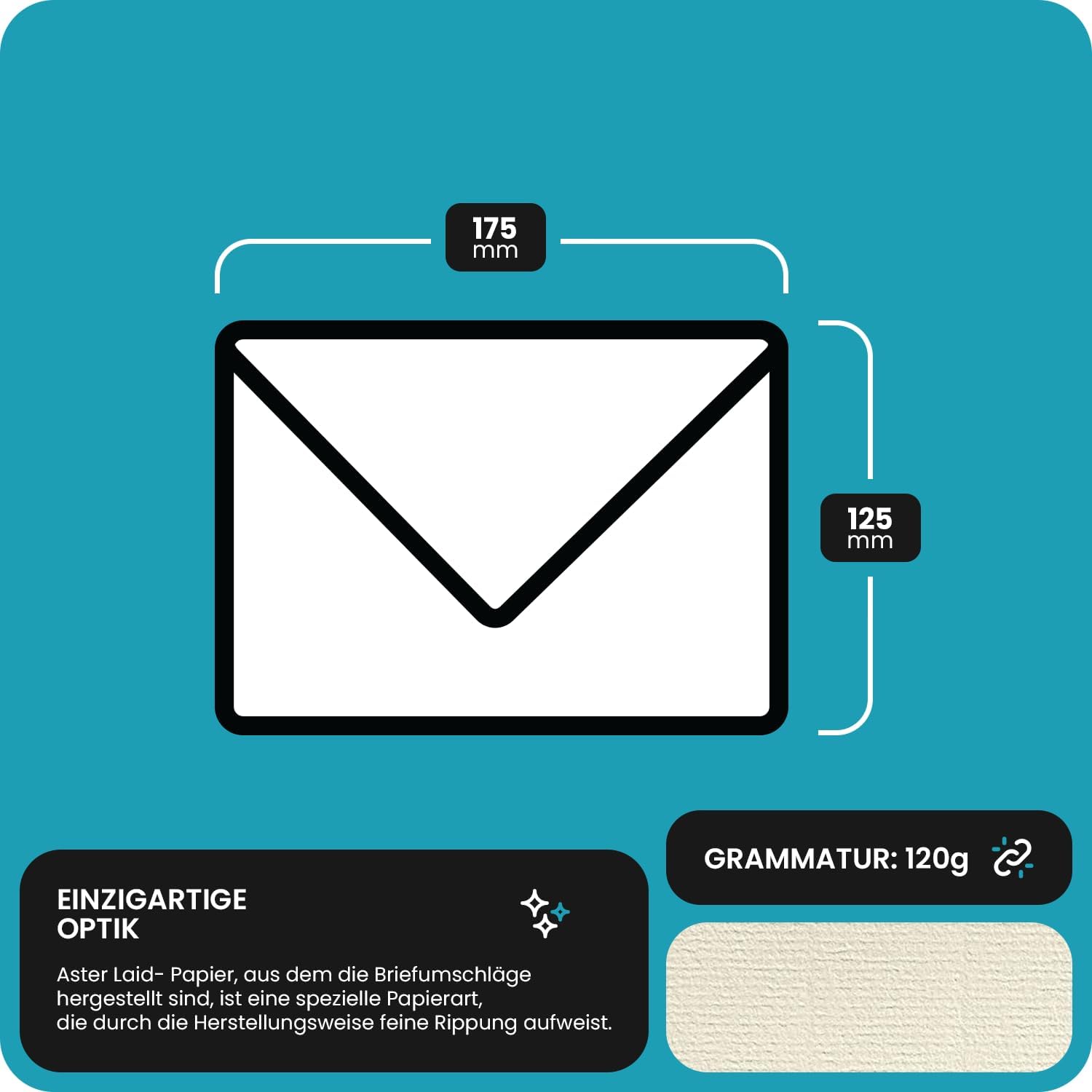 FORMATI BUSTE – A seconda delle sue esigenze, deve scegliere la giusta dimensione della busta. B6 è il classico formato delle cartoline postali. La busta B6 e ideale anche per più fogli in formato A5 ripiegati oppure per un foglio A4, ripiegato due volte. ASPETTO UNICO – Aster Laid è una carta ottenuta attraverso il processo di vergatura. Le verghe e le catenelle lasciano sulla superficie della carta una impronta ben visibile in trasparenza come se fosse una filigrana. PER INVITI E PARTICIPAZIONI – Le buste Aster Laid sono dedicate agli eventi più importanti, sia per le imprese sia per privati. Sono perfette per un matrimonio, anniversario, compleanno, battesimo, prima comunione, una festa aziendale, Natale o Pasqua. AMPIO ASSORTIMENTO – Sul nostro sito Amazon troverà una grande scelta di buste da lettera in diversi colori e dimensioni per tutte le occasioni. Offriamo anche carta e cartoncino in vari formati, grammature e finiture; adatti a molteplici attività! DATI TECNICI – 25 buste in formato B6 (125x175mm) con taglio a punta, chiusura adesiva, senza finestra, realizzate in carta vergata 120 g, senza legno, certificata FSC. Sono scrivibili e stampabili (con laser e a getto d'inchiostro).