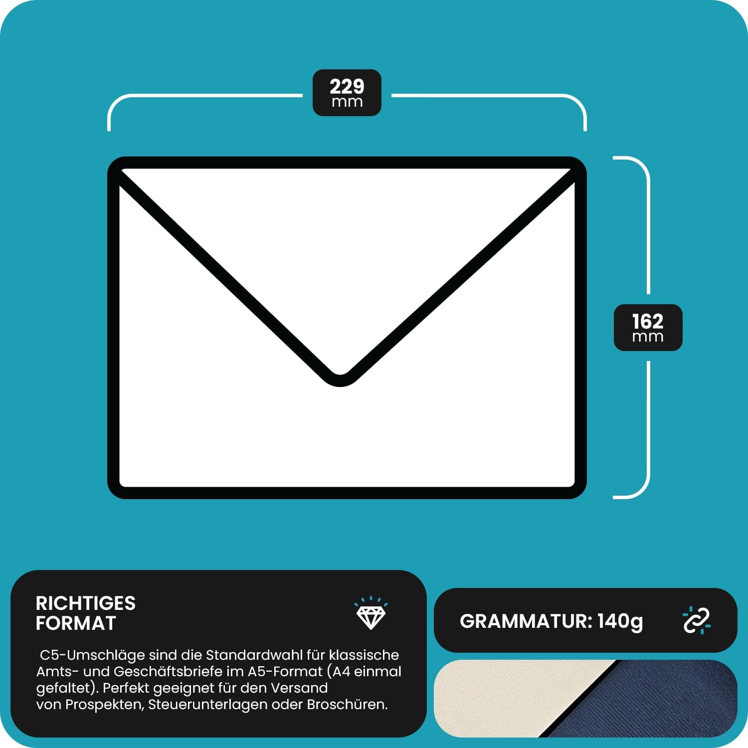 FORMATO CORRETTO – Le buste da lettera C5 sono la scelta standard per lettere ufficiali e commerciali in formato A5 (cioè un foglio A4 piegato una volta). Sono perfette per l’invio di brochure, documenti fiscali o opuscoli. PREGIATE ED ELEGANTI – Realizzate in carta italiana Nettuno con una marcatura a sottili solchi lineari su entrambi i lati e da colori resistenti alla luce. La particolare struttura rigata dona un aspetto raffinato e un’eleganza senza tempo. GRAMMATURA ELEVATA – Realizzate in carta pregiata di pura cellulosa ECF con grammatura di 140, queste buste sono anche particolarmente resistenti allo strappo, ideali per proteggere e conservare documenti importanti in totale sicurezza. PER OCCASIONI SPECIALI – Le beste colorate con struttura sono la scelta ideale per momenti importanti. Perfette per inviare inviti di nozze, partecipazioni, biglietti di ringraziamento, congratulazioni, auguri di Natale o foto. DATI TECNICI – 25 buste formato C5 (162 x 229 mm), lembo a punta, gommato. Realizzate in carta Nettuno 140 g/m², marcata a feltro su entrambi i lati. Il colore reale può variare leggermente a causa delle impostazioni del monitor.