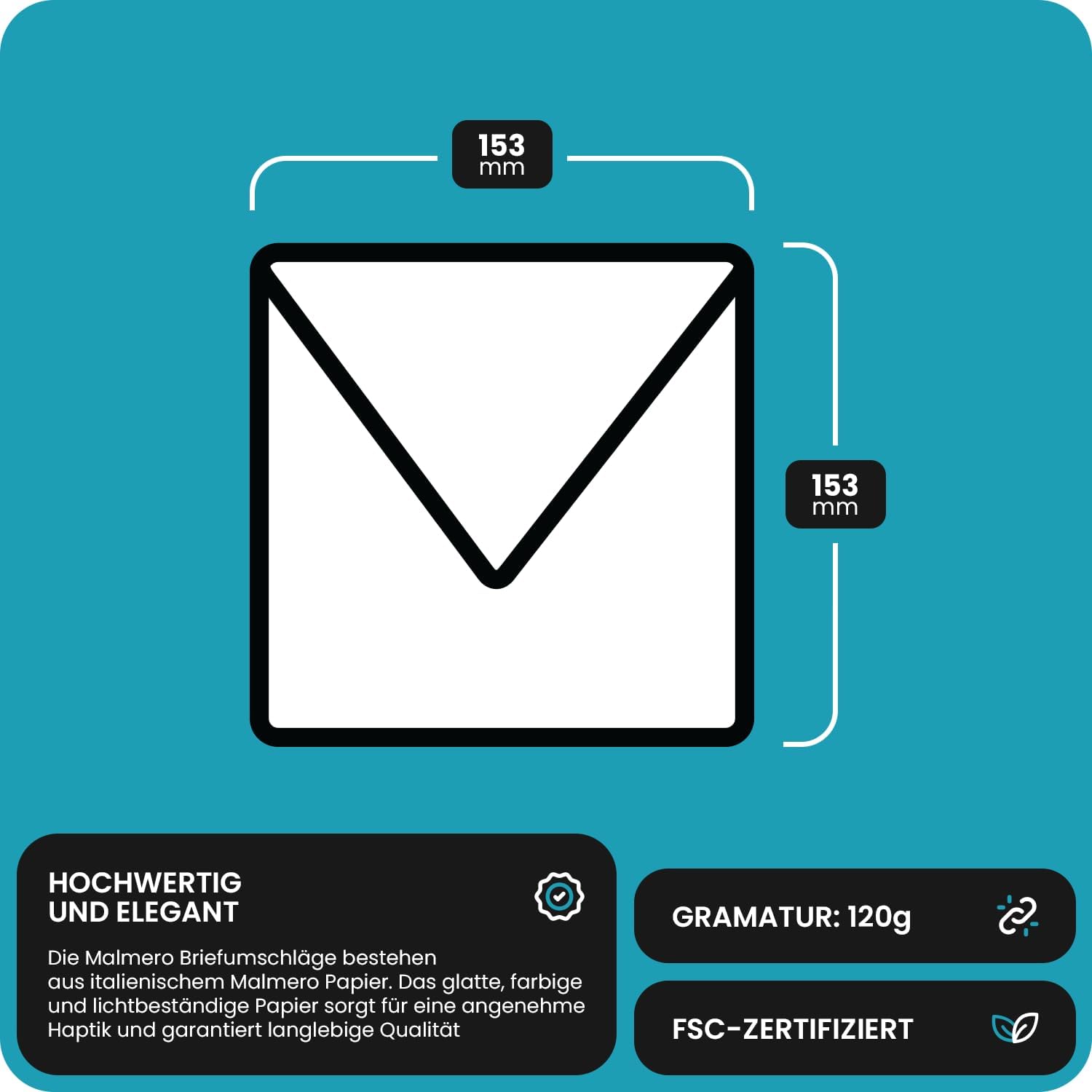 FORMATO CORRETTO – Le buste da lettera quadrate si distinguono per un aspetto raffinato e moderno. Sono spesso utilizzate per inviti, biglietti d'auguri, partecipazioni di matrimonio, compleanno o eventi speciali. ALTA QUALITÀ – Le buste Malmero sono realizzate in carta italiana Malmero con grammatura di 120 g/m². Questa carta liscia e colorata offre una piacevole sensazione al tatto e garantisce una qualità duratura. PRODOTTO ECOLOGICO – La carta Malmero è composta al 100% da pura cellulosa sbiancata senza cloro, proveniente da foreste gestite in modo sostenibile. Le buste sono riciclabili, perfette per chi ha a cuore l’ambiente. USO VERSATILE – Le buste kolorate Malmero sono la scelta ideale per inviti, corrispondenza raffinata o come confezione di lusso per occasioni speciali come Natale, matrimoni, compleanni e anniversari. SPECIFICHE TECNICHE – 25 buste quadrate (153x153mm), taglio a punta, lembo gommato; carta Malmero 120 g/m², certificate FSC. Il colore del prodotto offerto potrebbe differire da quello visualizzato sul monitor.