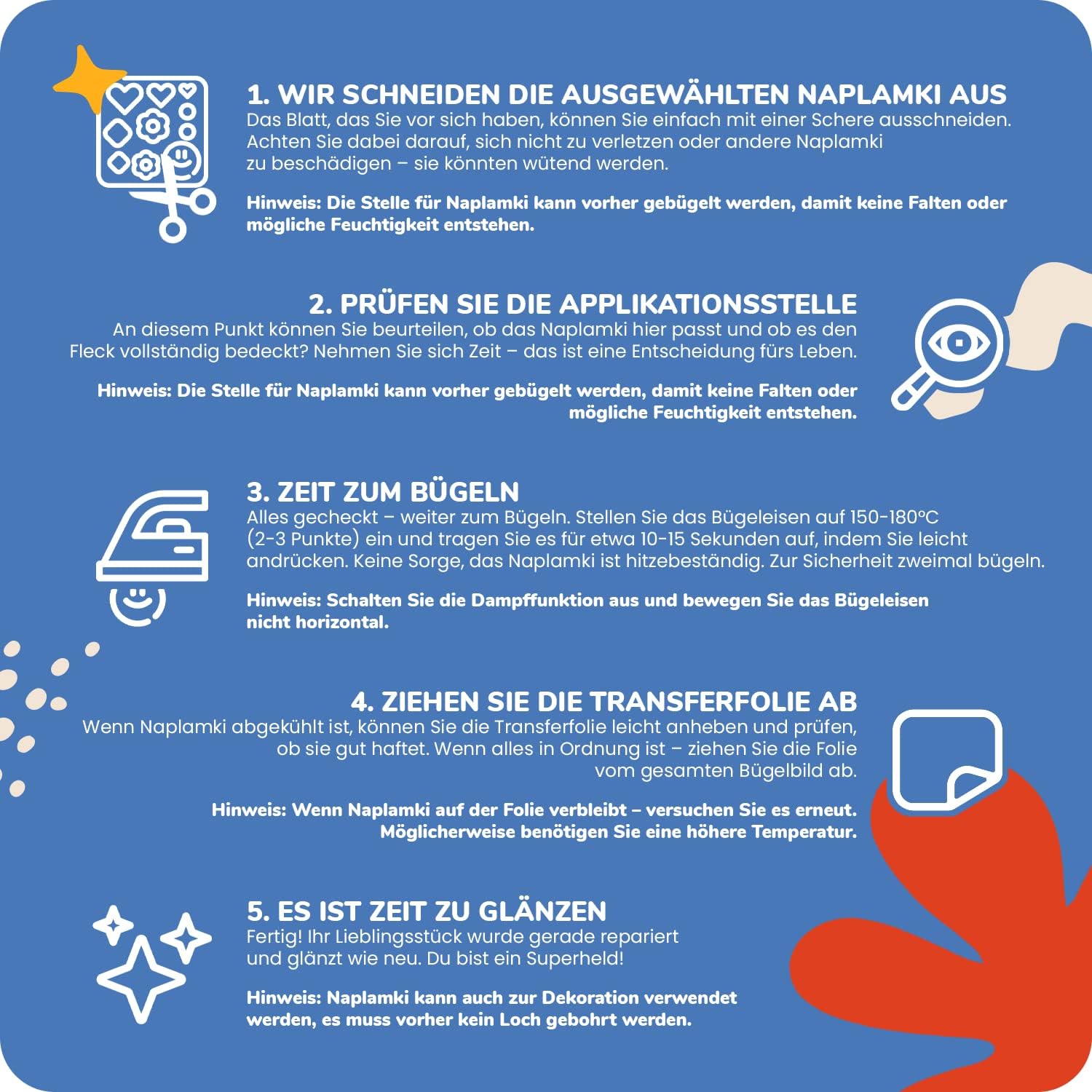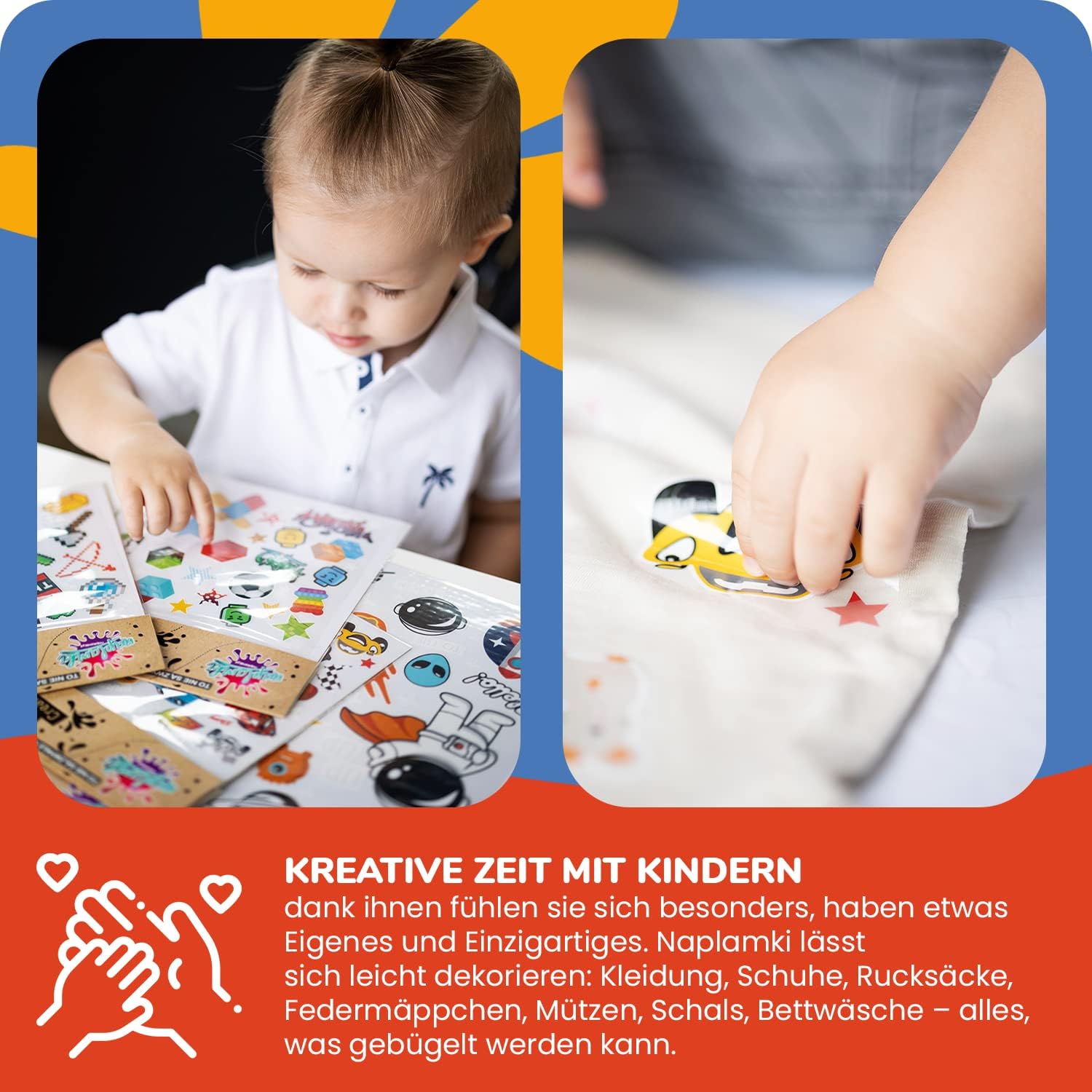 PER ABBIGLIAMENTO E ACCESSORE: le toppe da stiro Naplamki sono il modo più efficace per aggiungere valore, colore e carattere ai vecchi indumenti. Per decorare: con le nostre toppe si possono decorare tutto: vestiti, scarpe, zaini, astucci, cappelli, sciarpe, biancheria da letto. COPERTURA DELLE MACCHE: le toppe da stiro consentono di riportare in vita una maglietta o una tuta macchiata preferita Tempo creativo con i bambini: i bambini adorano le nostre toppe – grazie a loro si sentono speciali, hanno qualcosa di proprio e unico. Dati tecnici: 1 set di toppe termoadesive da 15 x 20 cm, in pellicola flessibile. Il pacchetto contiene anche istruzioni per l'uso.