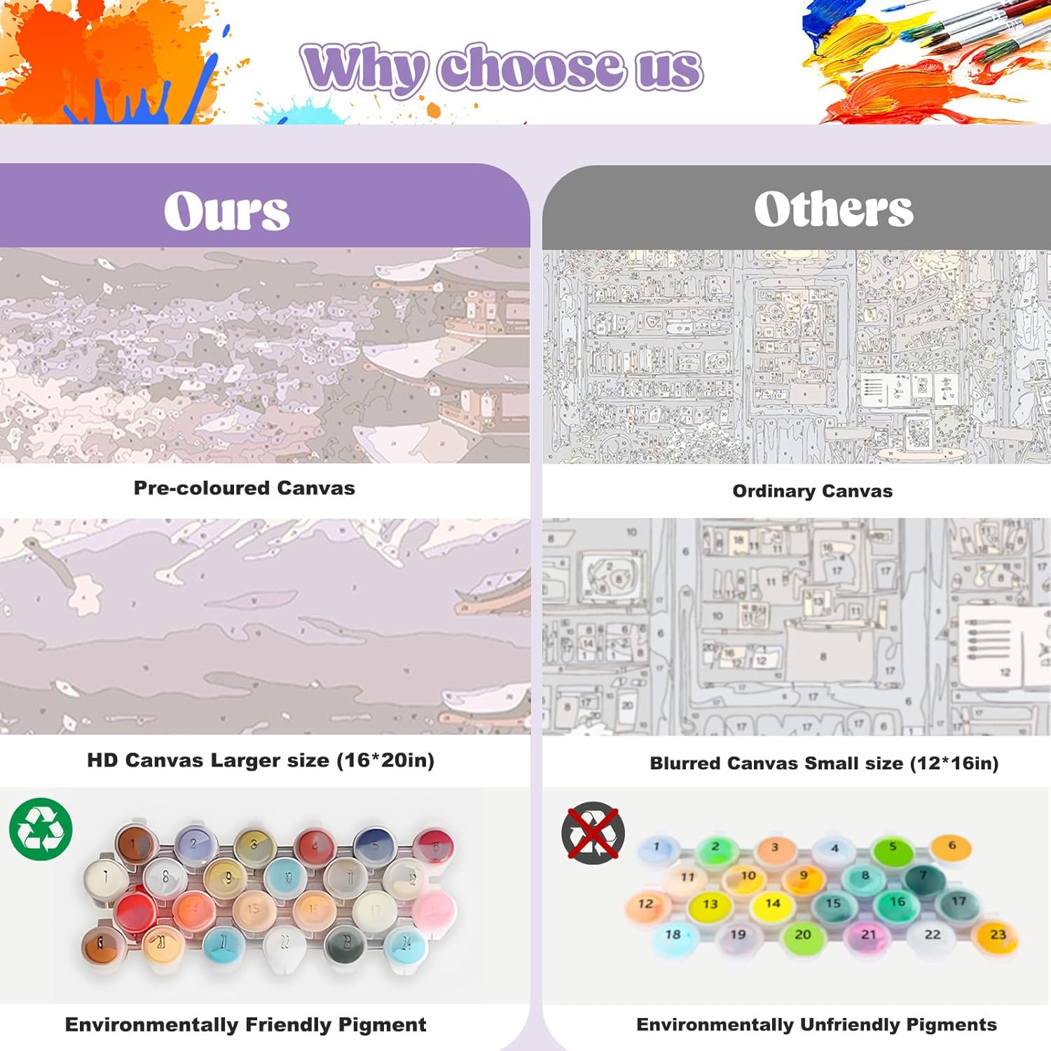 Facile da Disegnare:Il set di dipingere con i numeri per adulti presenta tela ad alta definizione,confezione indipendente di pigmenti,blocchi di colore trasparenti che sono chiaramente visibili,rendendo la colorazione più precisa e senza sforzo,anche per i principianti adulti che possono facilmente iniziare Tela Ad Alta Definizione:I numeri chiari sono pre-stampati sulla tela, rendendola facile da leggere.La tela ad alta definizione è resistente e facile da colorare,consentendo di conservare le opere a lungo e mostrando i migliori risultati Ampiamente Usato:La paint by numbers adulti è molto adatta per decorare uffici,aule,soggiorni,sale da pranzo,camere da letto,ecc.Non solo aggiunge atmosfera artistica,ma serve anche come decorazione squisita per migliorare la bellezza spaziale Promuovere l'interazione Sociale:Partecipare ad attività fai da te di dipingi con i numeri per adulti con la famiglia o gli amici può non solo migliorare le relazioni,ma anche stimolare la creatività e godere la gioia della creazione artistica insieme Miglior Regalo:La dipingere con i numeri kit per adulti è anche il miglior regalo per la famiglia e gli amici per esprimere i vostri migliori auguri.Ad esempio,regali di compleanno,regali di nozze,regali di Natale,regali di Pasqua,regali di ringraziamento,regali di festa della mamma e così via