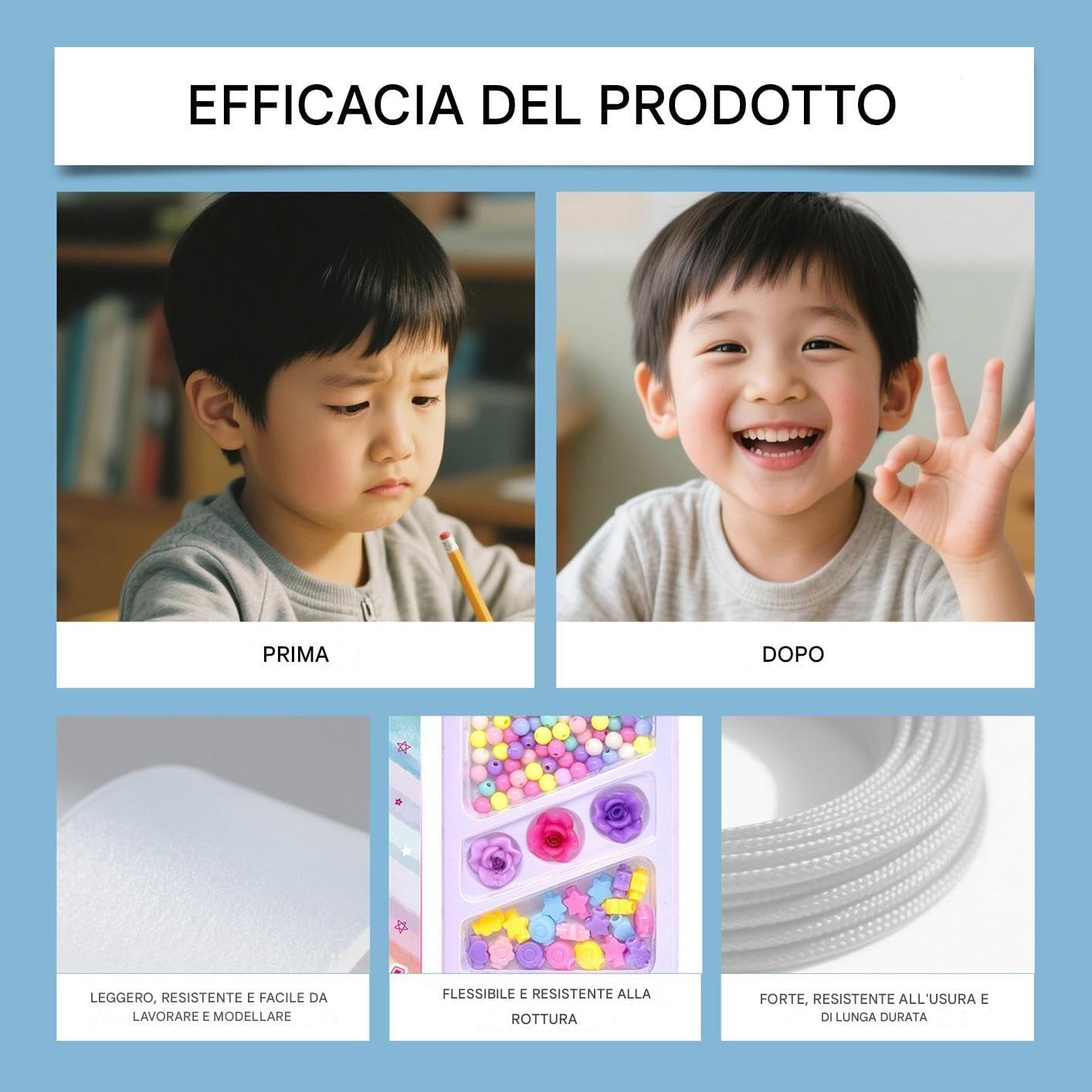 Design Stratificato Creativo: Il kit divertente per braccialetti include pendenti geometrici e simbolici, permettendoti di aggiungere un tocco stratificato al polso mentre mostri con semplicità un linguaggio di stile unico Varietà di perline vivaci: Utilizza perline vibranti e saturate per abbinamenti flessibili e sperimenta combinazioni di colori creative che accrescono lispirazione artistica durante la realizzazione dei bracciali Componenti ecologici premium: I materiali eco-compatibili di alta qualità e i bordi arrotondati prevengono irritazioni, offrendo una sessione di creazione affidabile e divertente per appassionati di braccialetti perline Creatività Pratica: Realizza braccialetti con massima facilità grazie al filo elastico incluso che elimina l'necessità di strumenti complessi, offrendo un processo di creazione fluido e accessibile per tutti Libertà di progettazione flessibile: La struttura forata riconfigurabile ispira creatività continua con smontaggio e rimontaggio immediati, aprendo possibilità di design per braccialetti più ampie e diversificate