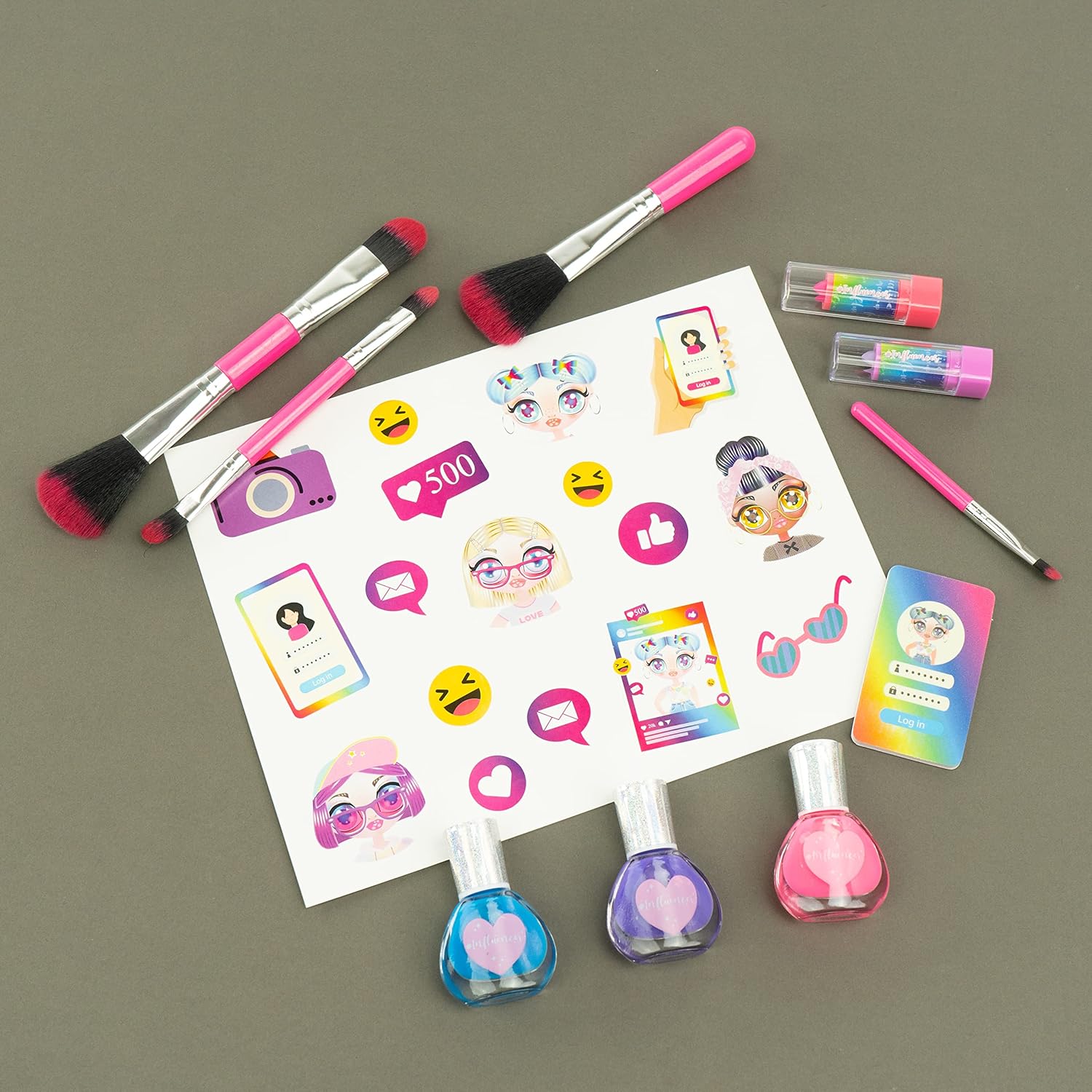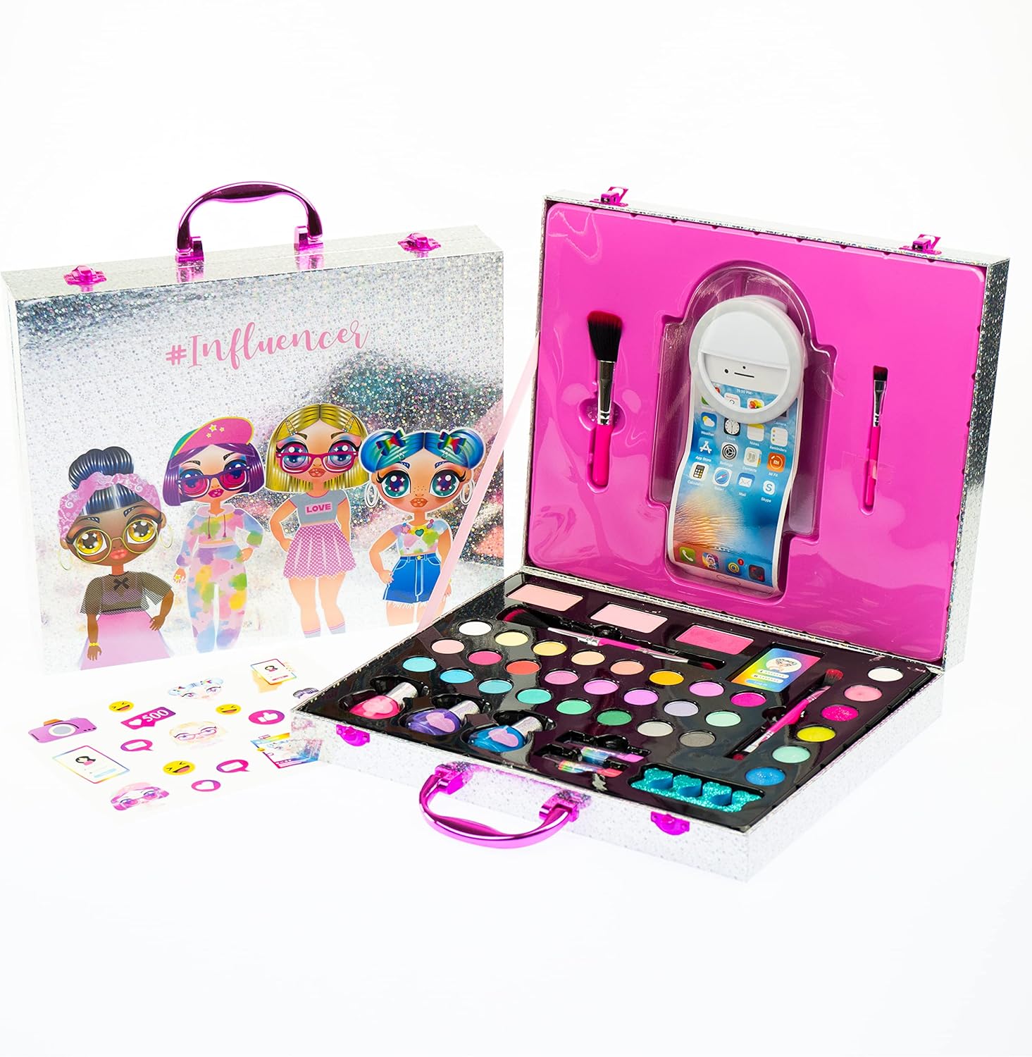 INFLUENCER SELFIE RING CASE: è una valigetta olografica scintillante, decorata con le immagini delle ragazze Influencer, che contiene un set di trucchi make up assortiti per bambine e un anello luminoso per scattare selfie perfetti. CARATTERISTICHE: il set da trucco per bambini è realizzato con materiali testati, sicuri, senza parabeni, atossici e risultano facilmente rimuovibili dalla pelle con l’uso dell’acqua e di detergente delicato. UTILIZZO: il Selfie Ring Case aiuta a stimolare la manualità, la coordinazione e le capacità di immaginazione di ogni bambino e bambina che vuole sentirsi da favola, senza porre limiti alla fantasia nei trucchi e travestimenti. DIMENSIONI: L 33 cm x A 27 cm x P 6 cm. Grazie alla forma compatta e alla pratica maniglia posta sulla parte superiore, la valigetta cofanetto la si può portare sempre con sé. CONTENUTO: ombretti, lip gloss, fard, smalti, lima per unghie, lucidalabbra stick, applicatori, anello selfie ring, foglio istruzioni. Età consigliata: 6 +