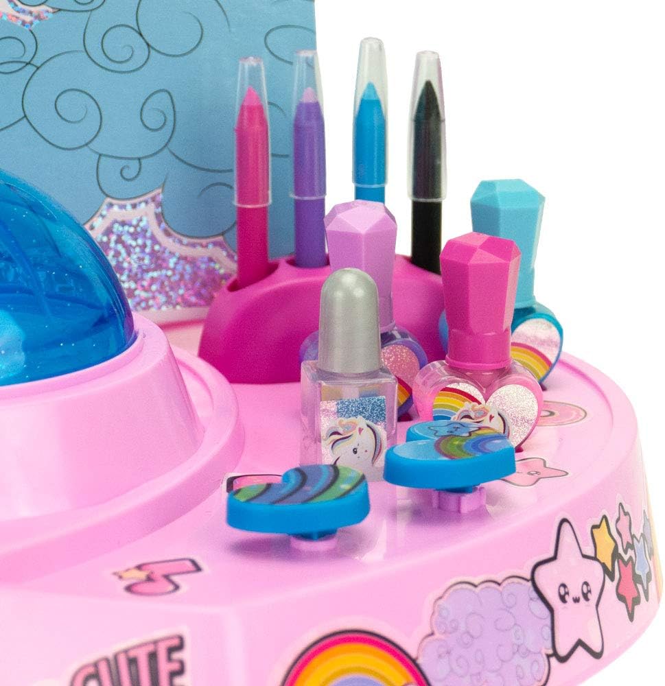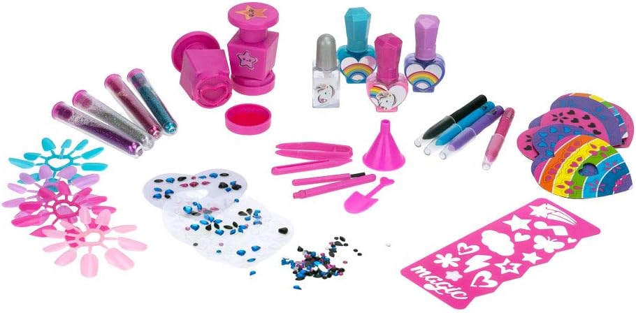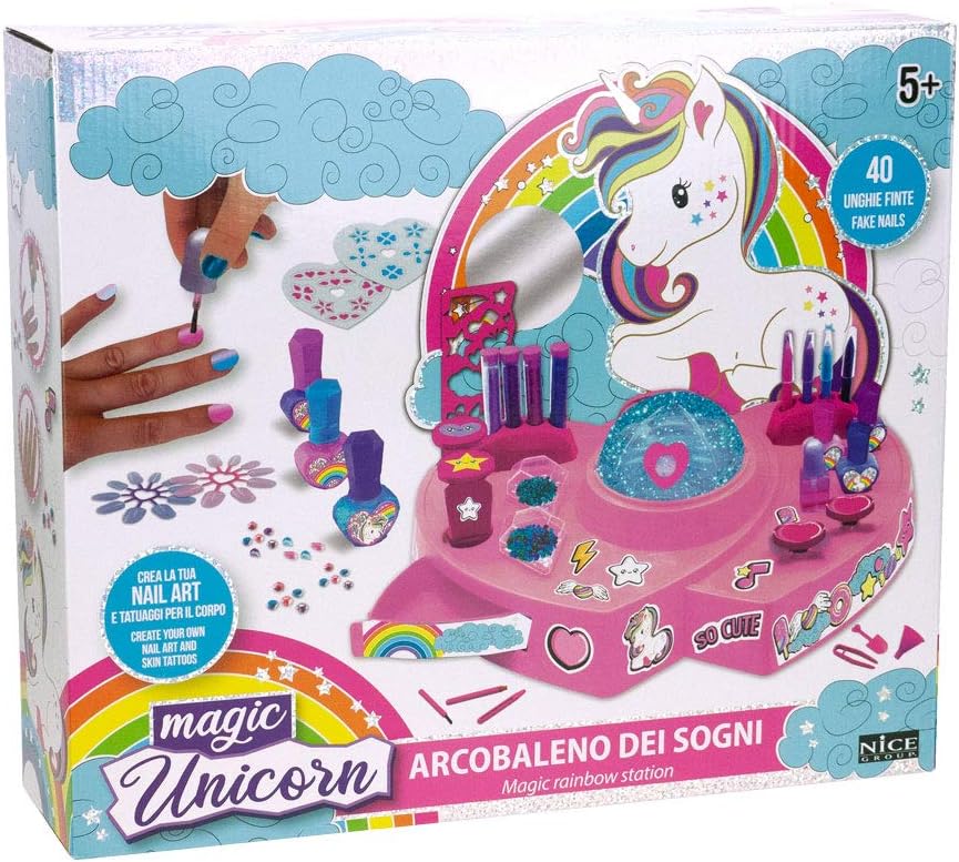 MAGIC DREAMS: Stazione MAKE-UP multiattività per decorare unghie, con tatuaggi per il corpo in 3D inclusi. CONTENUTO: questo set Magic Unicorn contiene 2 timbri, 6 fogli guida per decorazioni, 3 fogli autoadesivi per unghie, 3 fogli autoadesivi per tattoo, 4 set di unghie finte, 4 contenitori con polvere glitter, 1 foglio guida per tatuaggi, 4 smalti, 4 matite, accessori per svolgere le attività USO: è possibile creare adesivi per unghie 3D con gemme e brillantini e disegnare nuovi tatuaggi sul corpo grazie alle penne e al foglio guida per tattoo. E' un'attività creativa che si presta ad essere condivisa con gli amici durante feste, party e compleanni. PARTICOLARITA': se si stende la colla o lo smalto sulle unghia finte e si appoggia l'anello porta-unghie dentro la cupola, spargendo i brillantini glitter dentro la vaschetta, girando il pulsante a forma di cuore sulla station la macchina distribuisce i brillantini. DIMENSIONI: L 35 cm x A 36 cm x P 27 cm. Prodotto ORIGINALE Nice Group Età consigliata: 5+