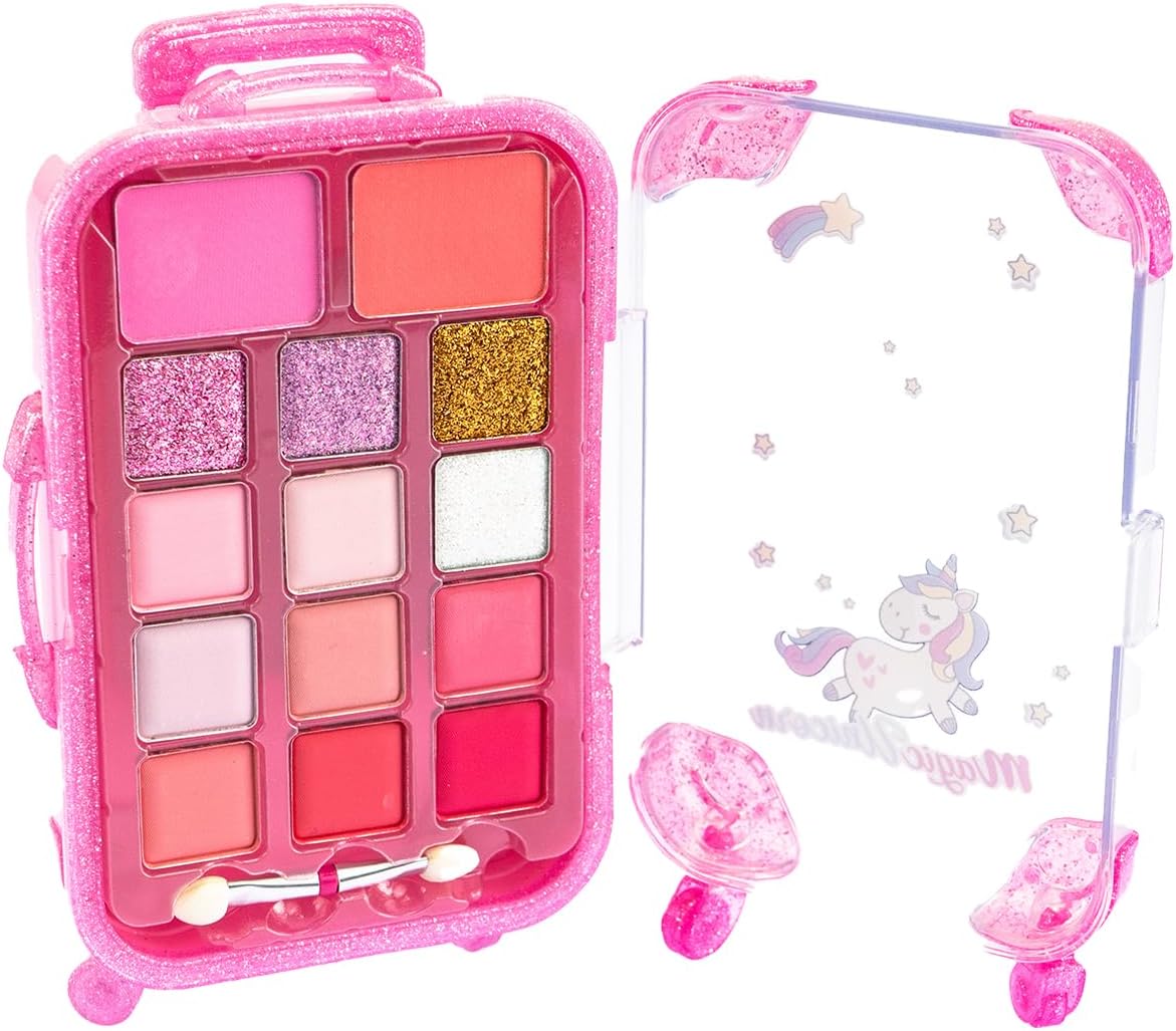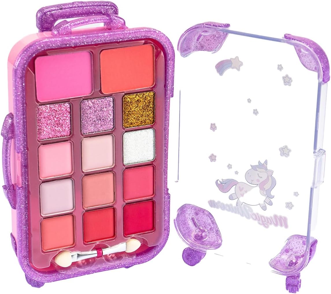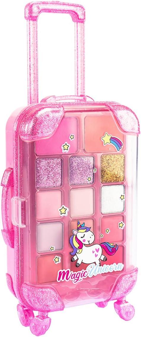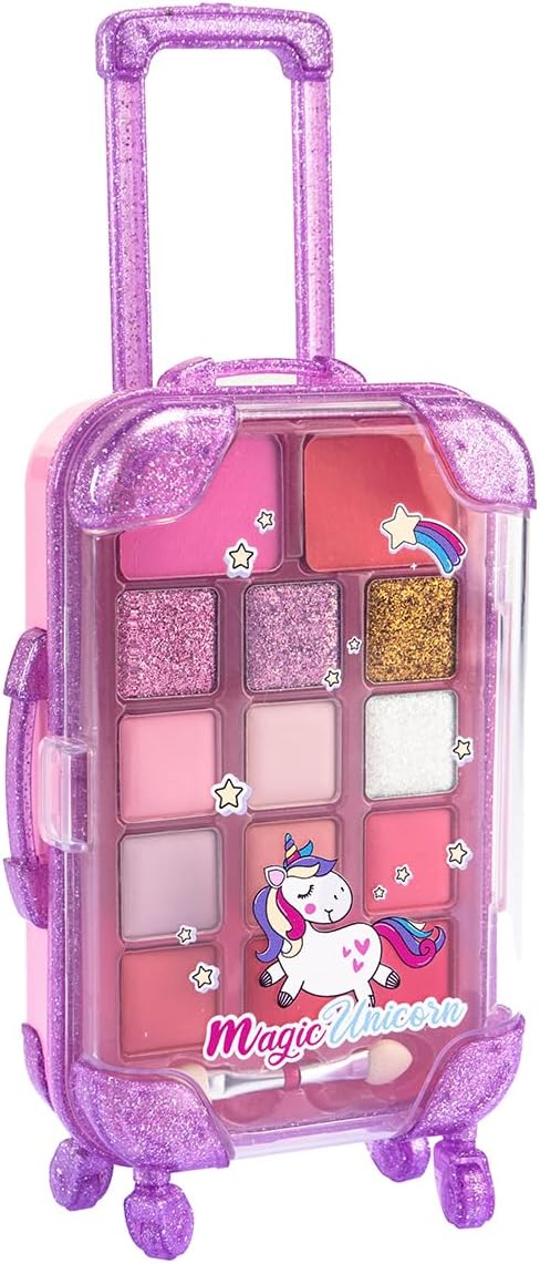 MAGIC UNICORN Trolley Make Up: simpatico cofanetto a forma di valigia trolley glitterato con kit di trucchi ombretti, fard e lucidalabbra. CARATTERISTICHE: il set da trucco per bambini è realizzato con materiali sicuri, testati, atossici, senza parabeni e risultano facilmente rimuovibili dalla pelle con l’uso dell’acqua e di detergente delicato. USO: il Trolley Trucchi del Magico Unicorno aiuta a stimolare la manualità, la coordinazione e le capacità di immaginazione di ogni bambino e bambina che vuole sentirsi da favola, senza porre limiti alla fantasia nella creazione di look alla moda adatti ad ogni occasione. DIMENSIONI: L 9,5 cm x A 17 cm x P 5 cm. Grazie alla forma compatta e alla pratica maniglia, il Trolley Make Up si può portare sempre con sé. CONTENUTO: 1 set di ombretti, lucidalabbra, fard, 1 applicatore. Età consigliata: 6 +