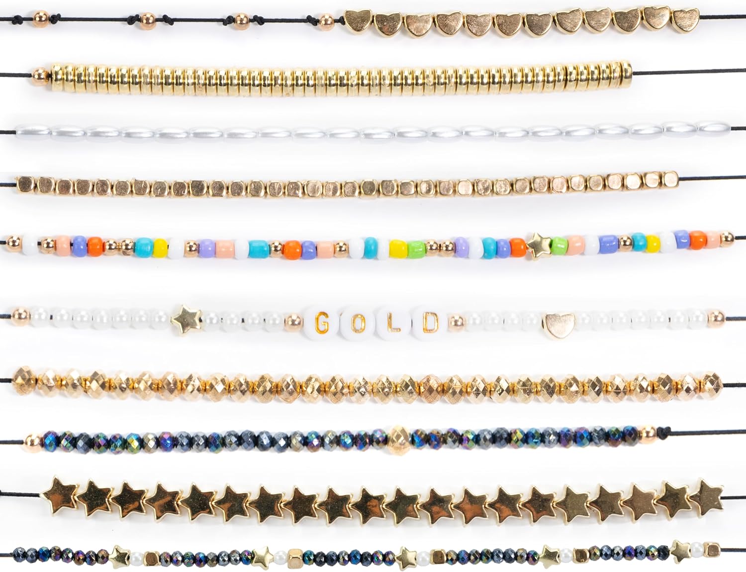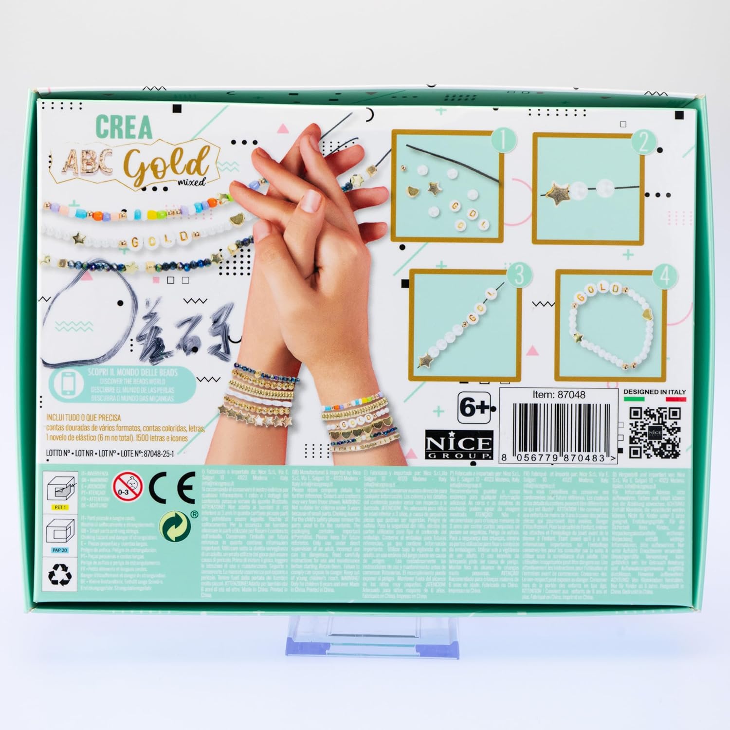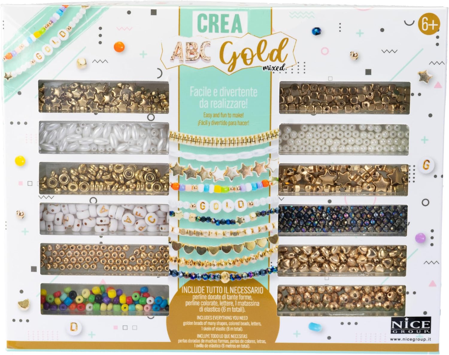 PERLINE ABC Gold Mixed: Set di 600 perline fashion in stile “gold”, di diversi colori e con lettere e icone dorate, utili per inventare braccialetti e accessori decorativi. CONTENUTO: la confezione è arricchita da perline abc di colore bianco a forma sferica ed a forma ovale, perline di colore dorato a forma sferica, di cubo, di stella, di cuore e di rondelle e perline colorate, con 52 lettere vocali e consonanti e 6 m di filo elastico per creare braccialetti, collane e decorazioni. USO: ottima idea per coinvolgere i bambini durante un compleanno, in attività extra scolastiche, consentendo loro di esprimere la creatività, personalizzando i bracciali con il loro soprannome o il loro motto preferito. DIMENSIONI: L 22 x A 17,5 x P 3,5 cm. Prodotto ORIGINALE Nice Group. Età consigliata: 6+