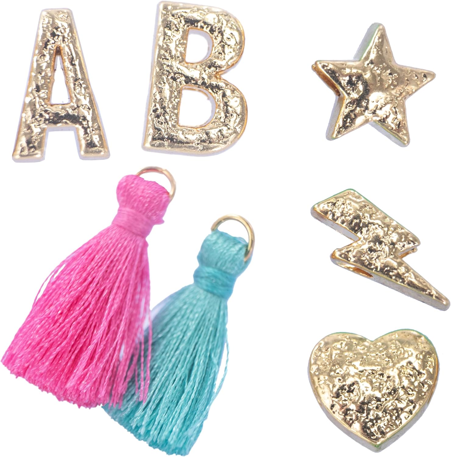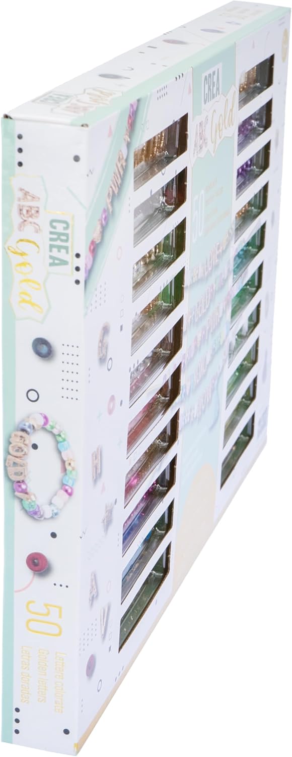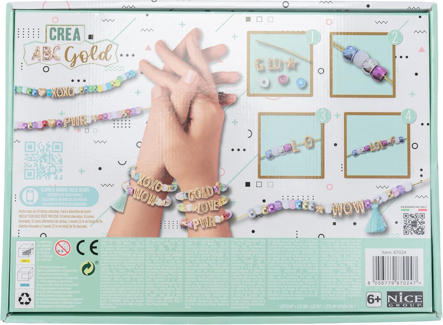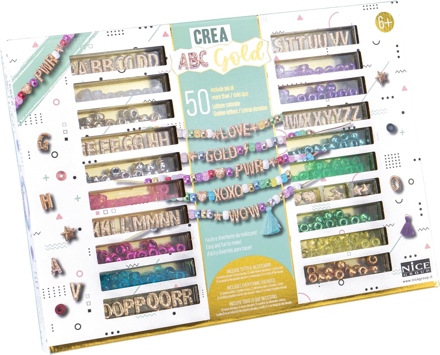 PERLINE ABC Precious Gold: Set di oltre 300 perline fashion in stile “gold”, di diversi colori e con lettere e icone dorate, utili per inventare braccialetti e accessori decorativi. CONTENUTO: la confezione è arricchita da 260 perline abc di colore pastello e metallizzato a forma sferica, con 6 ciondoli a cuore, stella, fulmine, con 52 lettere vocali e consonanti e 7 m di filo elastico dorato per creare braccialetti, collane e decorazioni. USO: ottima idea per coinvolgere i bambini durante un compleanno, in attività extra scolastiche, consentendo loro di esprimere la creatività, personalizzando i bracciali con il loro soprannome o il loro motto preferito. DIMENSIONI: L 33 x A 24 x P 3. Prodotto ORIGINALE Nice Group. Età consigliata: 6+