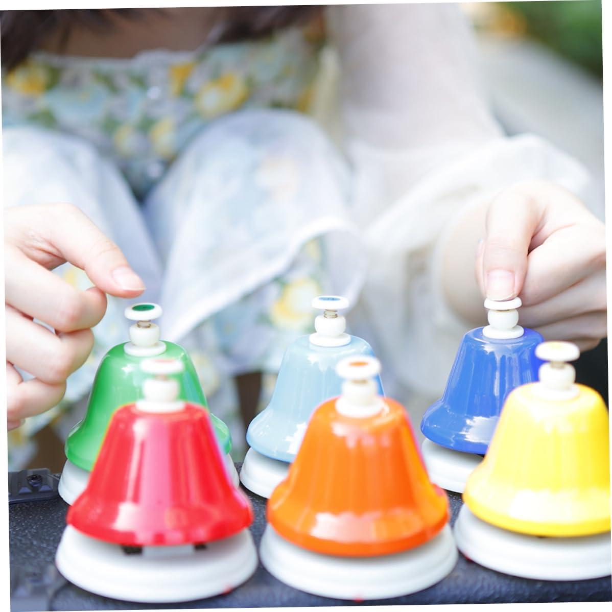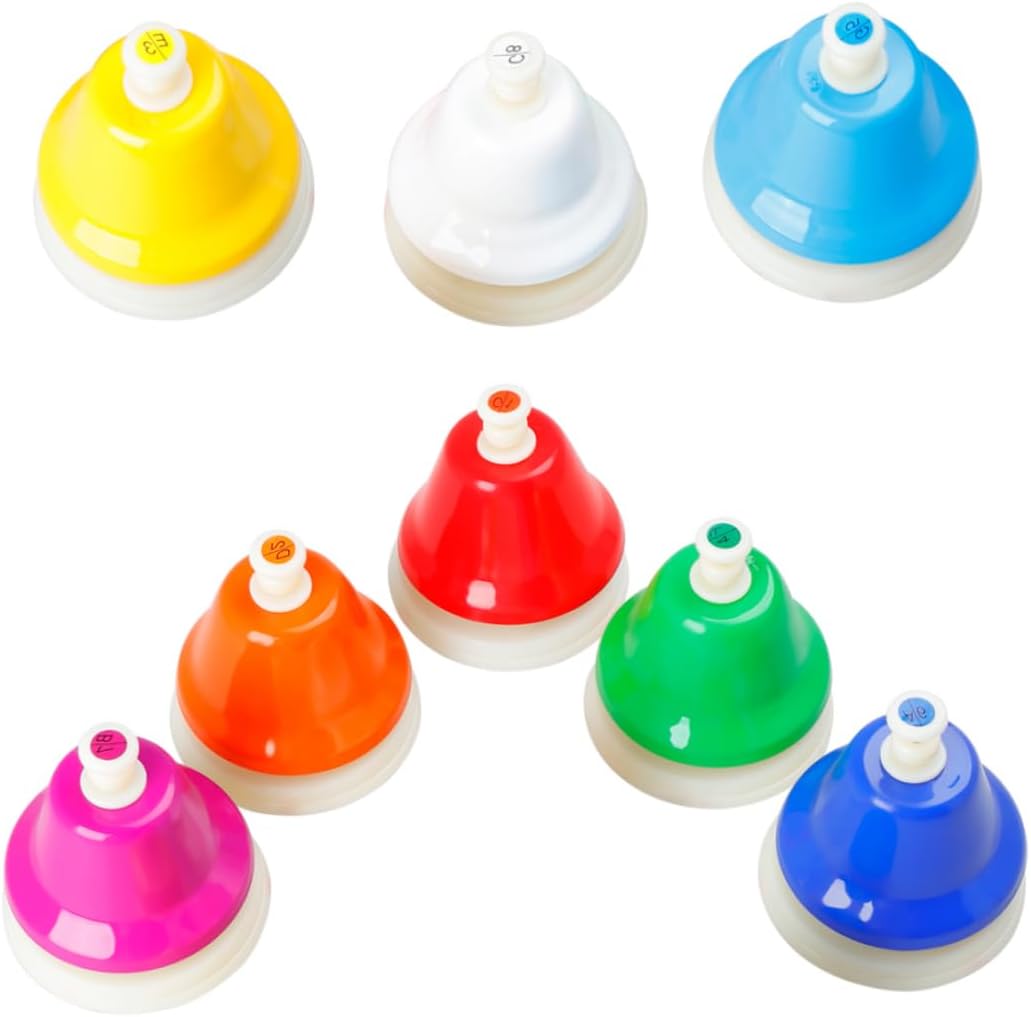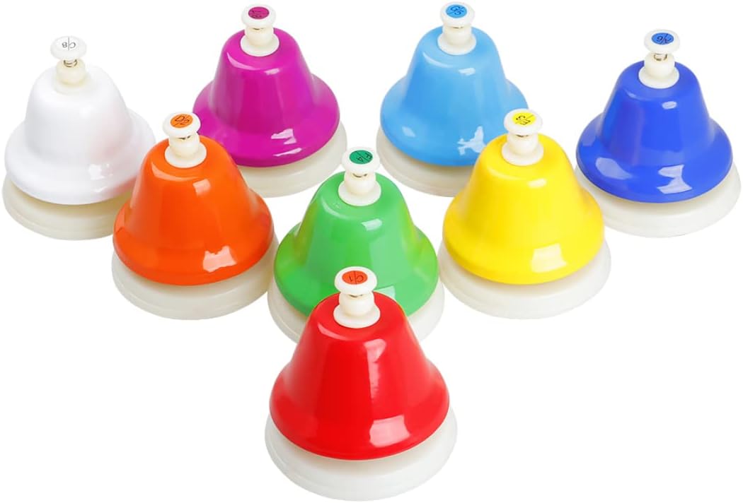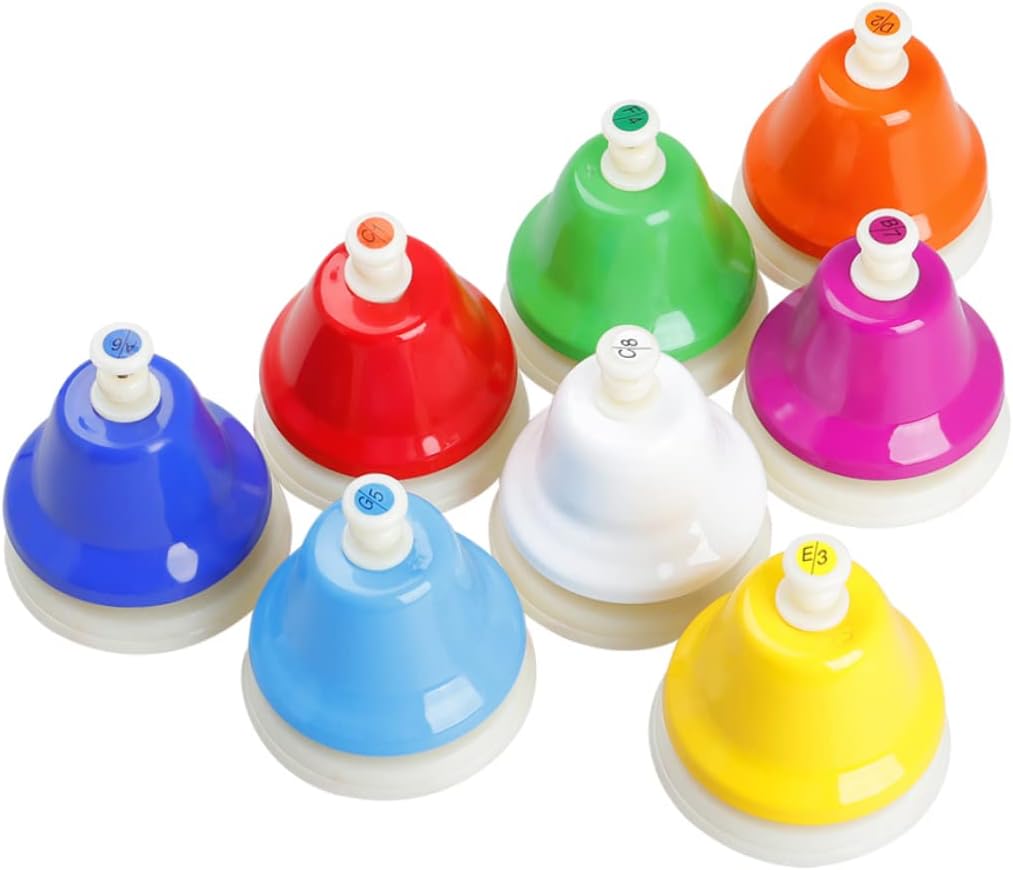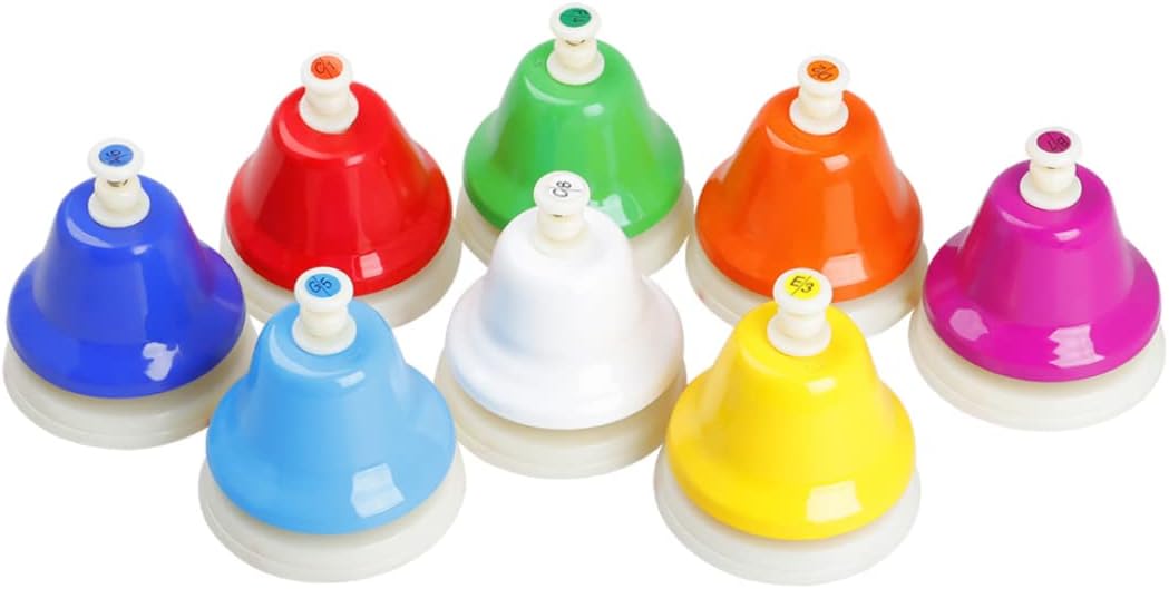 La molla del campanello è forte e ha una buona flessibilità ed è facile suonare il campanello..Basta toccare la parte superiore del campanello della scrivania per emettere un suono meraviglioso! Il kit campanello a mano in metallo cromatico con 8 brani spazia da C, D, E, F, , A, B, suono di gioia con tono di C alto..Come giocattolo offrirà un divertimento senza fine e come strumento musicale permetterà ai bambini di giocare immediatamente con le lettere o i colori. I campanelli da scrivania sono realizzati in metallo e plastica di alta qualità, pregevole fattura, adatti ai bambini per giocare e imparare la musica..La graziosa forma a campana e la varietà di colori design, esercitano la percezione del colore del bambino. 8 campanellini in metallo colorato sintonizzato sono contrassegnati con la nota e il numero pertinenti per aiutare i bambini a imparare la scala musicale e contrassegnati su entrambe le maniglie e sulla parte superiore della campana, facili da riconoscere per principianti o bambini Ci sono tre cuscinetti antiscivolo nella parte inferiore della campana, che rendono difficile lo scivolamento mentre suona..Oscilla a sinistra e a destra per far sì che le parti interne colpiscano la campana ed emettano un suono.