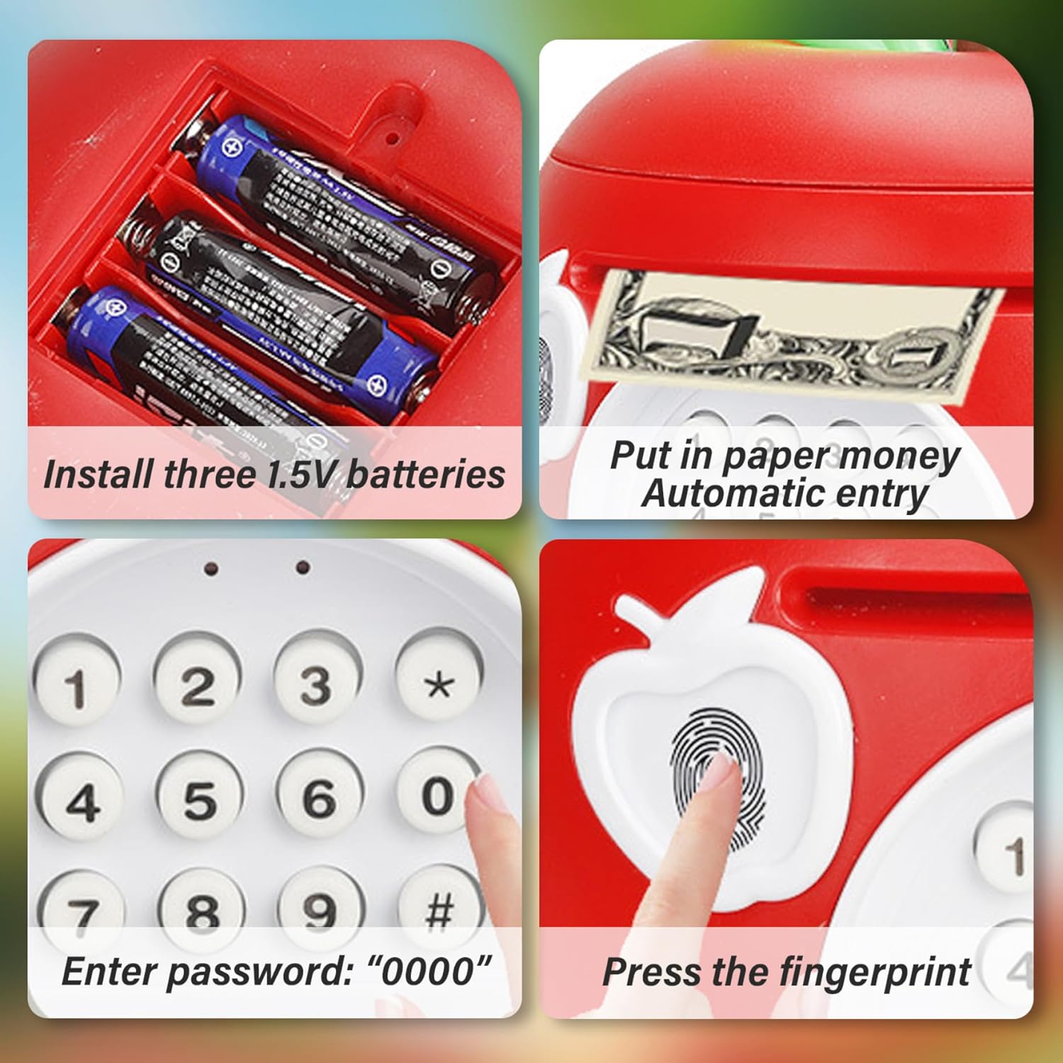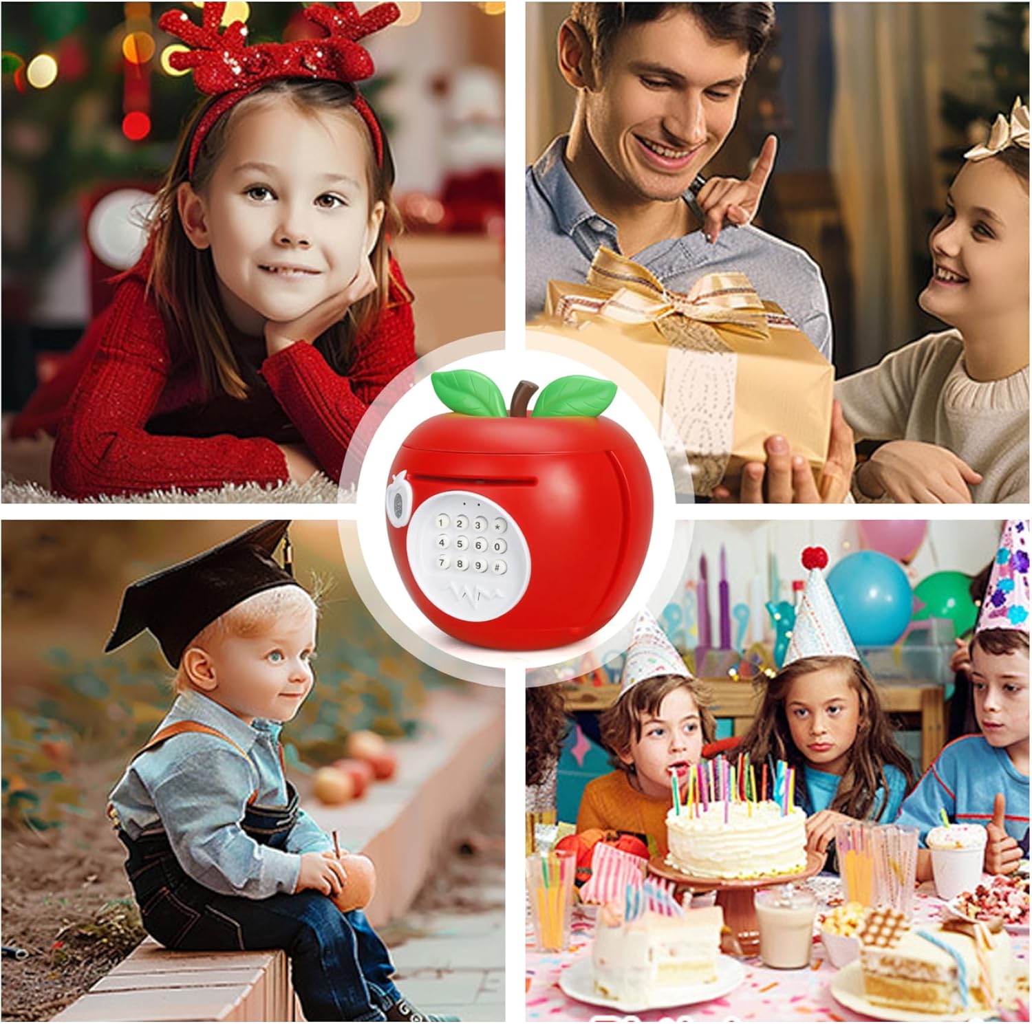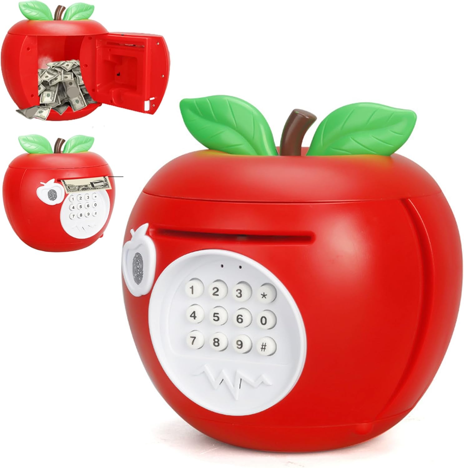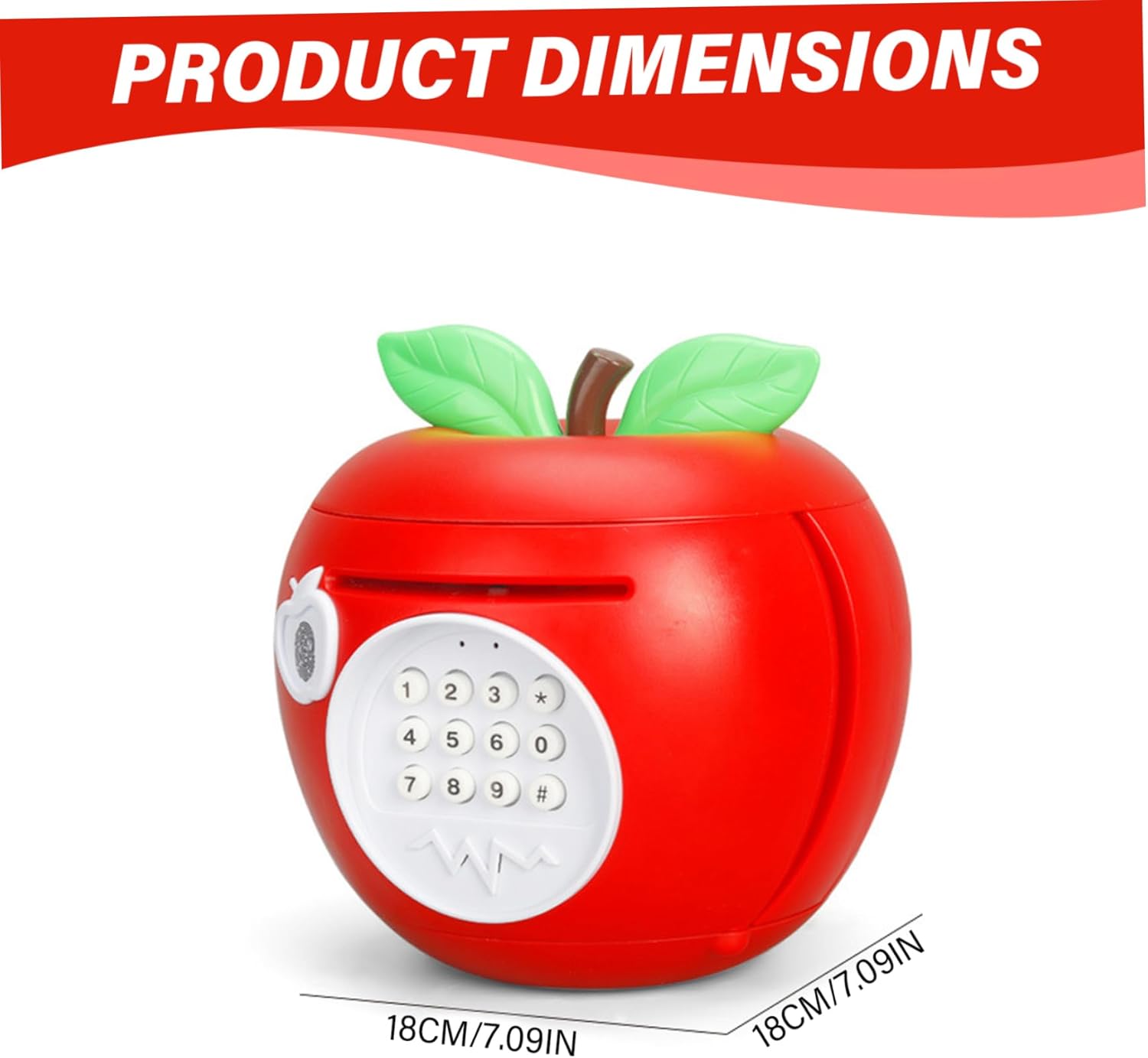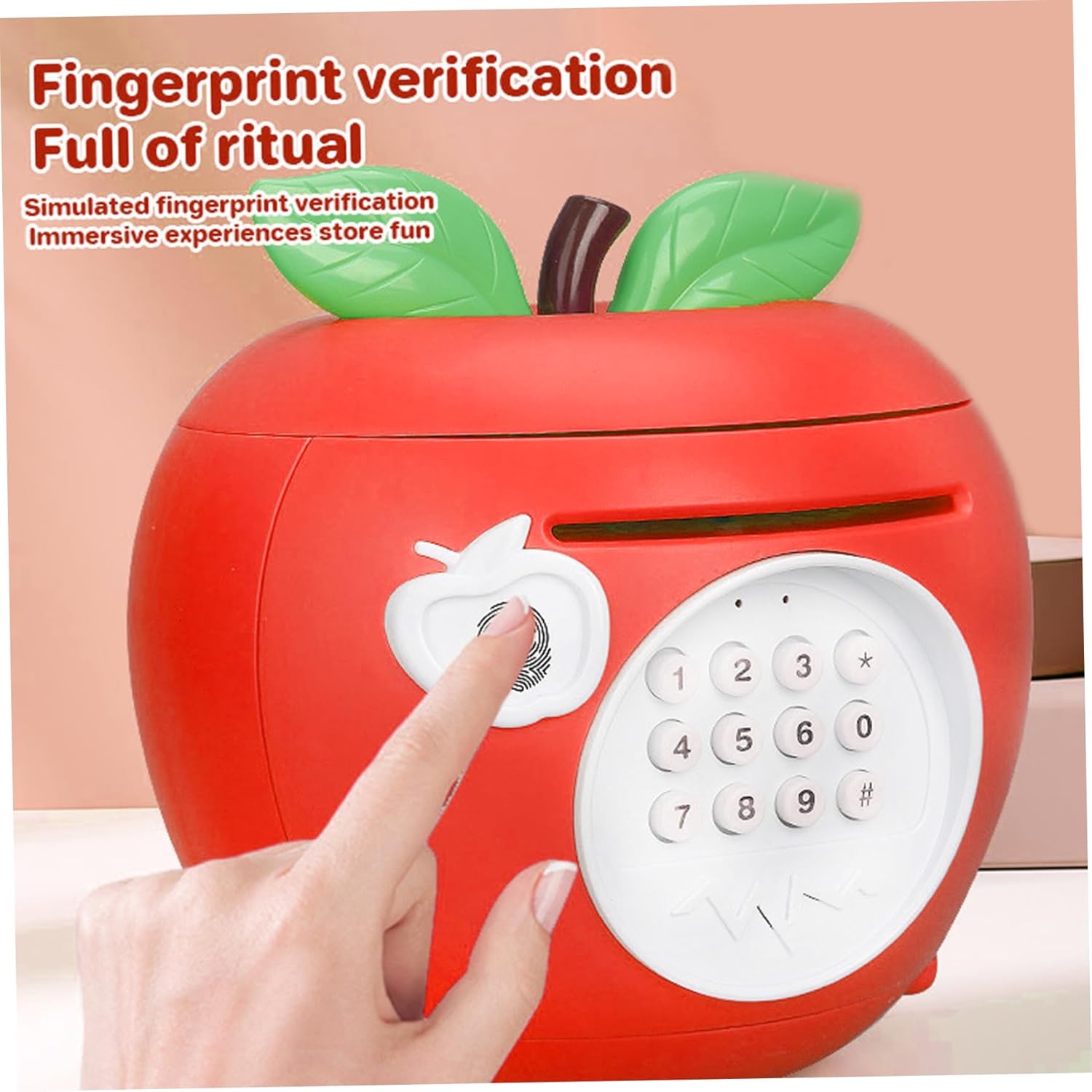 Combinazione di decorazioni e funzioni: non solo una cassetta di risparmio: questa graziosa banca di mele funge anche da giocoso elemento decorativo per rallegrare asili nido o aree giochi. Costruzione stabile a misura di bambino: realizzato con materiali di qualità e non tossici, questo salvadanaio è robusto e sicuro per le mani dei più piccoli, da usare quotidianamente senza preoccupazioni. Scelta educativa: un regalo premuroso per un compleanno o per le vacanze che insegna ai bambini l'importanza del risparmio e della responsabilità finanziaria in un modo che sembra un momento di gioco. Divertimento elettronico interattivo: slot per monete elettroniche integrato (batteria non inclusa) per bambini un modo divertente e interattivo per risparmiare denaro, trasformando il risparmio quotidiano in un'attività gioiosa. Affascinante design a forma di mela: a forma di mela luminosa e sorridente, questo adorabile salvadanaio aggiunge un tocco giocoso a qualsiasi cameretta o cameretta, deliziando sia i bambini che i genitori.