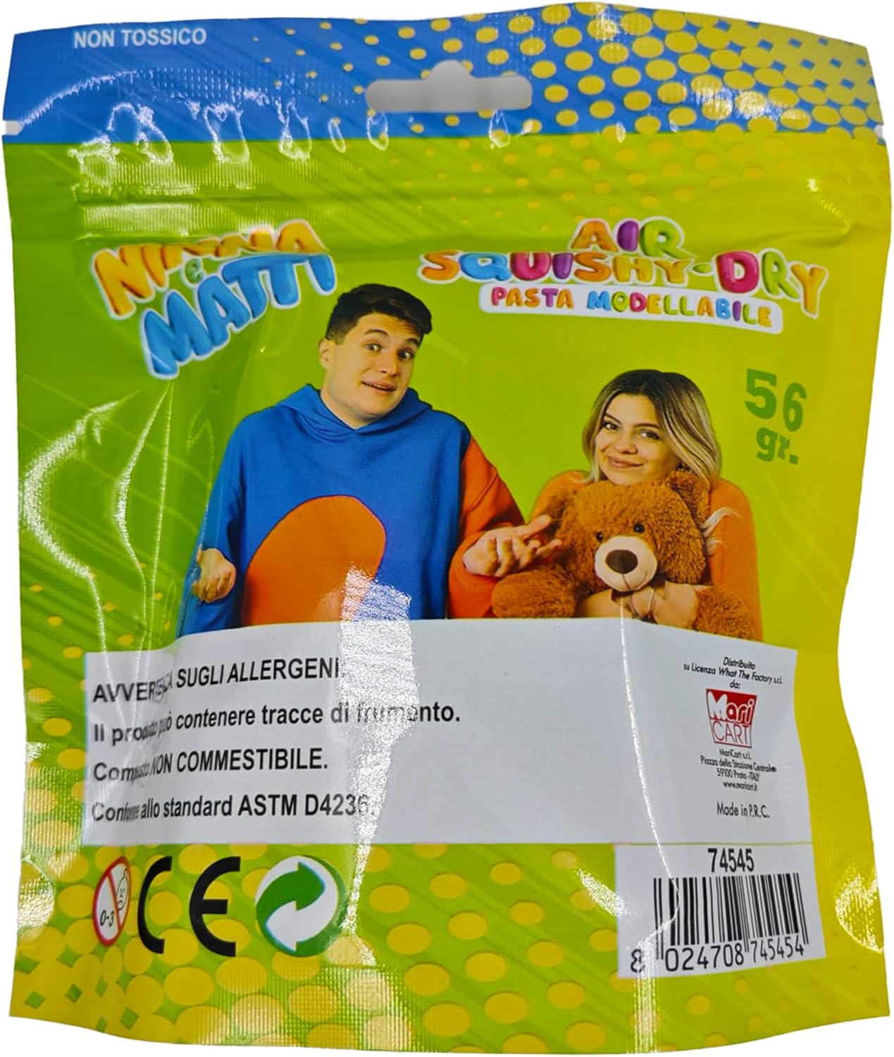 Pasta modellante: Air Squisy Dry in bustina da 56 grammi Colore random: blu, rosso, giallo Facile da usare: morbida e delicata, è facile da maneggiare Sicura: atossica, non macchia, certificata CE.