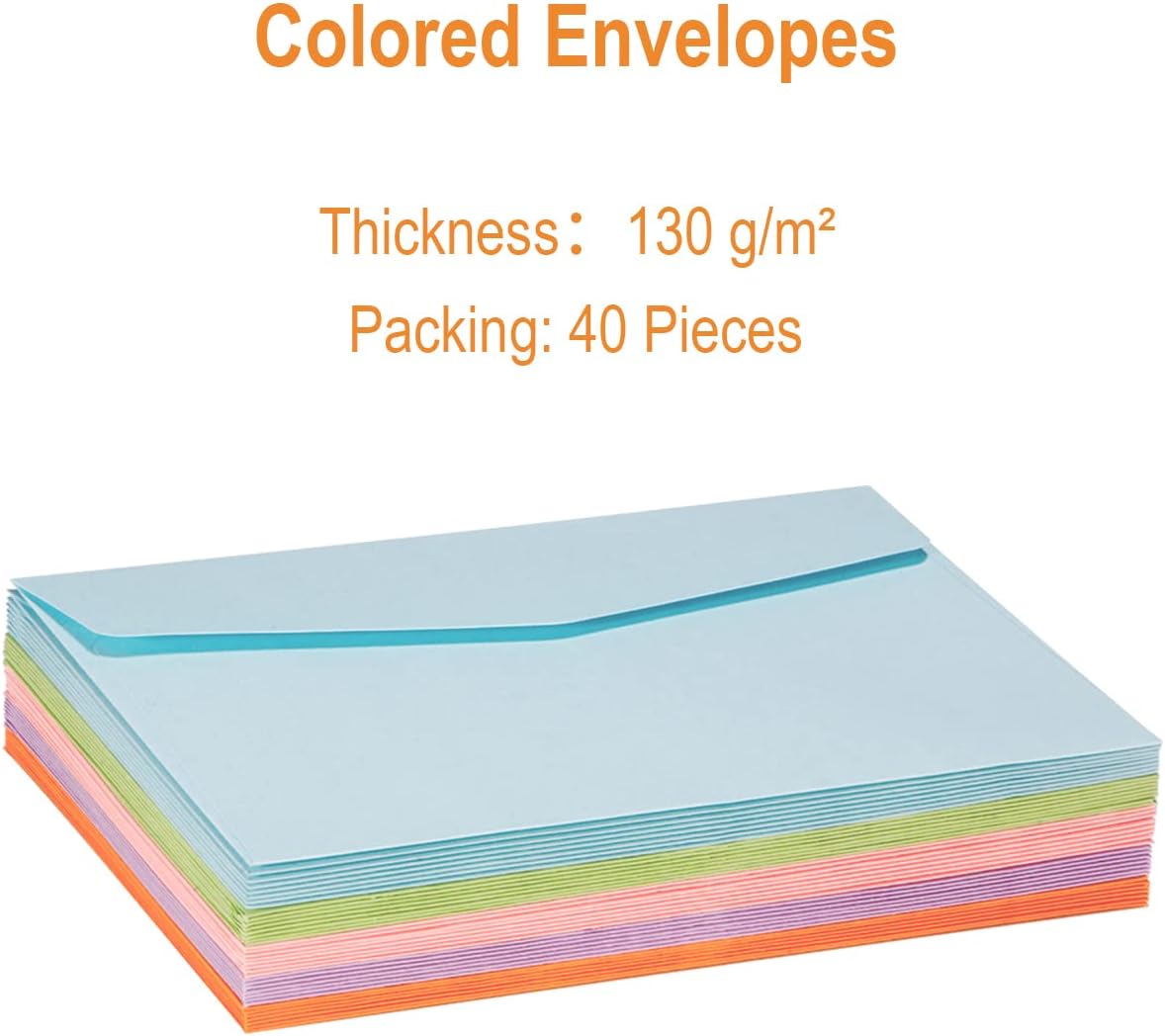 💌40 pezzi Buste: dimensioni: 16 x 11 cm (C6 buste). 💌5 Colori Assortiti: 5 bellissimi colori in totale e 8 buste lettere per colore, una gamma completa di colori e quantità per soddisfare le vostre diverse esigenze. 💌Set Piccole Buste DIY: buste da lettera colorate sono vuoti e adatti per il fai da te, puoi disegnare qualsiasi immagine o scrivere tutto quello che vuoi dire e inviare ad amici o familiari nella giusta occasione. 💌Ampie Applicazioni: La busta lettere sono adatte per biglietti da regalo personalizzati, buste per il Ringraziamento, inviti, biglietti d'auguri, biglietti di Natale, biglietti da visita, può essere utilizzato anche per contenere piccoli regali.