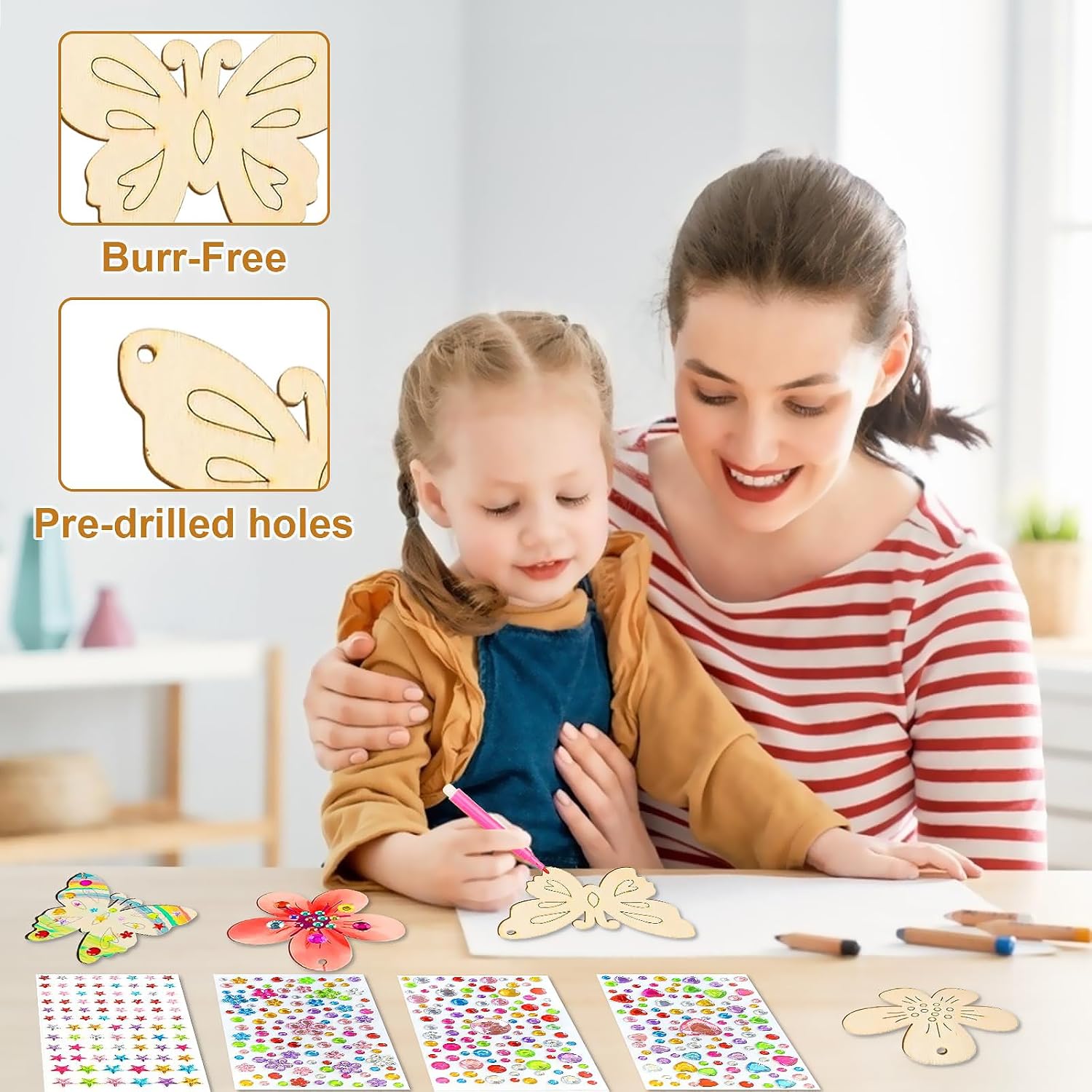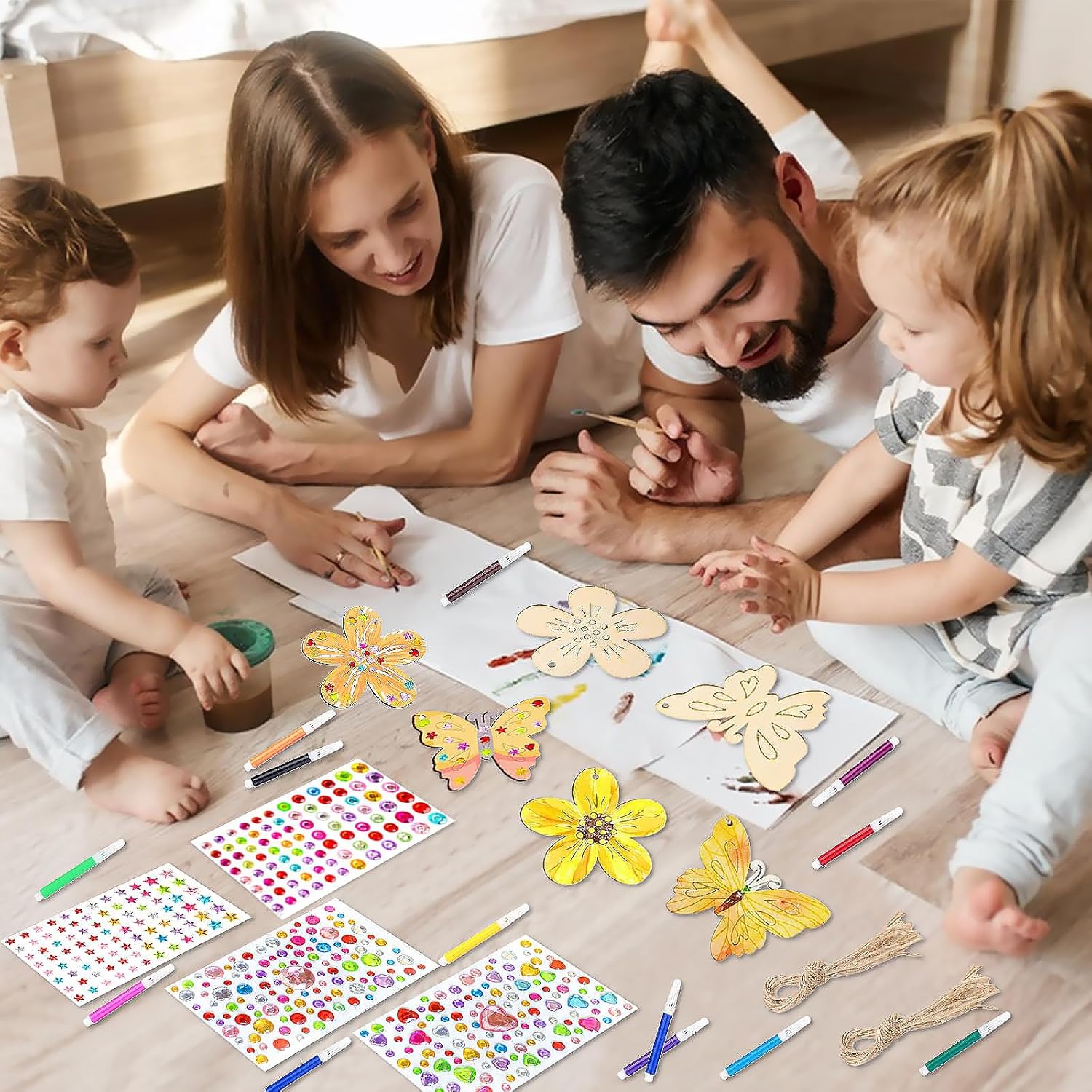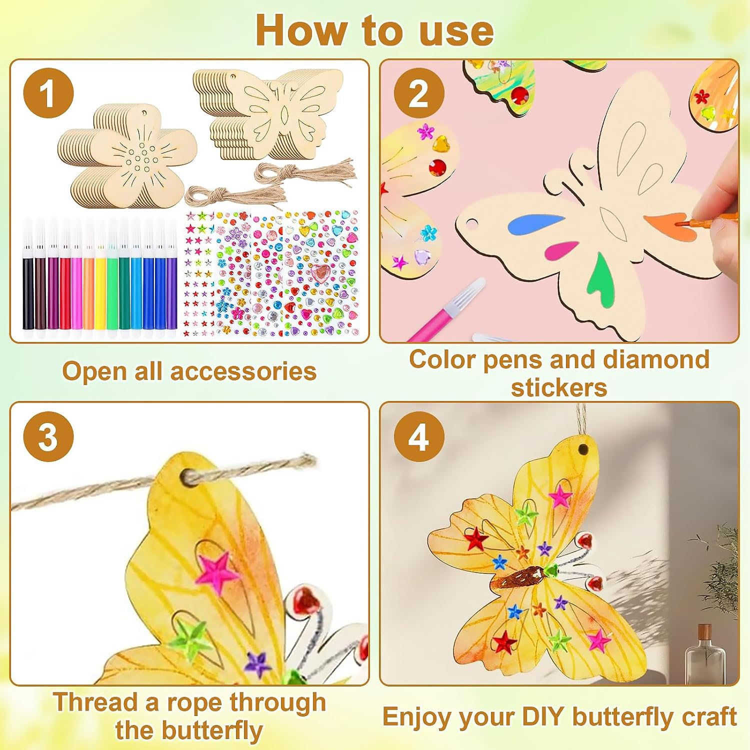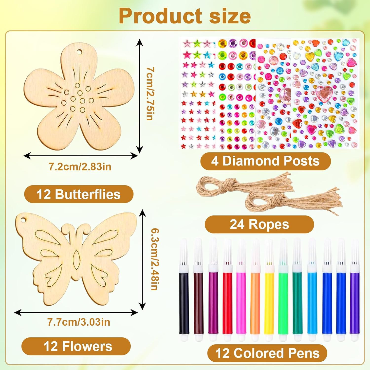 Set di Lavoretti per Bambini: Questo kit farfalle include 12 farfalle in legno non dipinte, 12 fiori in legno, 12 pennarelli acquerellabili, 4 adesivi con gemme e 30 nastri decorativi. Questo kit farfalle include tutti gli accessori necessari per soddisfare appieno le esigenze fai da te del tuo bambino Materiali di Alta Qualità: Questo lavoretti creativi per bambini è realizzato in legno di pioppo di alta qualità, robusto e a grana fine, con bordi finemente lucidati per una finitura liscia e senza sbavature. Lavoretti creativi per bambini include inoltre 30 cordini per appendere i ciondoli a forma di farfalla e fiore Decorazioni Creative: I ricchi elementi decorativi di questo legno decorazione kit creativo ispireranno la creatività dei bambini. Usa matite colorate per dipingere le farfalle e i fiori in legno, quindi decorali con adesivi a forma di diamante. Questo legno decorazione kit creativo permette ai bambini di liberare la loro immaginazione e creare i propri pezzi decorativi creativi Giocattoli Educativi: Questo set per fai da te in legno per bambini incoraggia i bambini a usare le mani e la mente mentre realizzano i lavoretti a forma di farfalla e fiore, sviluppando le capacità motorie fini e la coordinazione occhio-mano. Grazie all'abbinamento dei colori e al design creativo, set per fai da te in legno per bambini stimola anche il senso estetico e la creatività dei bambini Usi Versatili: Una volta completato, questo set per bricolage per bambini può essere utilizzato come decorazione creativa per una festa di compleanno, aggiungendo un tocco di atmosfera festosa. Può anche essere regalato a un amico per un compleanno. Questo set per bricolage per bambini permette ai bambini di sperimentare la gioia del fai da te in una varietà di contesti
