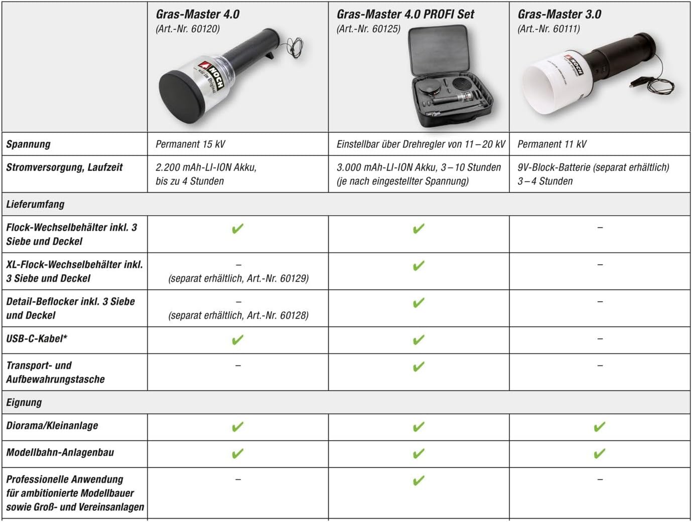✅ Design innovativo: il Gras-Master 3.0 è compatto e potente, ideale per i modellisti. ✅ Attrezzatura completa: contiene tre filtri (fini, medi, grossolani) per fibre di erba di diverse lunghezze. ✅ Prestazioni a lunga durata: alimentato con batteria da 9 V, consente 3-4 ore di rasatura. Facile da usare: funzionamento con adesivo NOCH erba e morsetto per polo opposto per risultati migliori. ✅ Versatile: perfetto per modellismo, diorami e paesaggi in tutte le scale comuni.