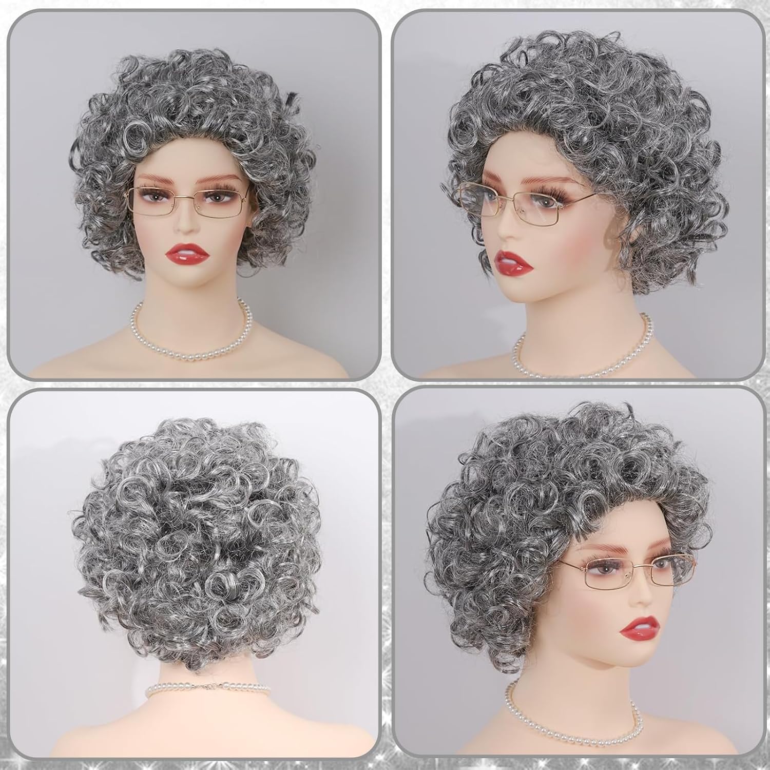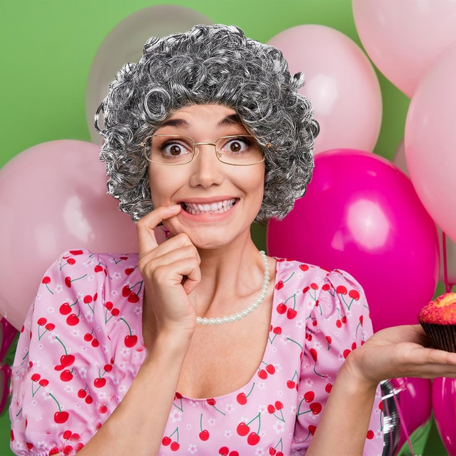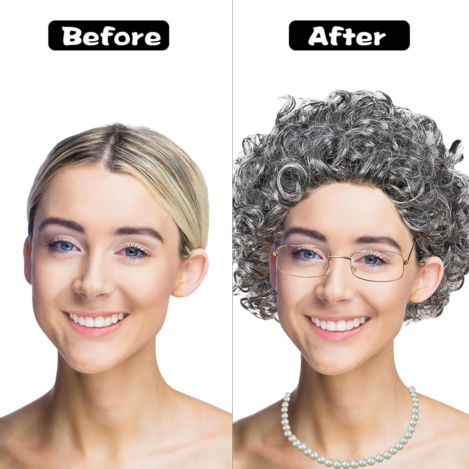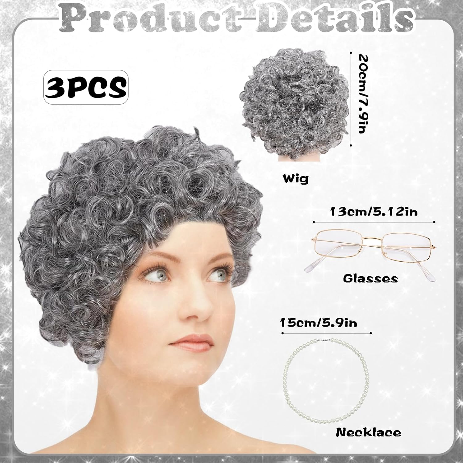 【Nonna Costume Carnevale】 Riceverai 1 parrucca della nonna, 1 collana di perle e un paio di occhiali, incluso tutto il necessario per il gioco di ruolo. Può essere abbinato a qualsiasi outfit e ripristinare facilmente la vera immagine della vecchia signora. 【Comodo da Indossare】la parrucca è realizzata in fibra sintetica, morbida al tatto, traspirante e confortevole, ha una consistenza realistica e si adatta alla testa e non ti sentirai soffocante o a disagio anche se la indossi per molto tempo. 【Misura Universale】La collana di perle è lunga circa 45 cm e fissata con una chiusura a moschettone, che è stabile e non facile da staccare. È adatta a varie linee di collo e aggiunge un tocco di eleganza e fascino al tuo look generale. 【Strumenti per la Fotografia】Gli occhiali in metallo sono realizzati in materiale in lega, leggeri e facili da trasportare. Le lenti sono chiare e trasparenti e non influenzano la vista. Sono adatte per l'uso per scattare foto e esibirsi. 【Ampiamente Usato】 L'costume da vecchia signora è adatto per feste a tema, feste in costume, eventi scolastici, anniversari, carnevali, cosplay ed è un ottimo accessorio in costume per varie occasioni.