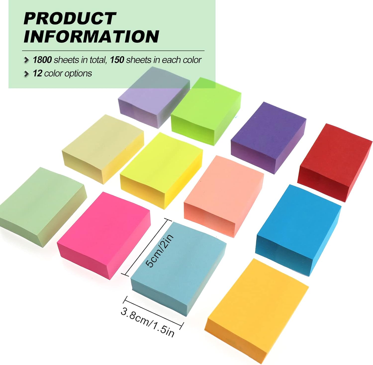Contenuto della confezione: questi foglietti adesivi misurano 50 x 38 mm, 12 blocchi/confezione, 150 fogli/blocco, 12 colori, 1800 fogli in totale. Materiale premium: le note sono realizzate con carta di alta qualità e sono facili da scrivere e riutilizzare. Può essere applicato a lungo senza sbiadire o raggrinzirsi. Comodo da usare: divertenti foglietti adesivi possono attaccarsi bene ovunque. Scrittura fluida, facile da usare e rimuovere senza lasciare residui 12 colori: questi foglietti adesivi sono disponibili in dieci colori: giallo chiaro, giallo, arancione, rosa rossa, verde chiaro, verde, azzurro, blu, viola chiaro, viola. I colori sono brillanti e accattivanti. Ampio utilizzo: adatto a scuole, uffici e case. Ideale per lasciare appunti o promemoria su pareti, porte, frigoriferi, monitor o altre superfici