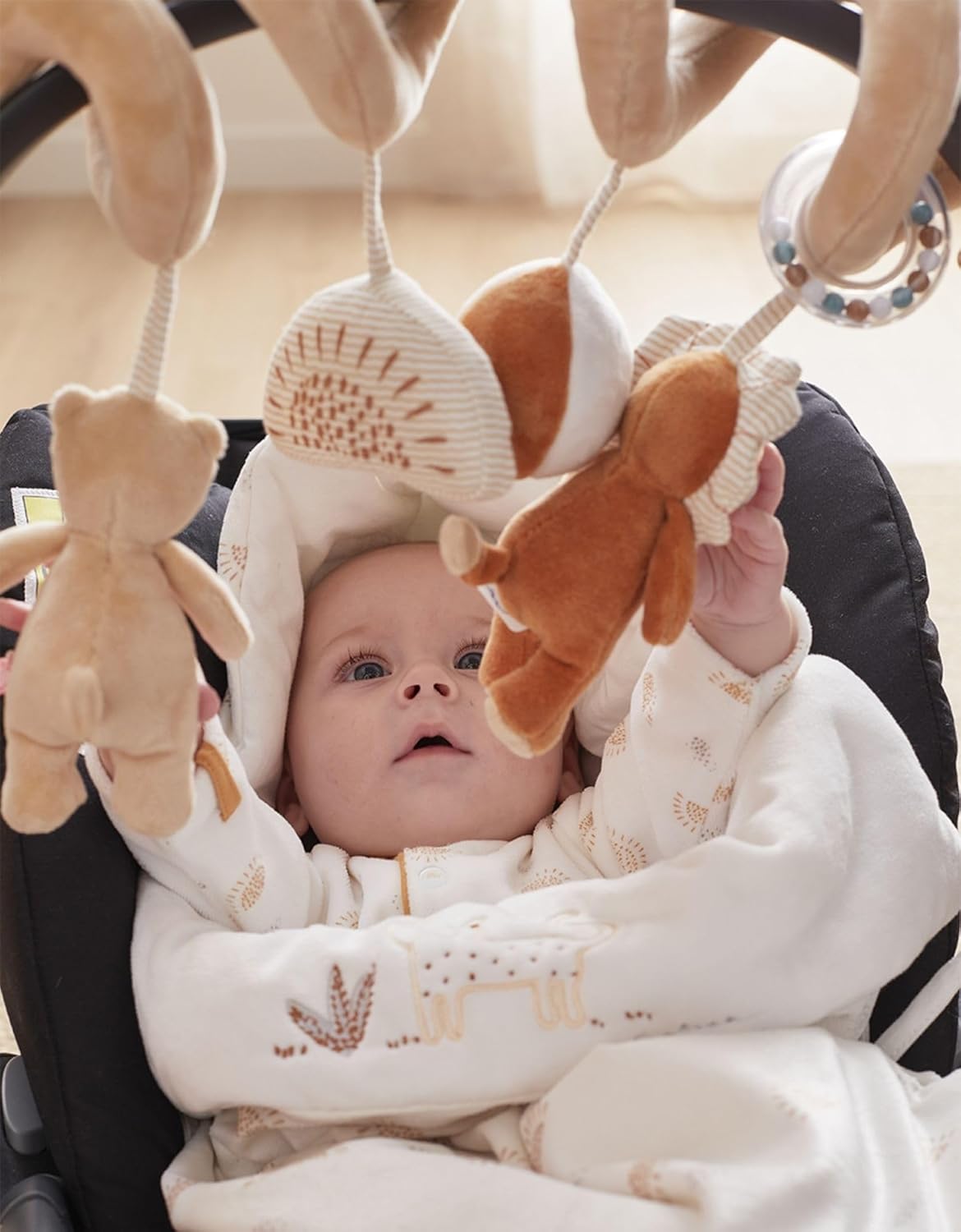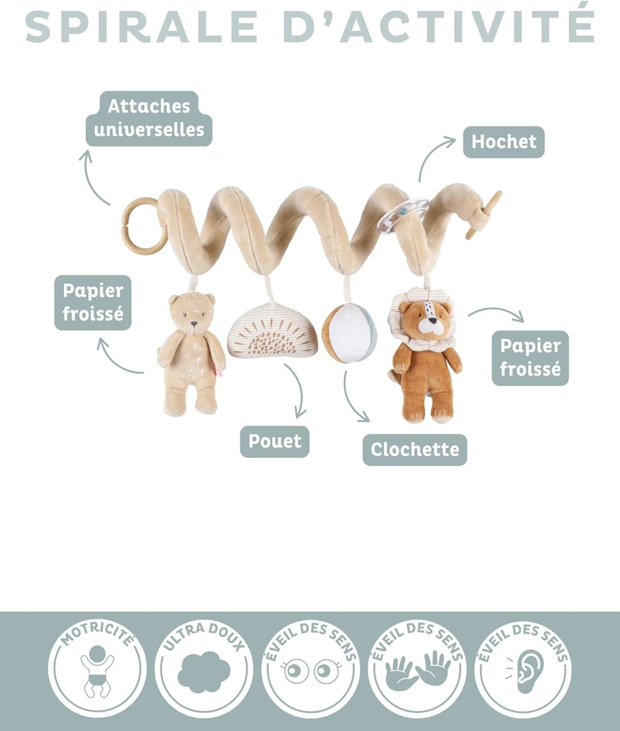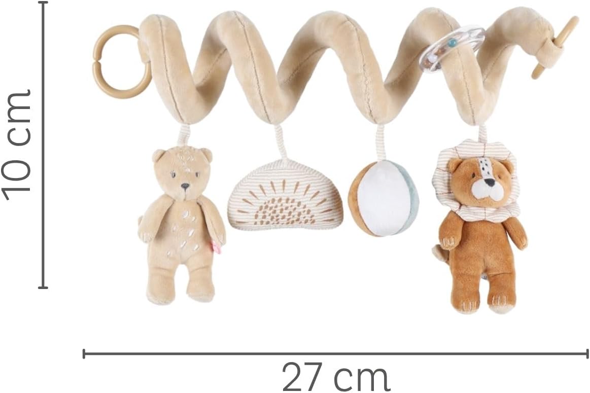 UN GIOCATTOLO CHE FAVORISCE IL RISVEGLIO: Questo gioco di risveglio a spirale è l'ideale per stimolare i sensi del tuo bambino in modo divertente e per intrattenerlo mentre è nel box o durante un viaggio in macchina o nel passeggino. STIMOLA I SENSI: Questo gioco per lo sviluppo del bambino stimola la vista con i suoi bei colori e il suo design carino, il tatto grazie al suo materiale Veloudoux molto morbido e il suono con i suoi sonagli e i suoi peluche pieni di carta stropicciata. AIUTA A LAVORARE SULLE CAPACITÀ MOTORIE FINE: Portando diversi piccoli giocattoli progettati per incuriosire il bambino e incoraggiarlo a catturarli e manipolarli, questa spirale di attività aiuta a sviluppare le capacità motorie fini del bambino. FACILE MANUTENZIONE: Veloudoux è un materiale esclusivo con una sensazione di velluto, creato da Noukies. Realizzato al 100% in poliestere. La spirale è lavabile solo in superficie. UN MARCHIO NATO DALL'AMORE PER I NOSTRI BAMBINI: Da più di 20 anni supportiamo con passione i vostri bambini, dalla nascita fino al loro 8° compleanno. Basandosi sul suo know-how, Noukie’s ha sviluppato prodotti e materiali sostenibili adatti alla loro crescita.