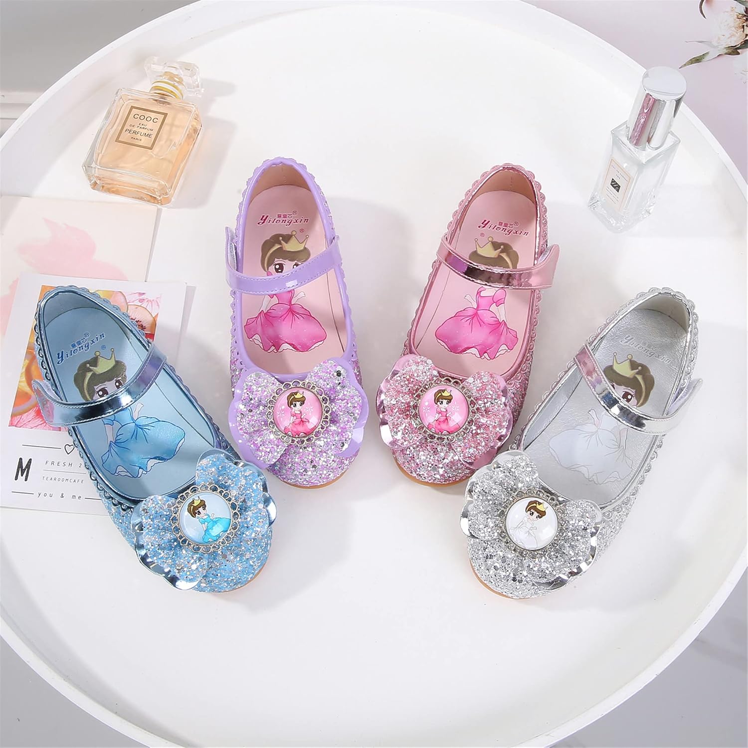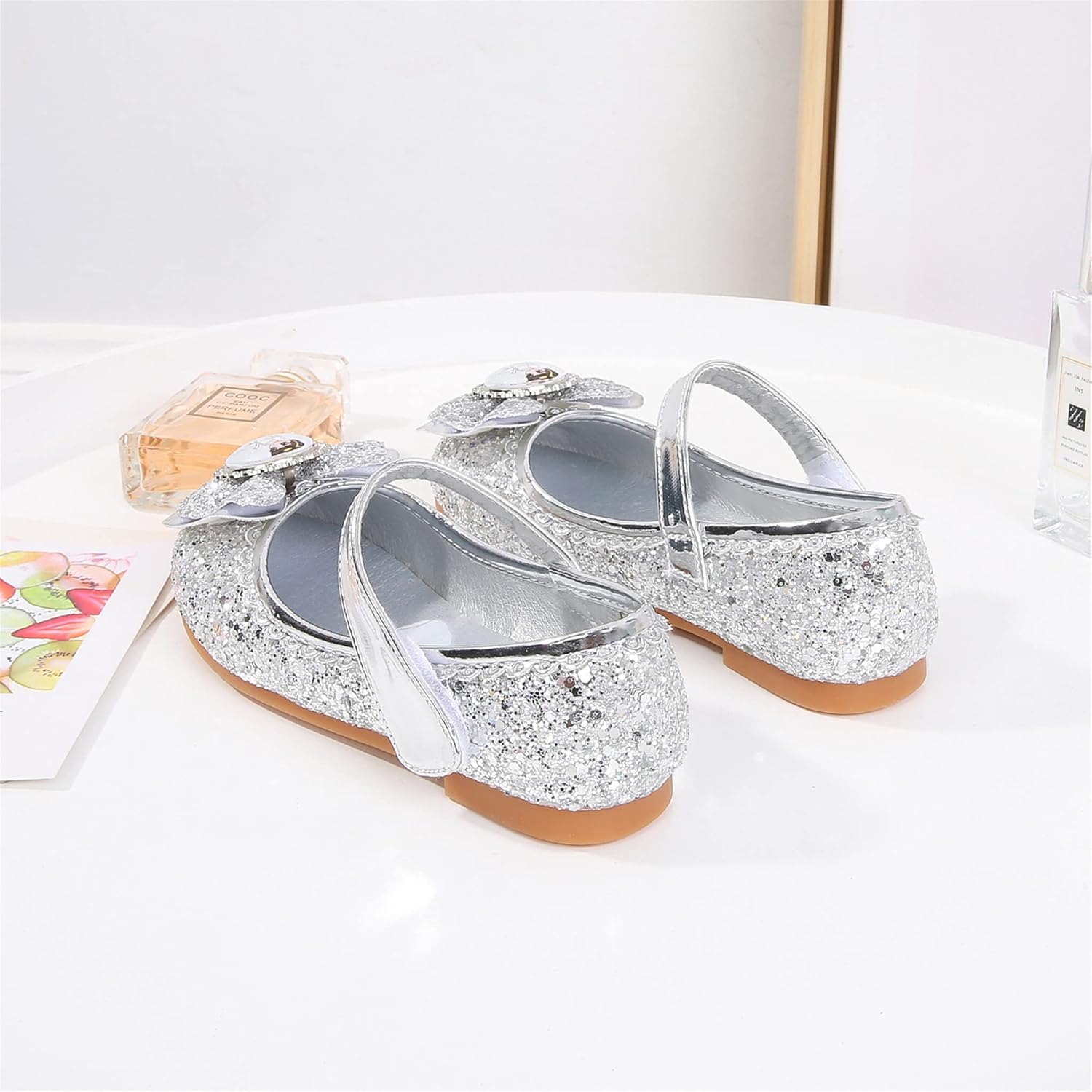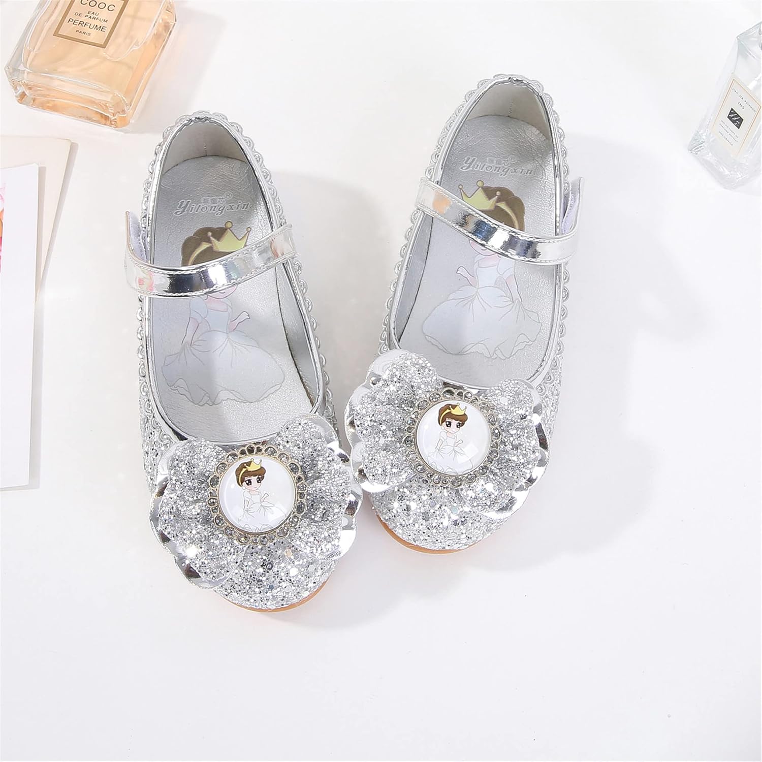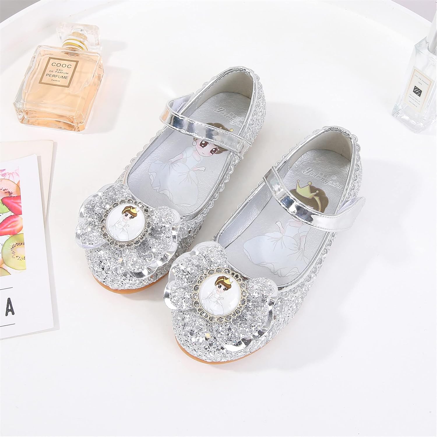 Le scarpette sono arrivate subito con prime, un po' care a mio avviso considerato che si usano solo per feste di carnevale o per casa e sono fatte in Cina. Sono fatte in plastica dentro e fuori e la suola è di gomma. Mia figlia di due anni e mezzo ha 25 di piede, ho controllato la tabella delle taglie e ho acquistato il 25 che fortunatamente calza perfettamente. Le scarpe non perdono brillantini e sono molto carine esteticamente.