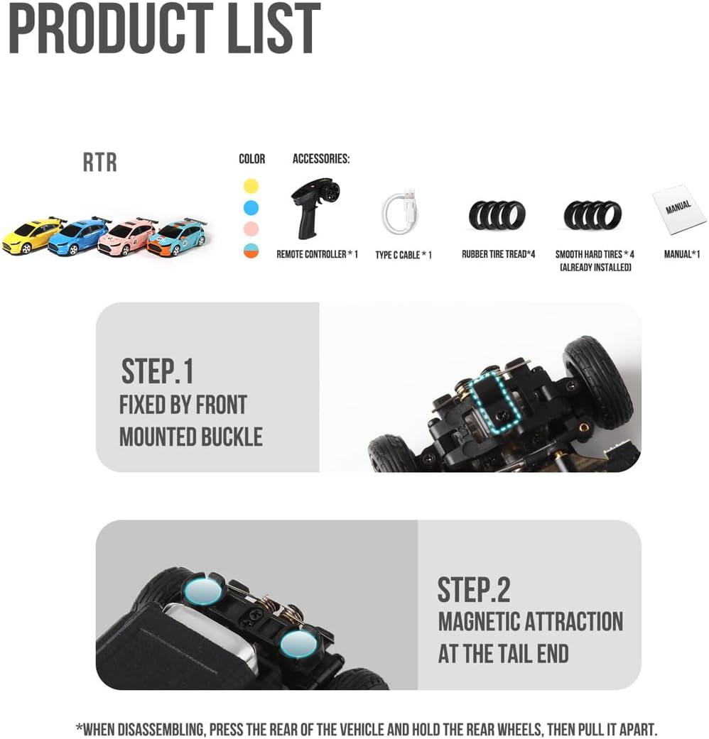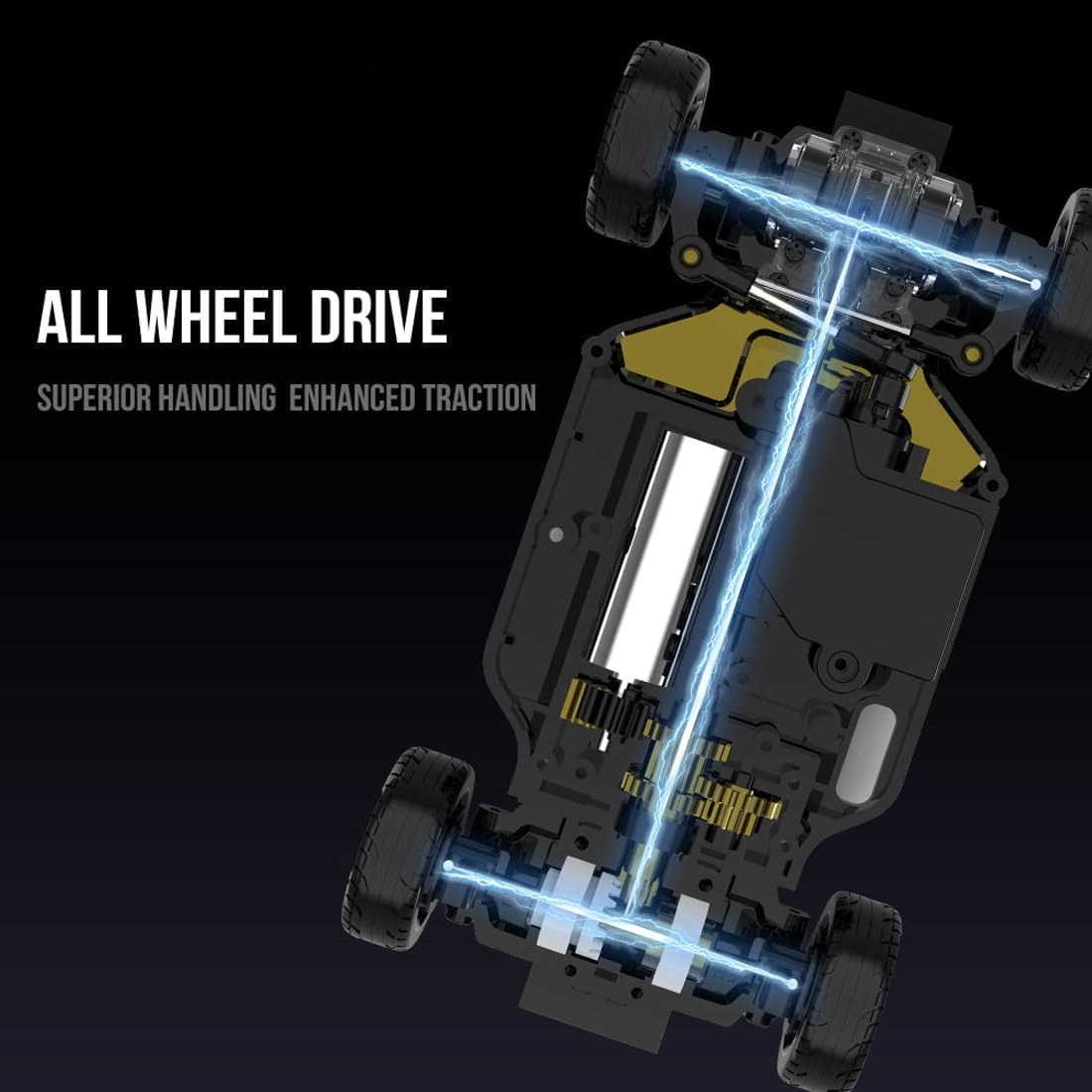 Modalità mini drifting e corsa: design compatto da 11,6 × 5,3 × 3,7 cm con sterzo a pieno titolo, che consente di passare senza problemi tra modalità corsa e deriva per un'esperienza di guida dinamica e reattiva. ✅ 【Illuminazione a LED realistica】: con fari, indicatori di direzione, luci dei freni, luci di retromarcia e illuminazione ambientale multicolore che aumenta il realismo e rende la guida più intensa di notte. Prestazioni ad alte prestazioni: dotato di un sistema a motore centrale 4WD e di una batteria al litio da 15.500 mAh che offre fino a 25 minuti di riproduzione (15 minuti in modalità FPV) per un divertimento prolungato senza ricarica frequente. Controllo preciso da 2,4 G: il telecomando ergonomico con leva dell'acceleratore e sterzo proporzionali garantisce una maneggevolezza fluida e precisa e offre un'eccellente manovrabilità durante la deriva e la corsa. Sospensione avanzata: la sospensione indipendente a doppio braccio trasversale imita il movimento di una vera auto, mentre il sistema di fibbia anteriore e guscio magnetico posteriore consentono uno smontaggio e una regolazione rapidi senza attrezzi.